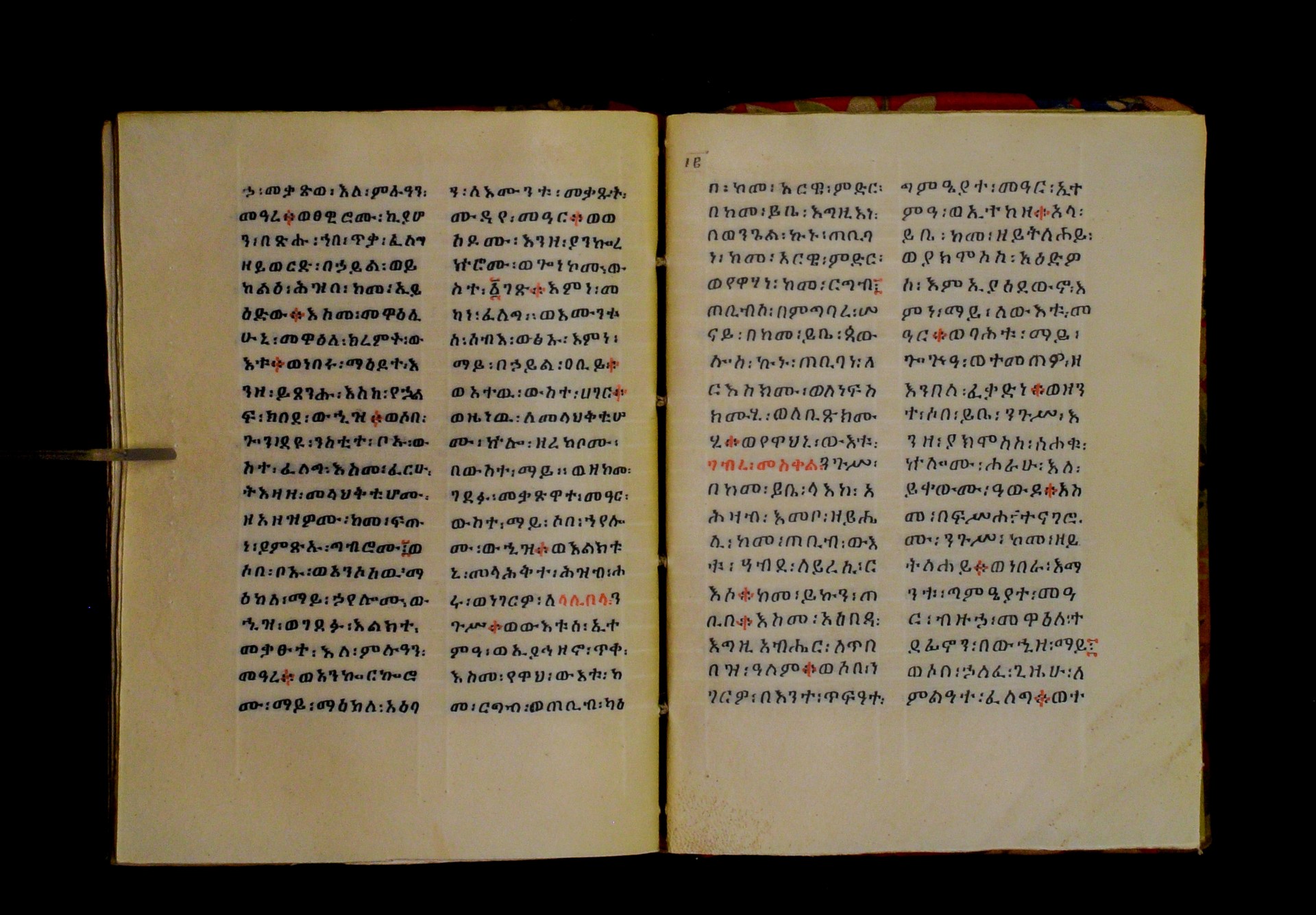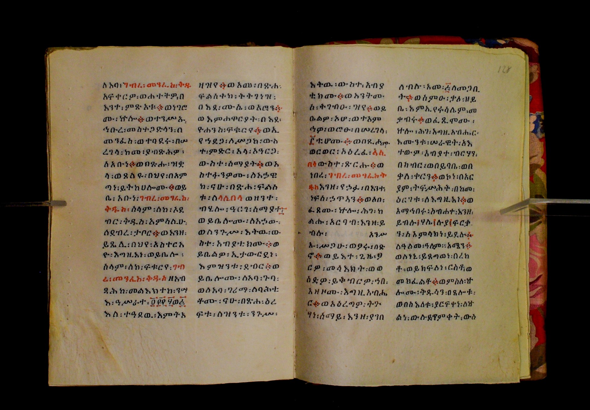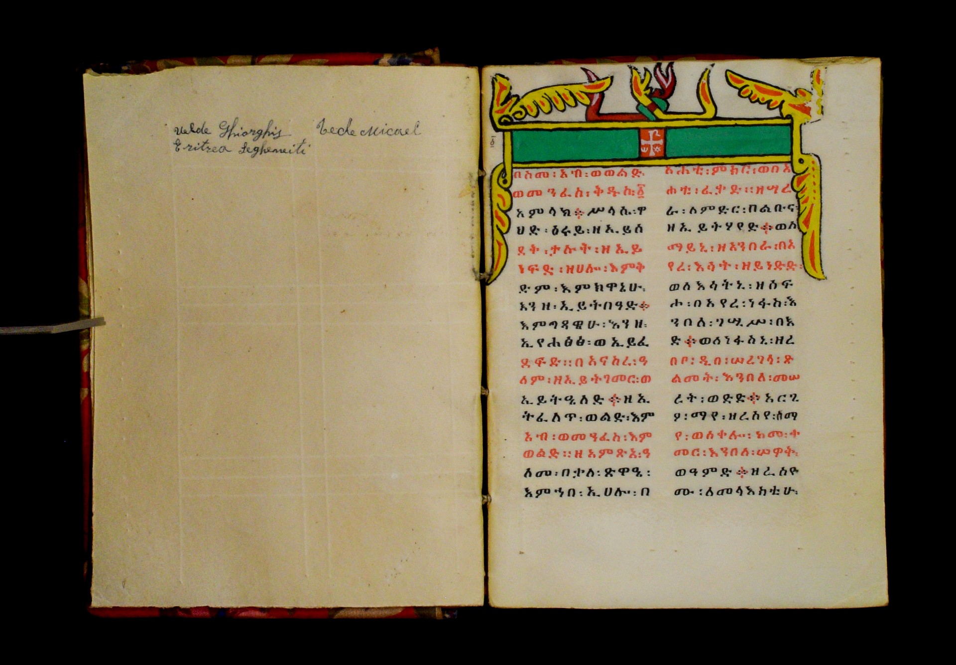 F. 128vb: “ዝንቱ፡ መጽሐፍ፡ ተጽሐፈ፡ በ፲፻ወ፱፻፴ወ፪ዓመተ፡ ምሕረት፡ በዘመነ፡ ዮሐንስ፡ በወርኃ፡ ታኅሣስ፡ በራብዓይ፡ ዓመተ፡ መንግ[ሥ]ቱ፡ ለአማኑኤል፡ ንጉሠ፡ ሮማ፡ ወኢትዮጵያ፡ discritto: Alaca Uolde Ghiorghis Lalibela. The colophon states that the manuscript was completed on Taḫśaś 1932 Year of Mercy, i.e. between December 1939 and January 1940, in the fourth year of Amanuʾel (Victor Emmanuel III), Emperor of Rome and Ethiopia. The colophon also mentions the name of the scribe in Latin script. |