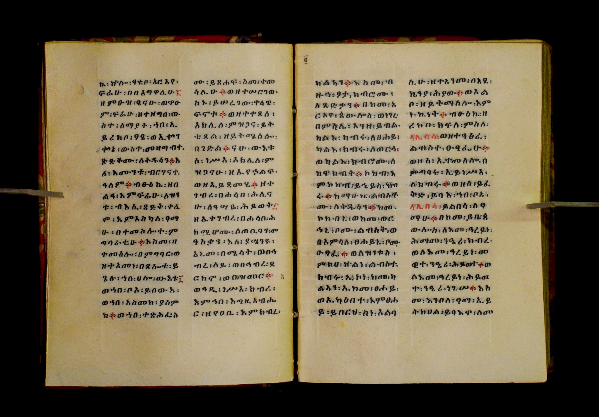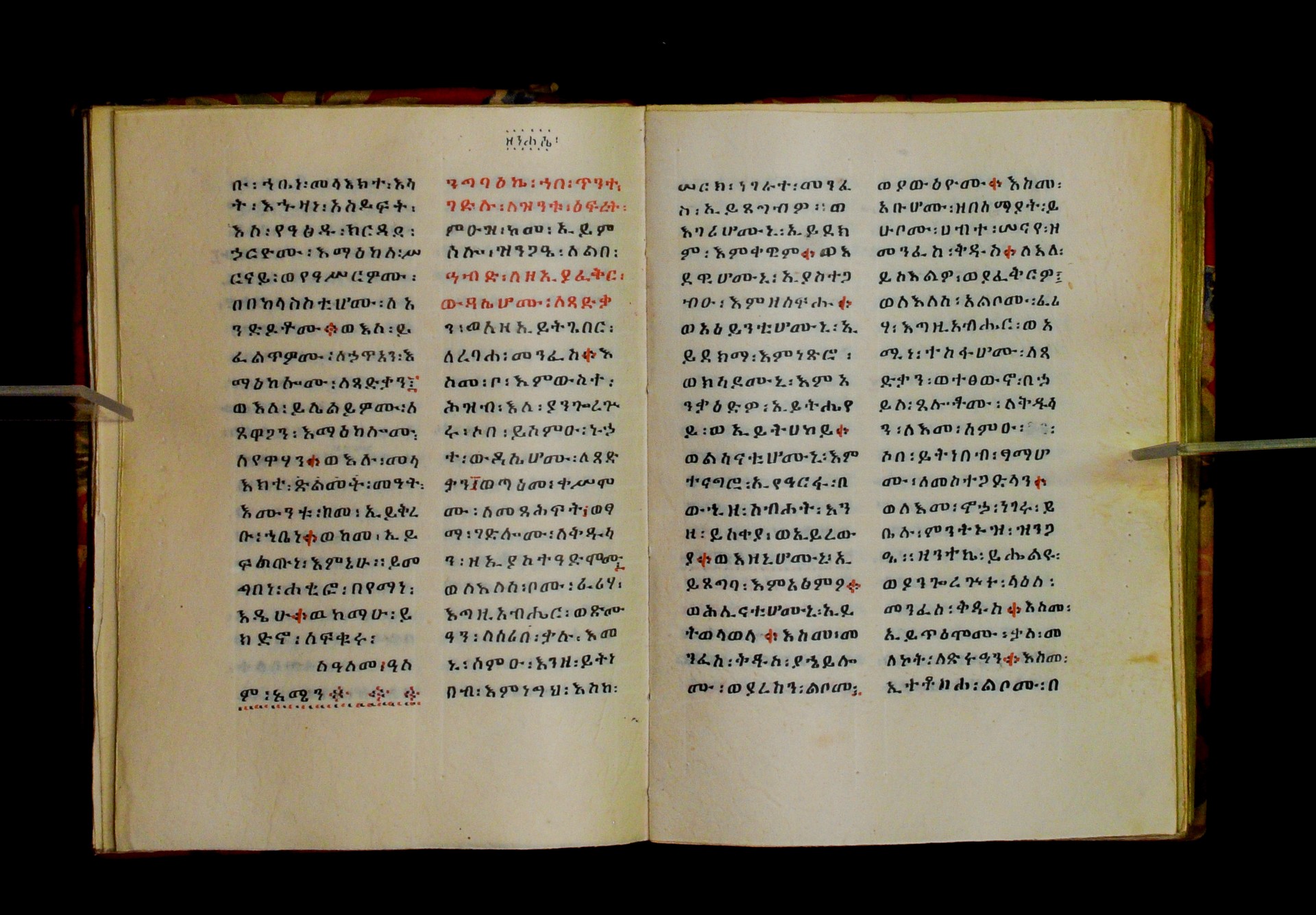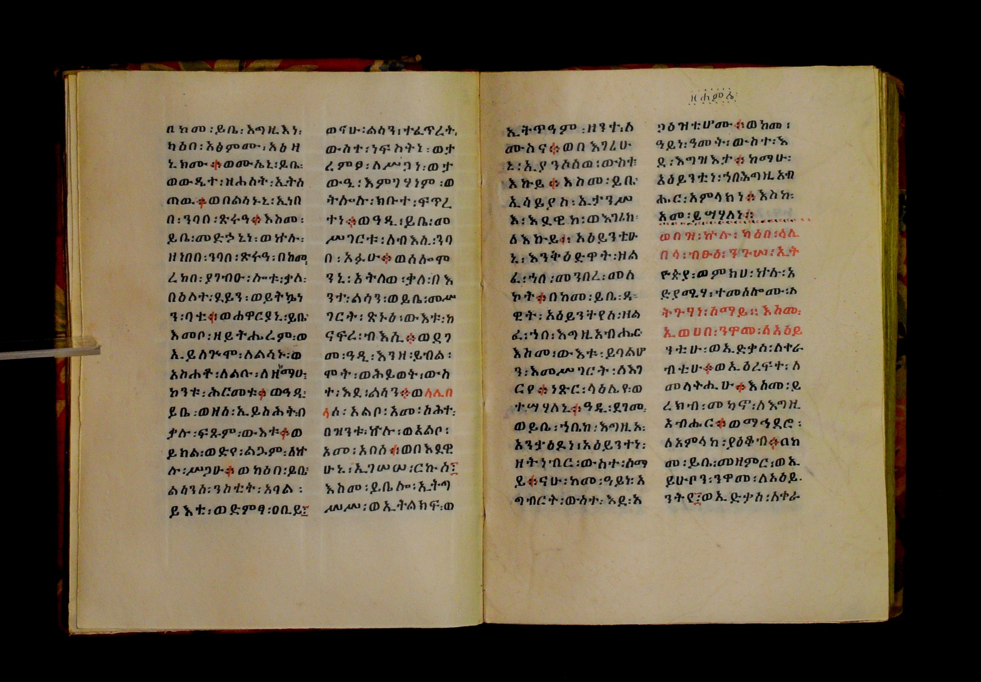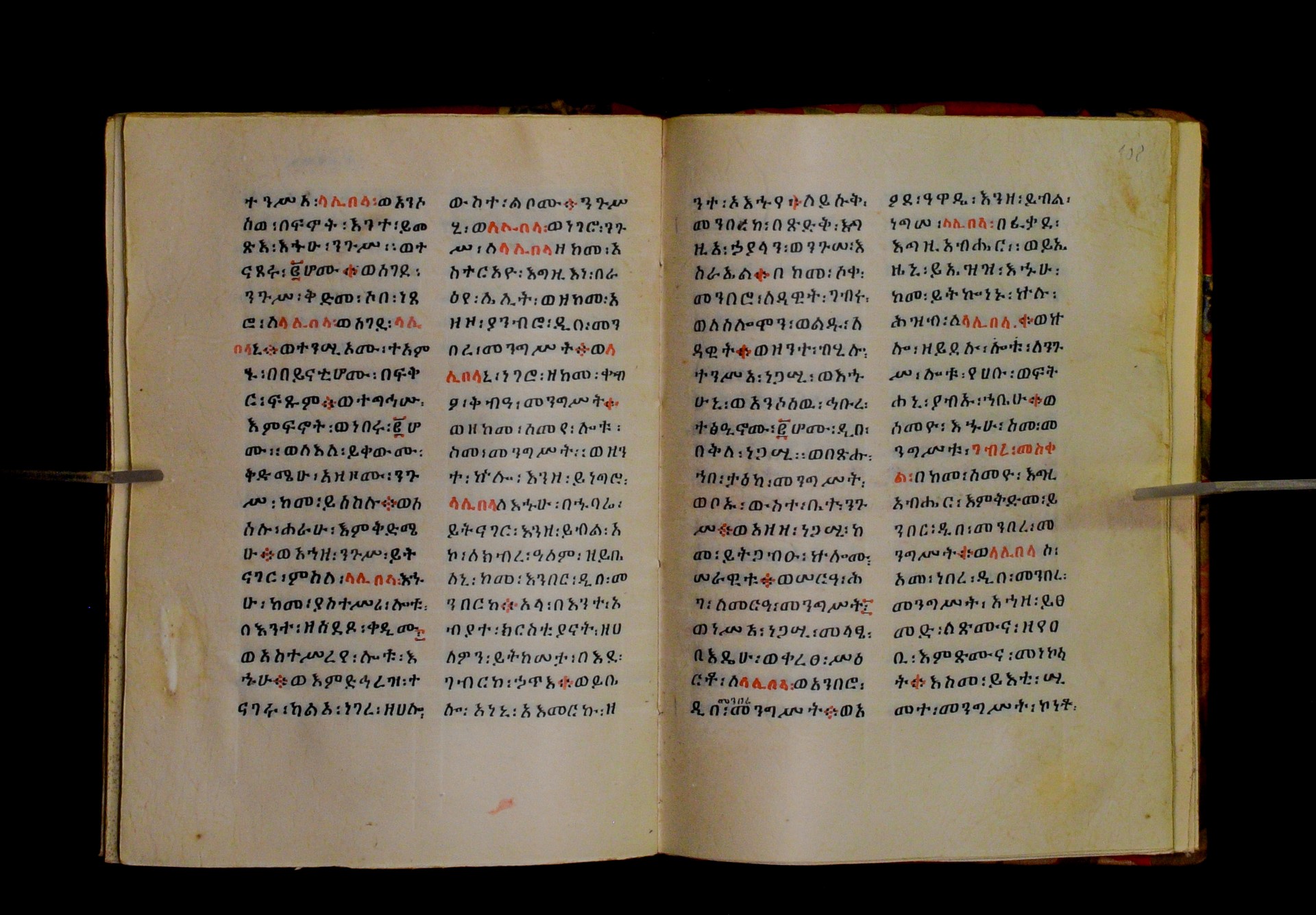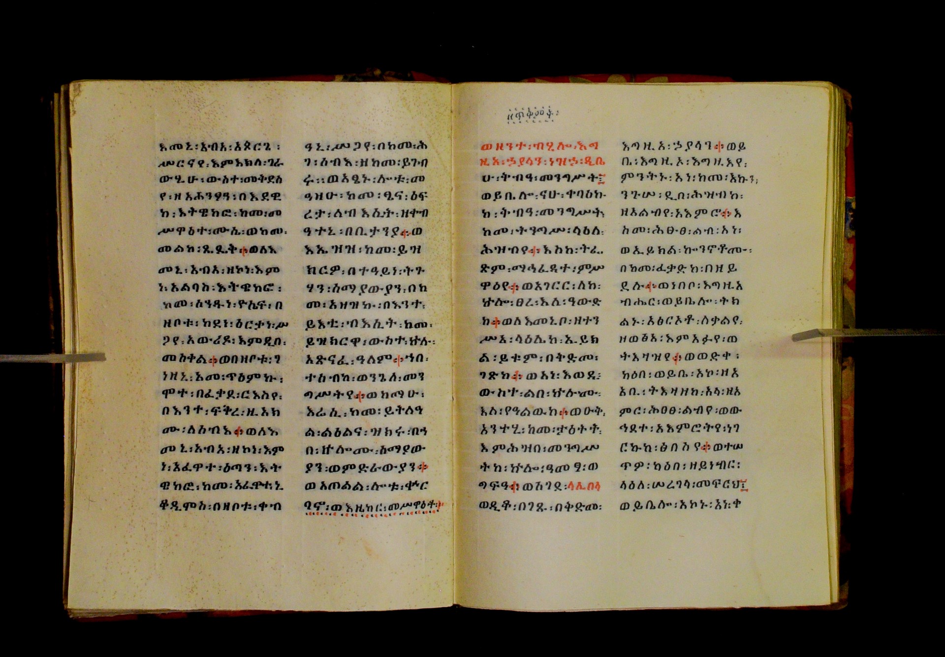 Indicated in black and red ink on the upper margin of the first folio of each quire: ff. 1r (፩,), 11r (፪), 21r (፫), 31r (፬), 41r (፭), 51r (፮), 61r (፯), 71r (፰), 81r (፱), 91r (፲), 101r (፲፩,), 111r (፲፪), 121r (፲፫). |
