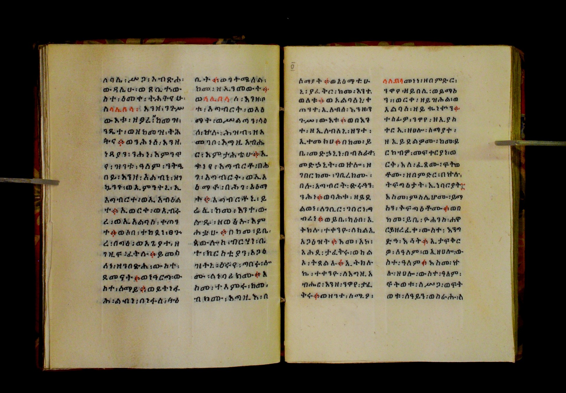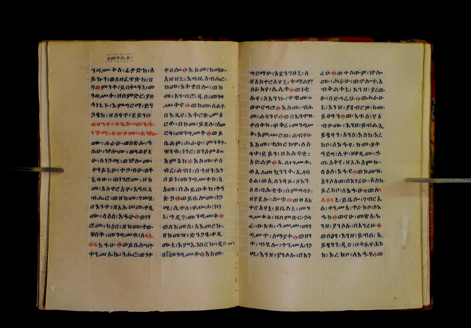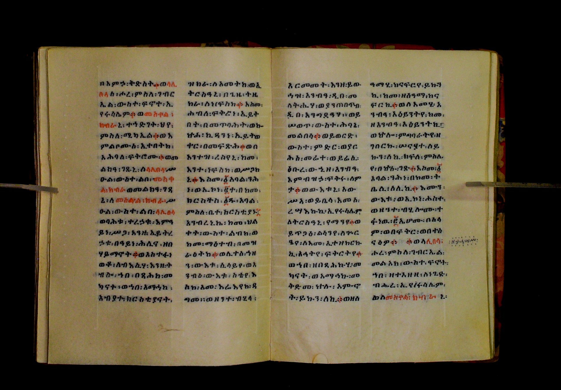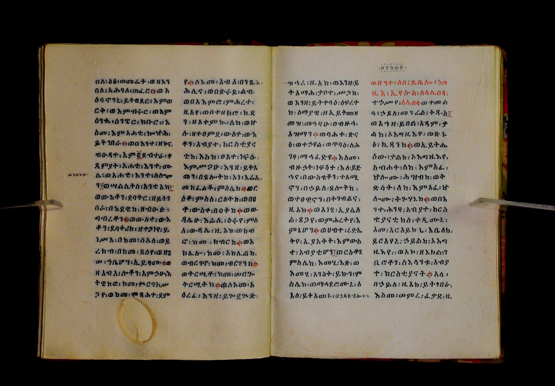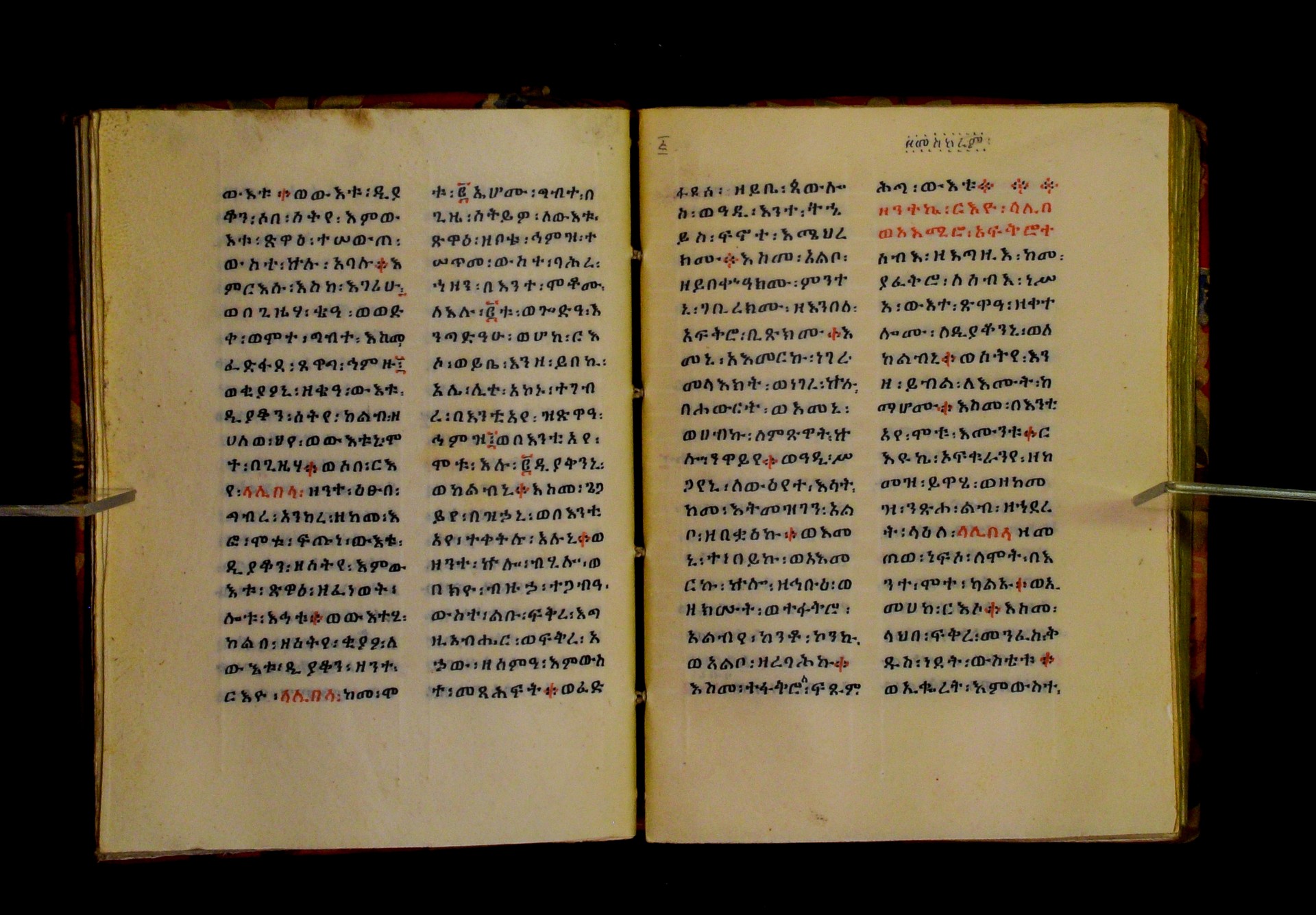 Indicated in black and red ink on the upper margin of the first folio of each quire: ff. 1r (፩,), 11r (፪), 21r (፫), 31r (፬), 41r (፭), 51r (፮), 61r (፯), 71r (፰), 81r (፱), 91r (፲), 101r (፲፩,), 111r (፲፪), 121r (፲፫). |