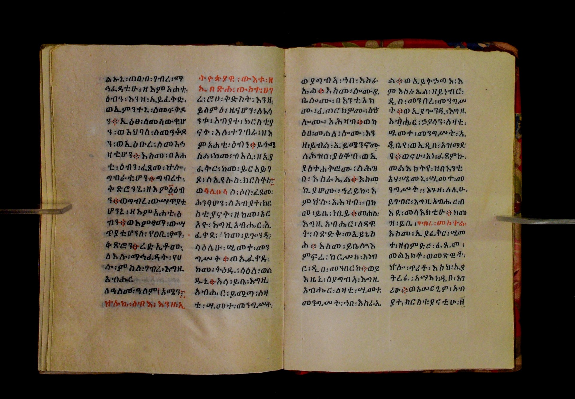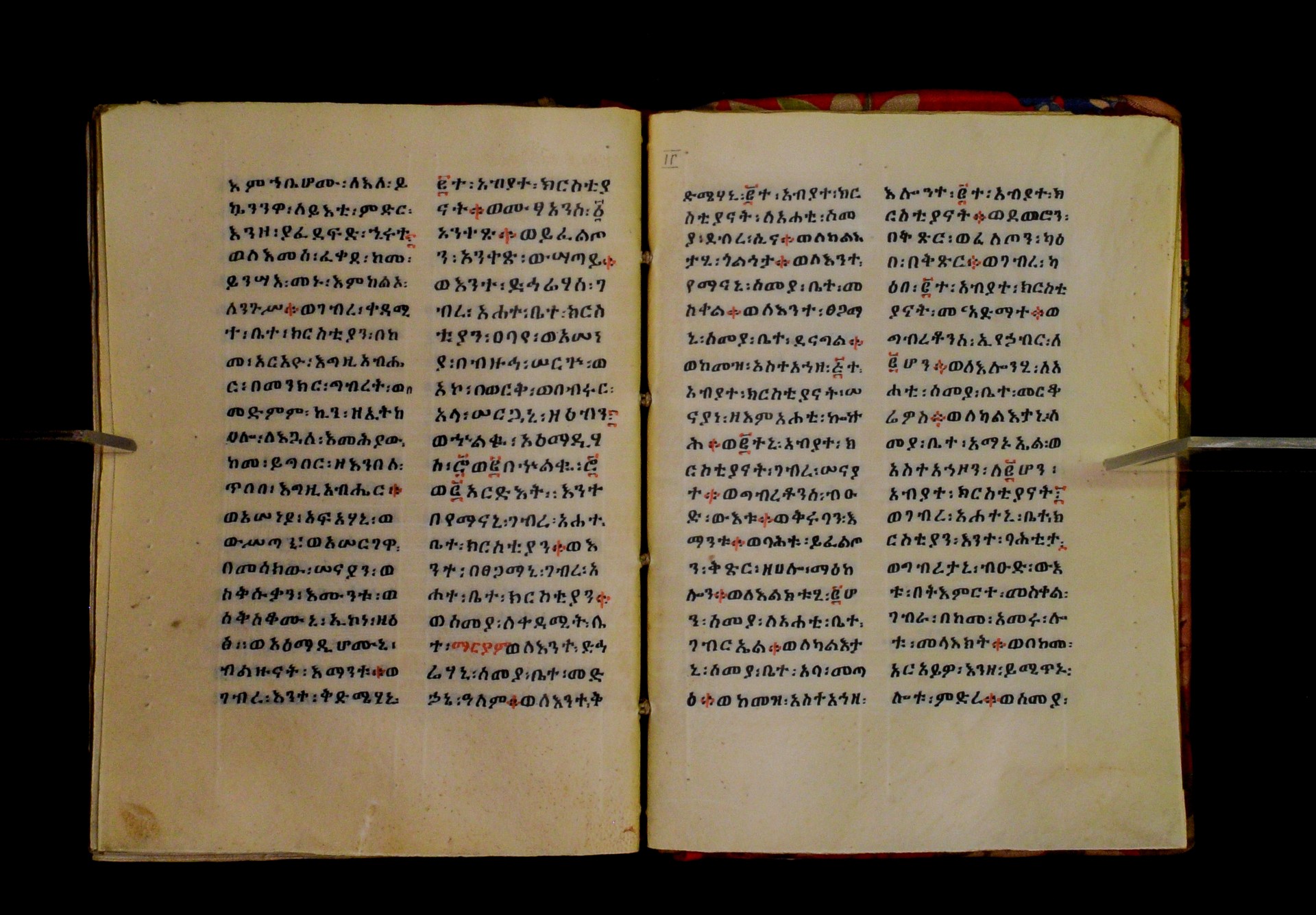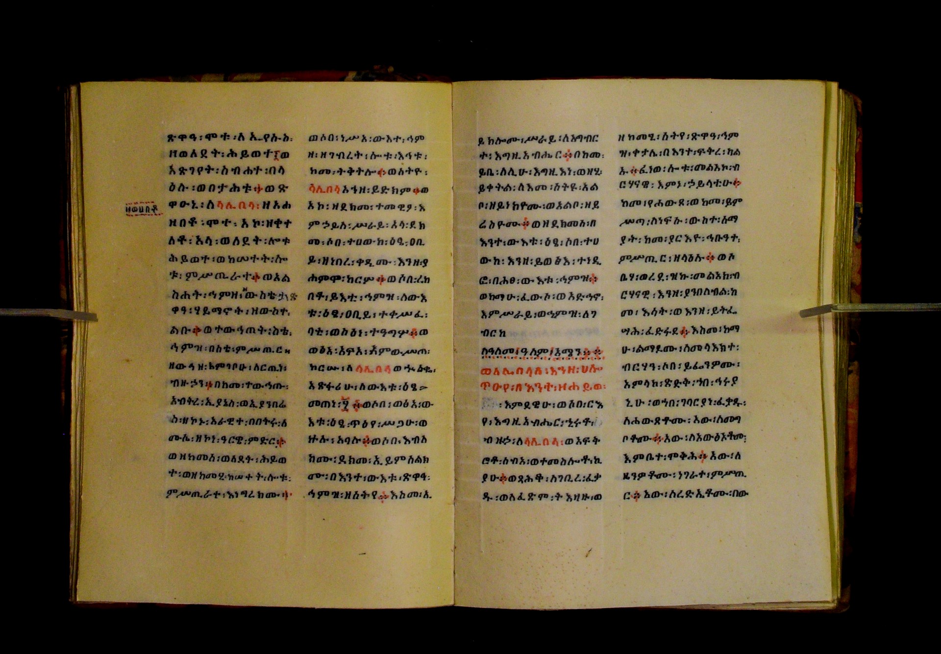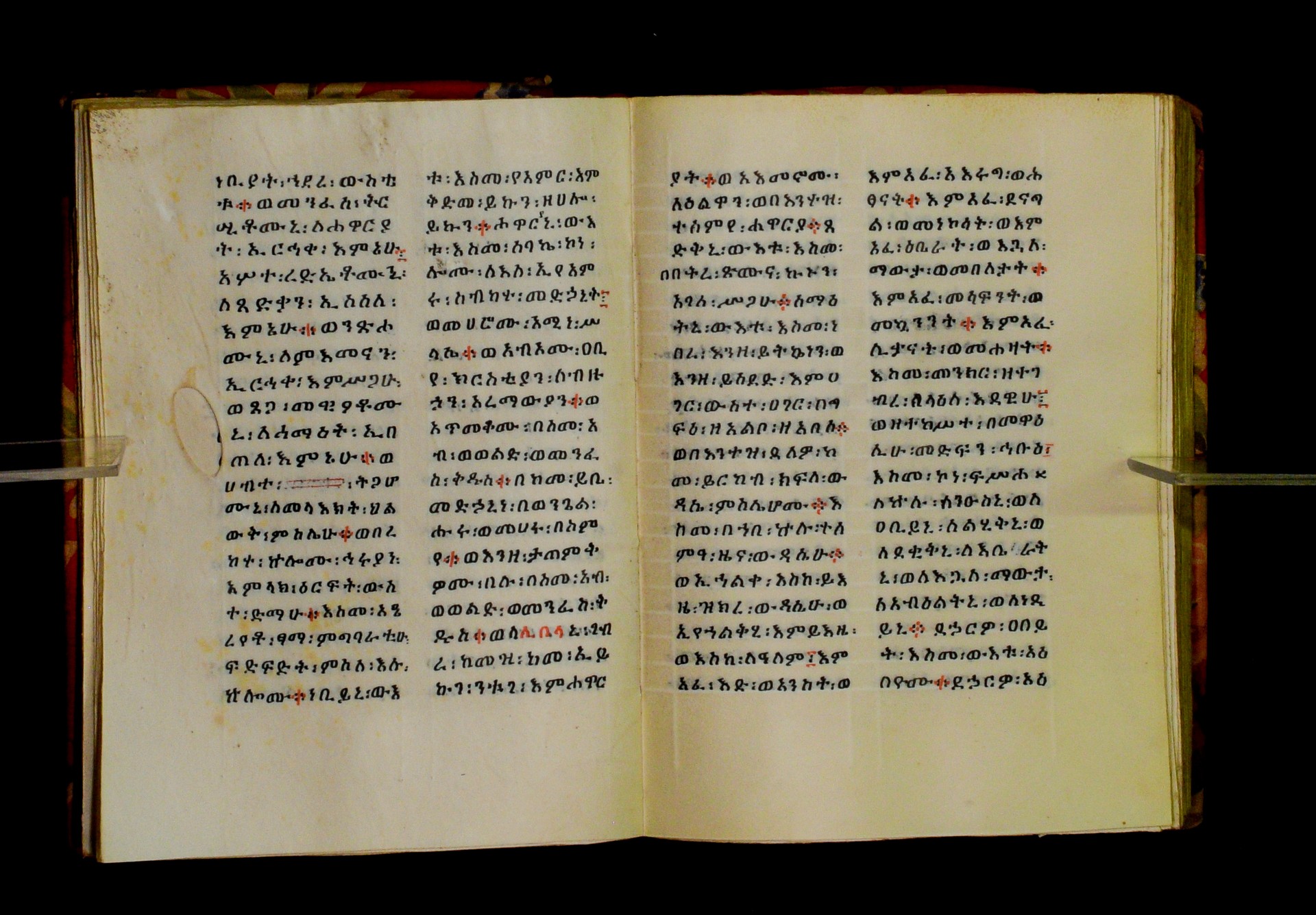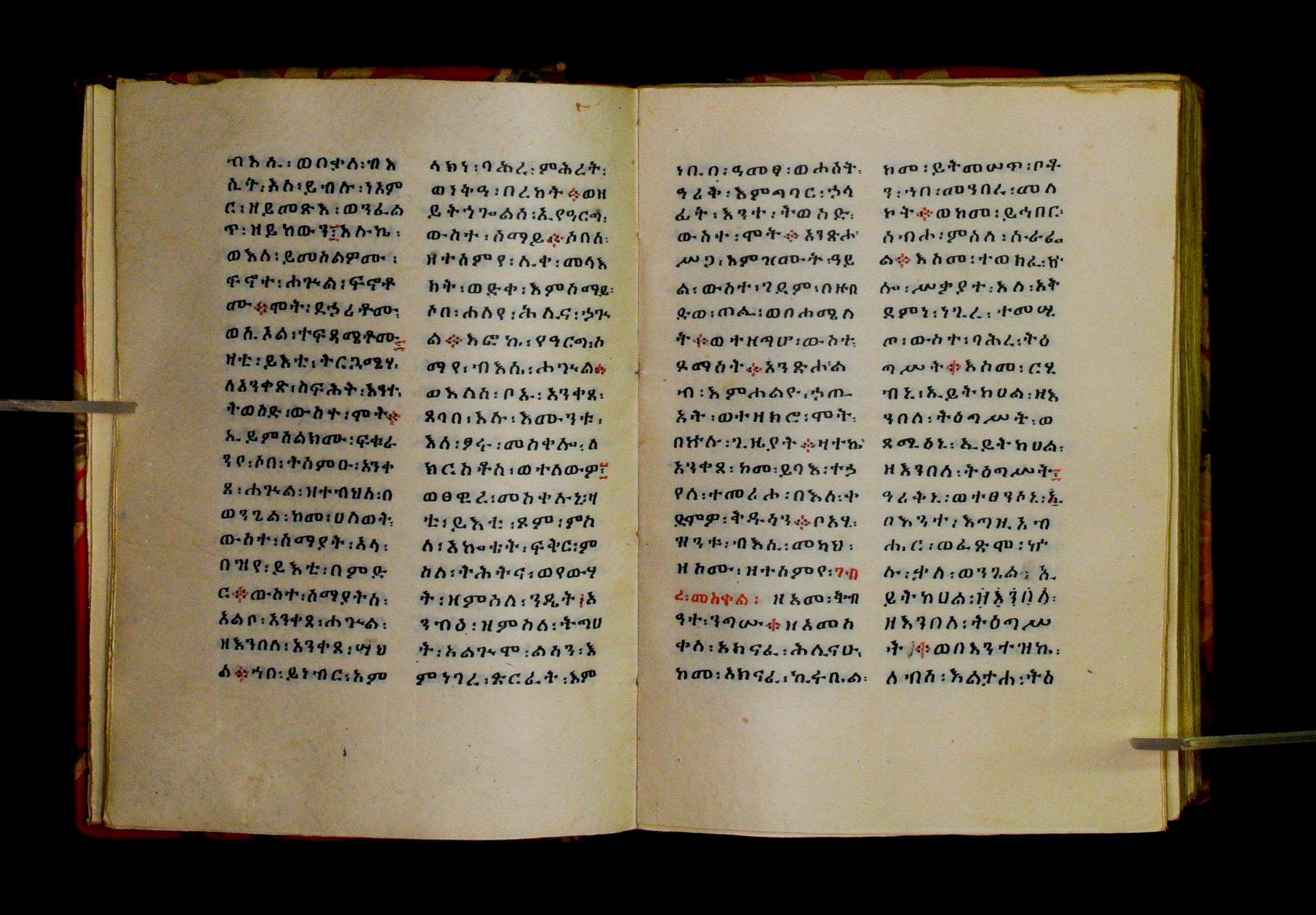 Indicated in black and red ink on the upper margin of the first folio of each quire: ff. 1r (፩,), 11r (፪), 21r (፫), 31r (፬), 41r (፭), 51r (፮), 61r (፯), 71r (፰), 81r (፱), 91r (፲), 101r (፲፩,), 111r (፲፪), 121r (፲፫). |