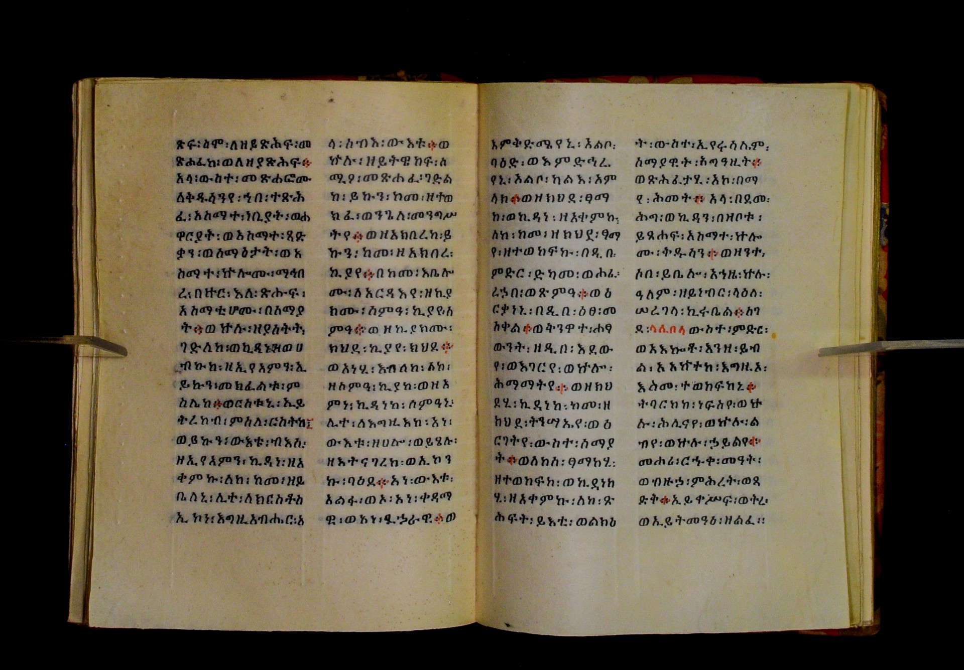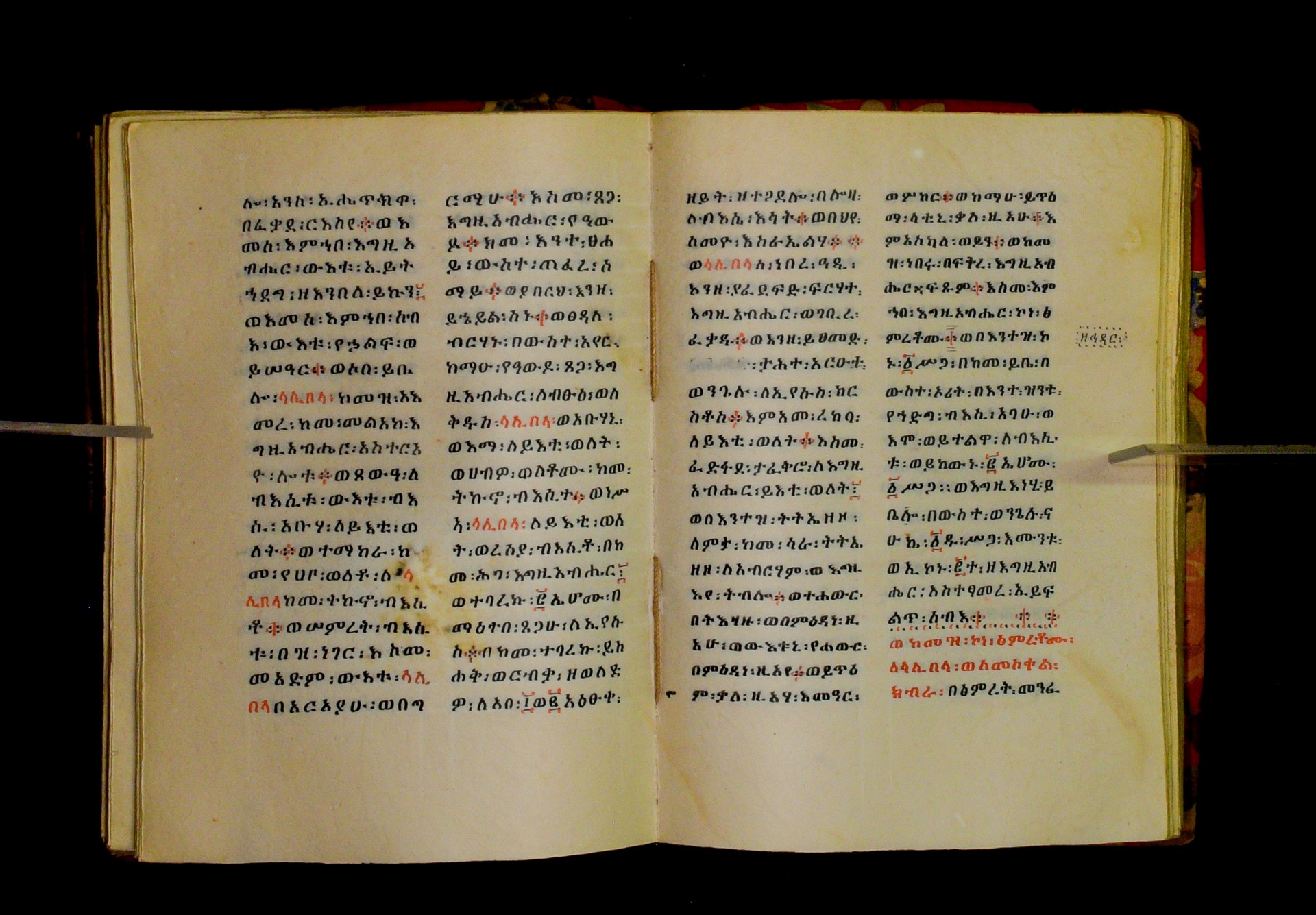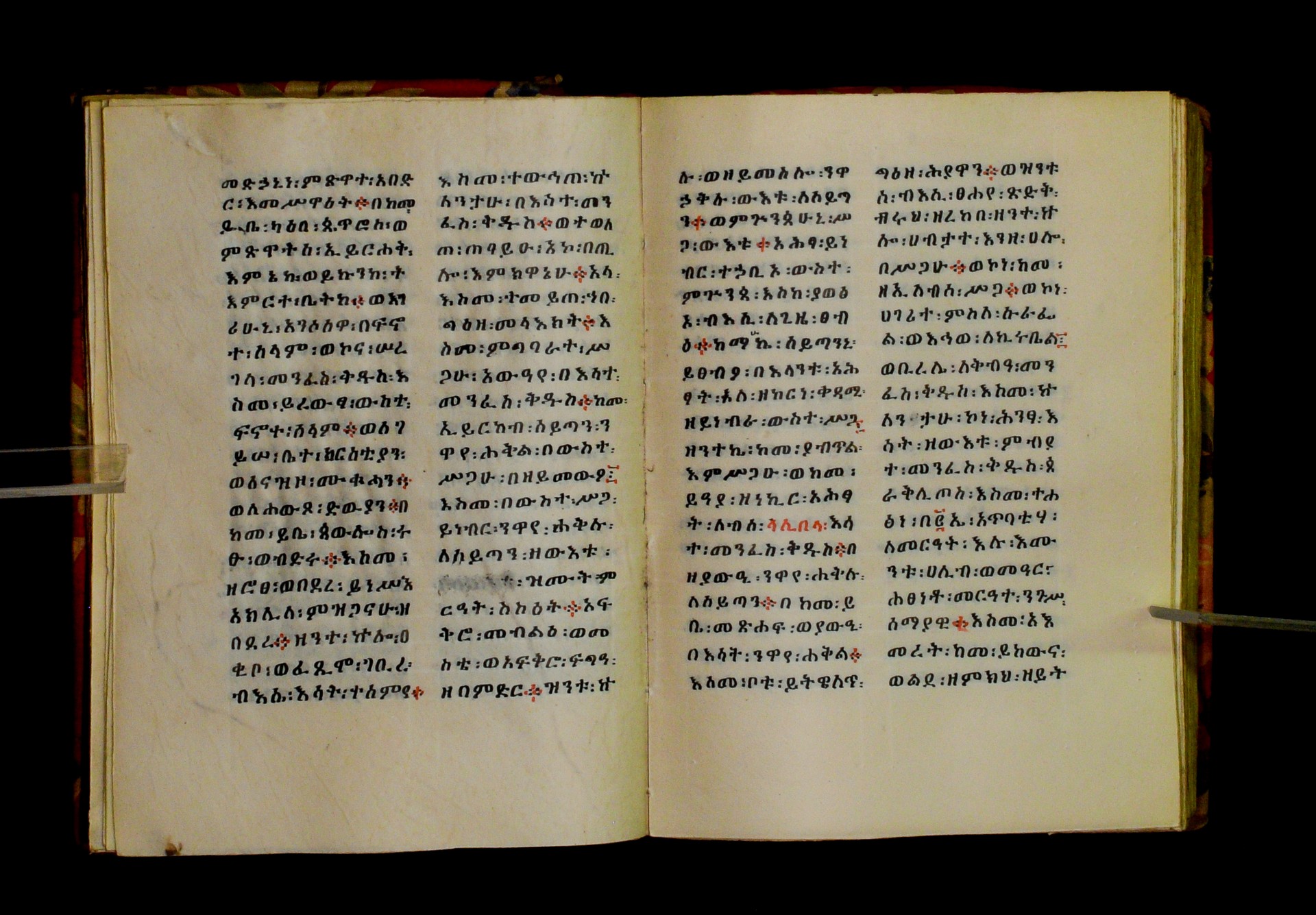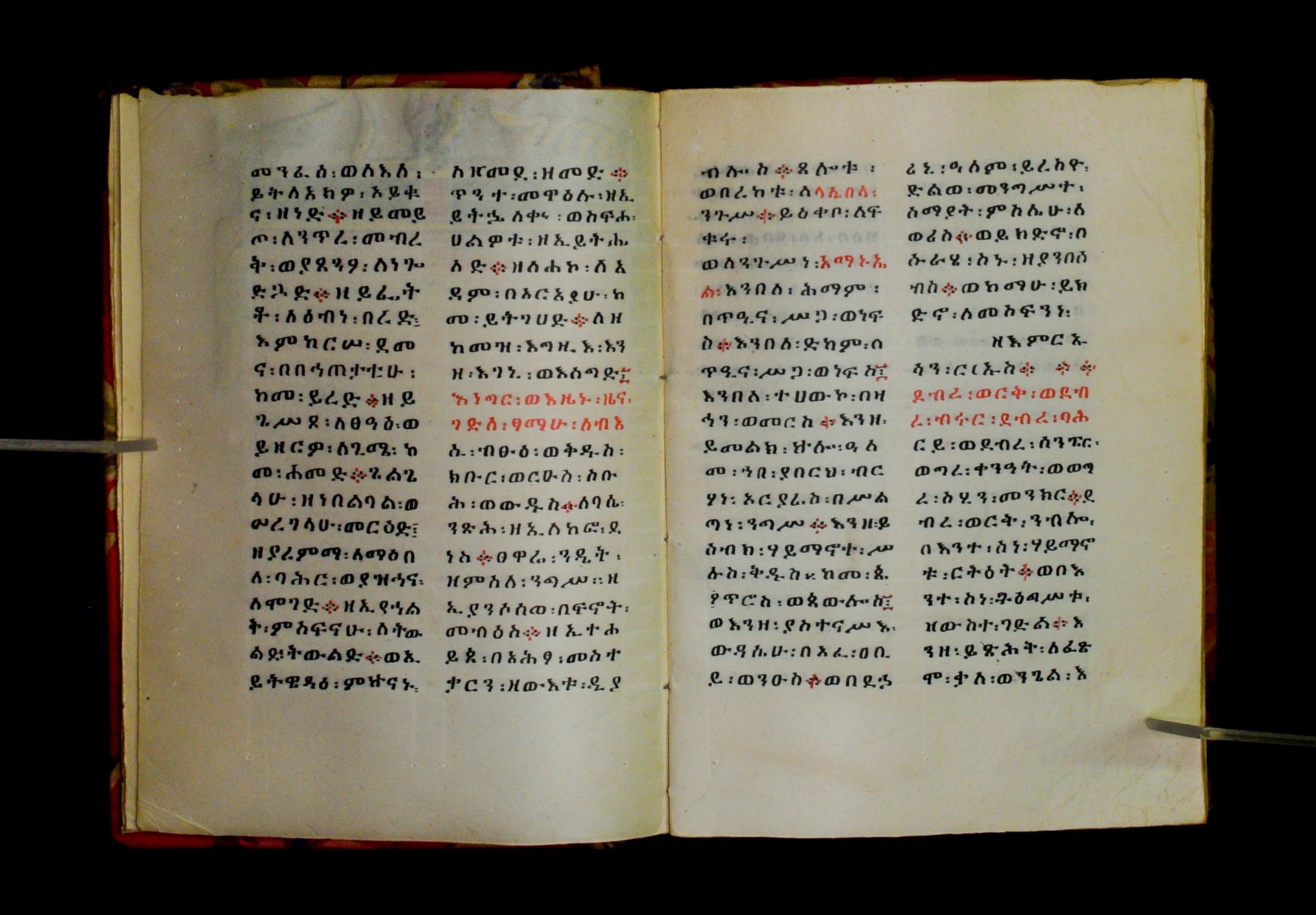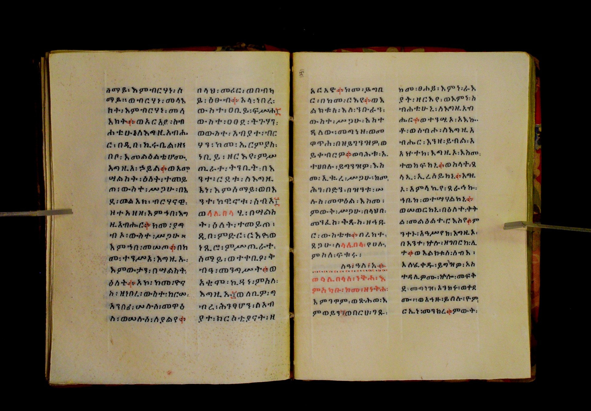 Indicated in black and red ink on the upper margin of the first folio of each quire: ff. 1r (፩,), 11r (፪), 21r (፫), 31r (፬), 41r (፭), 51r (፮), 61r (፯), 71r (፰), 81r (፱), 91r (፲), 101r (፲፩,), 111r (፲፪), 121r (፲፫). |
