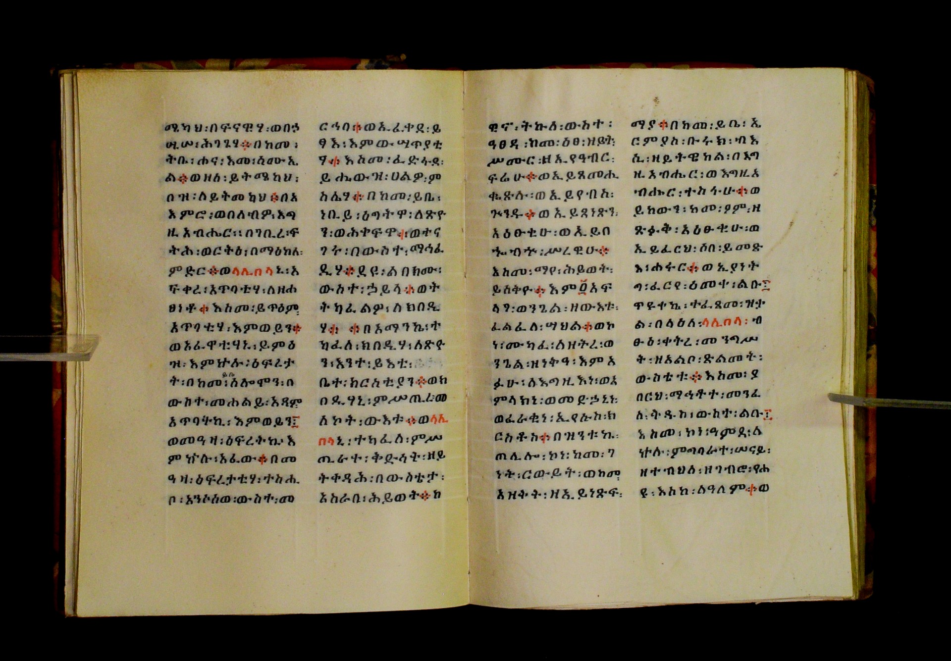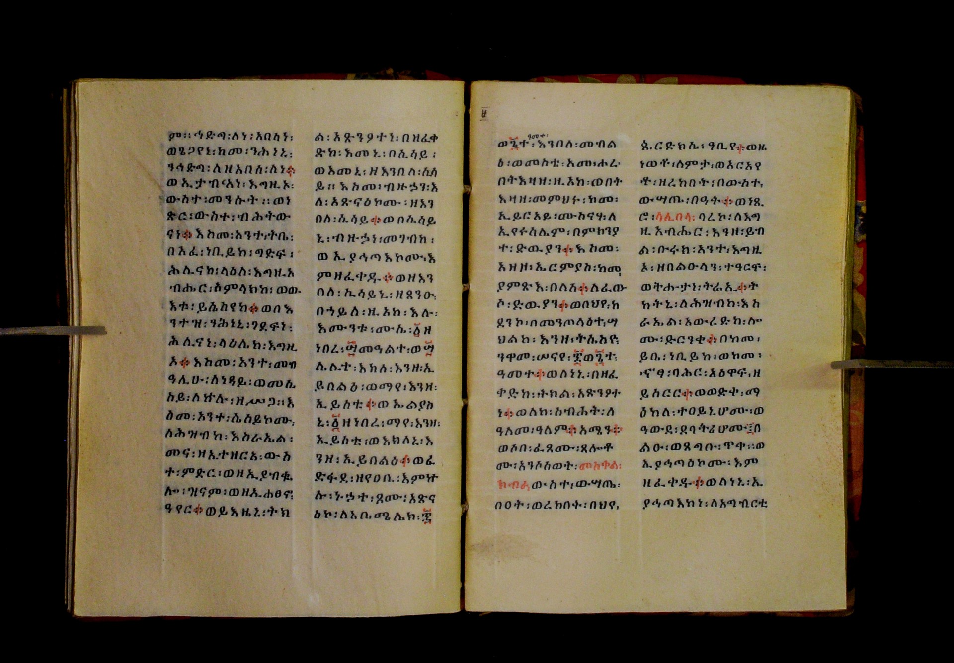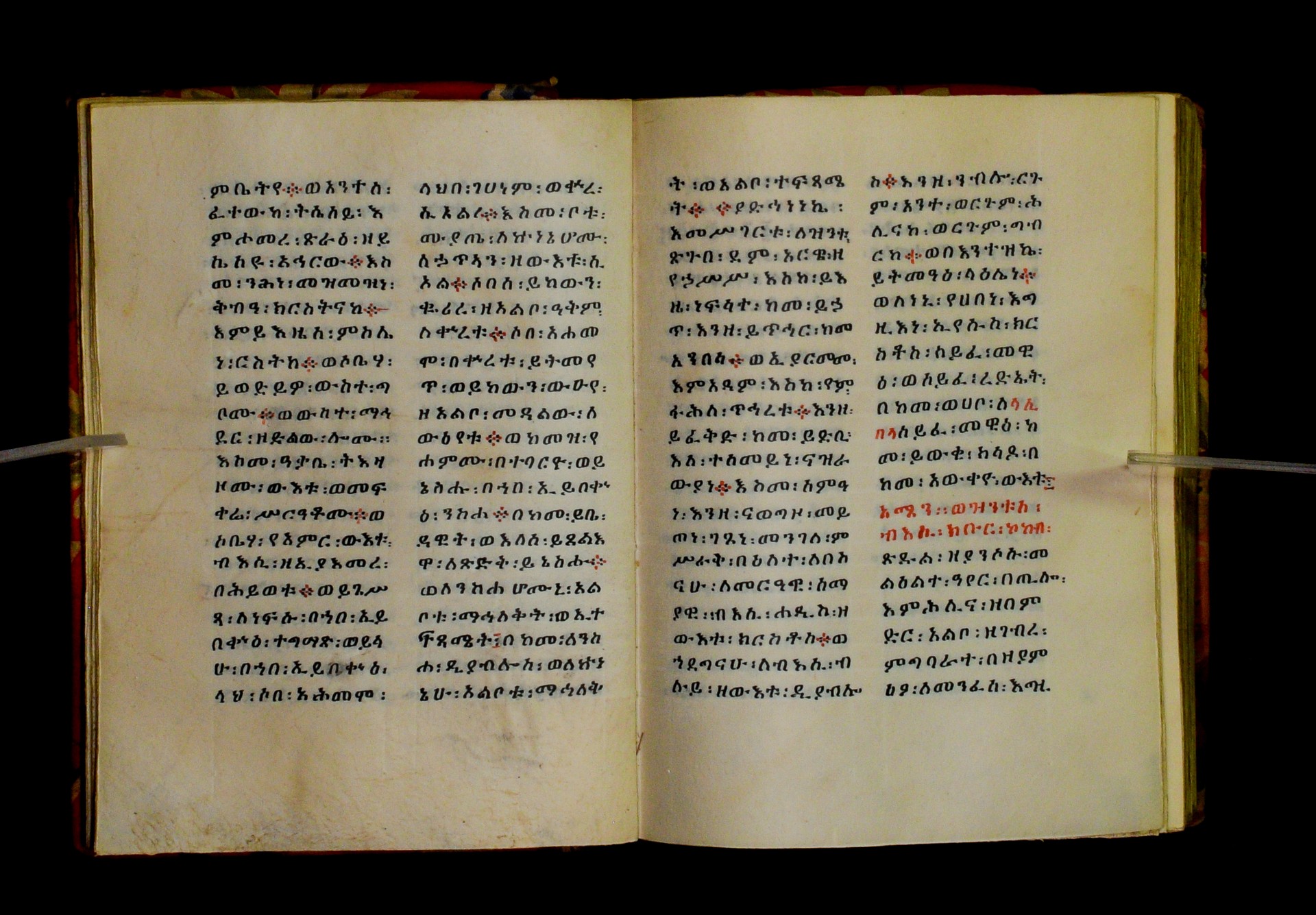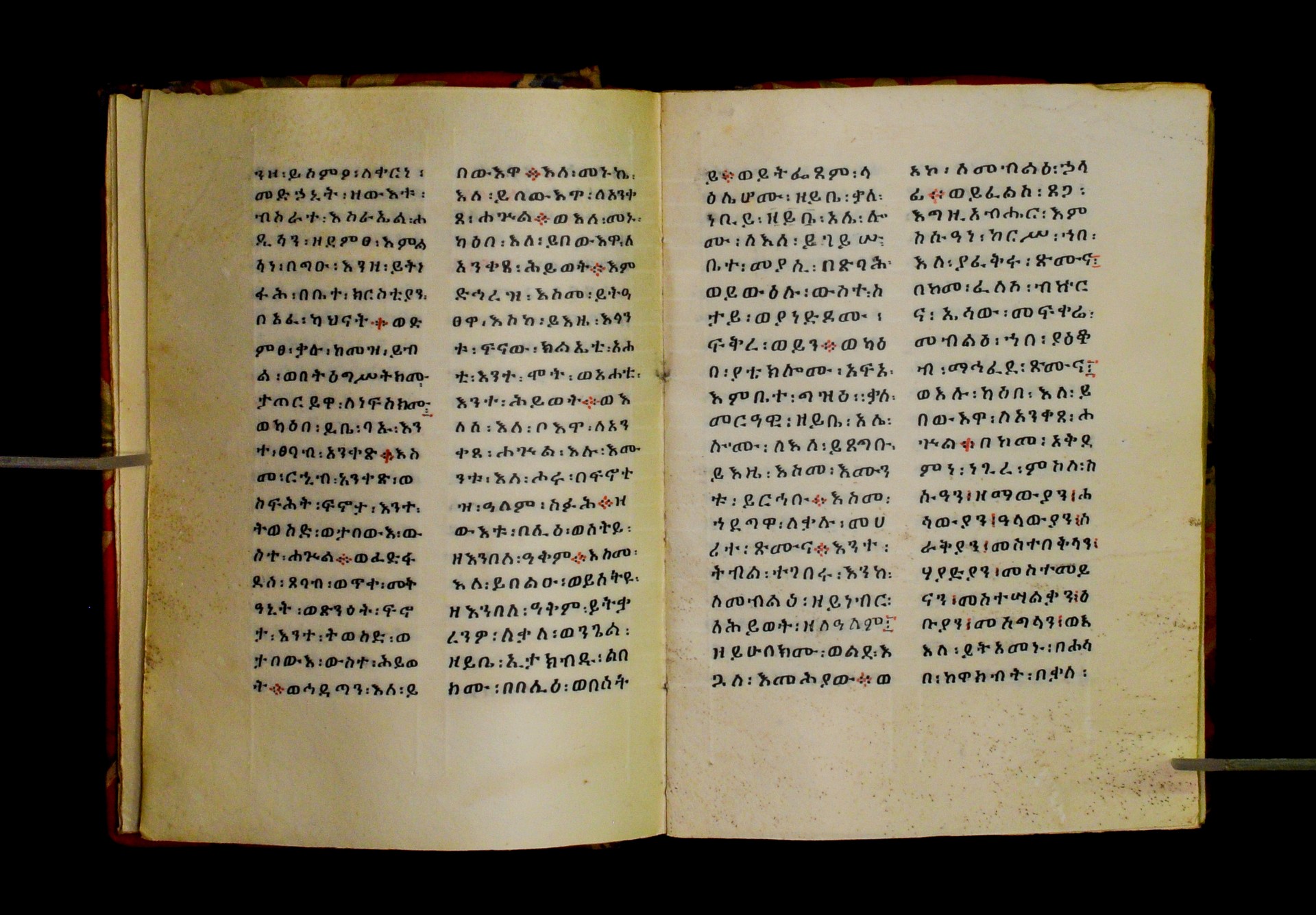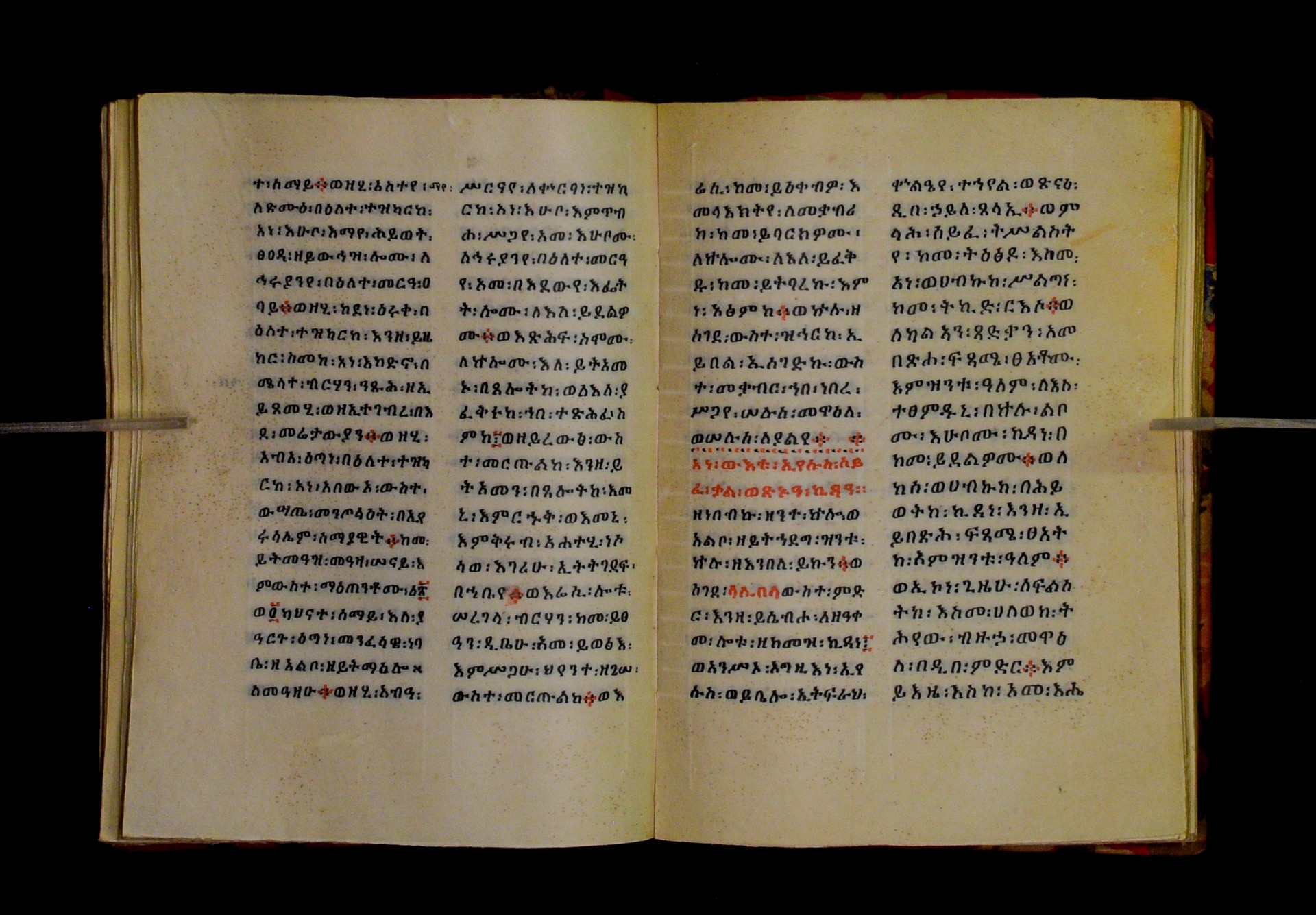 Indicated in black and red ink on the upper margin of the first folio of each quire: ff. 1r (፩,), 11r (፪), 21r (፫), 31r (፬), 41r (፭), 51r (፮), 61r (፯), 71r (፰), 81r (፱), 91r (፲), 101r (፲፩,), 111r (፲፪), 121r (፲፫). |