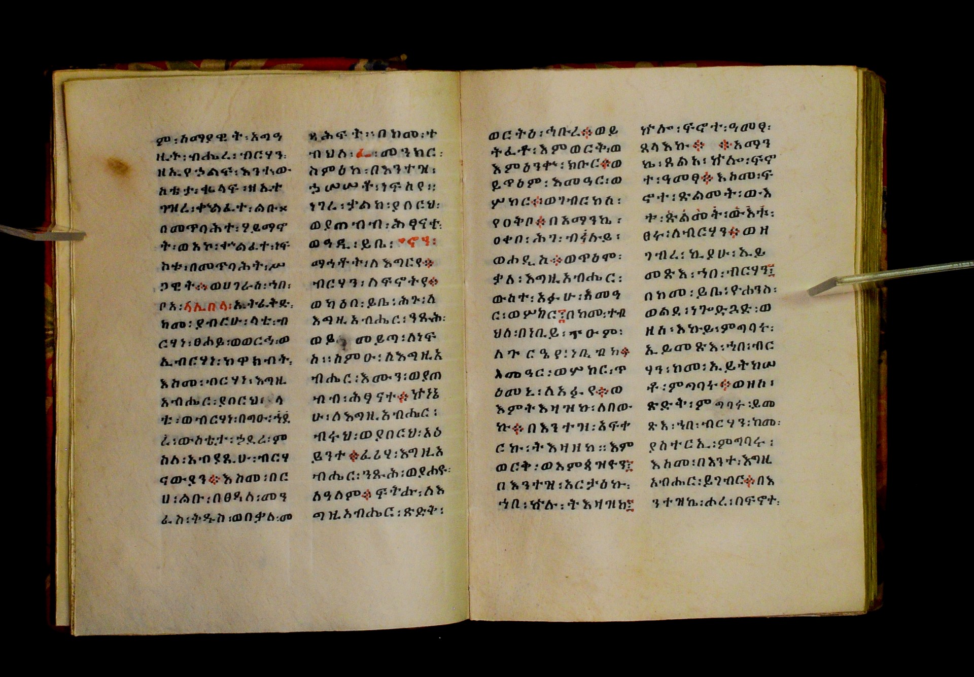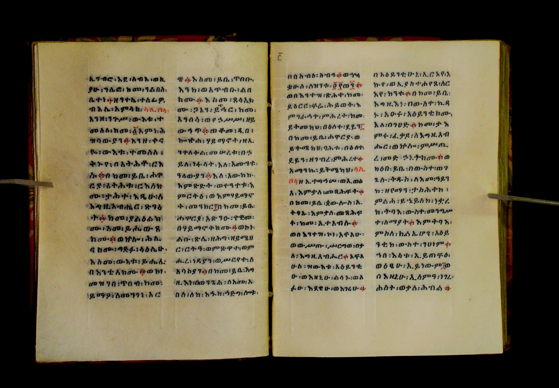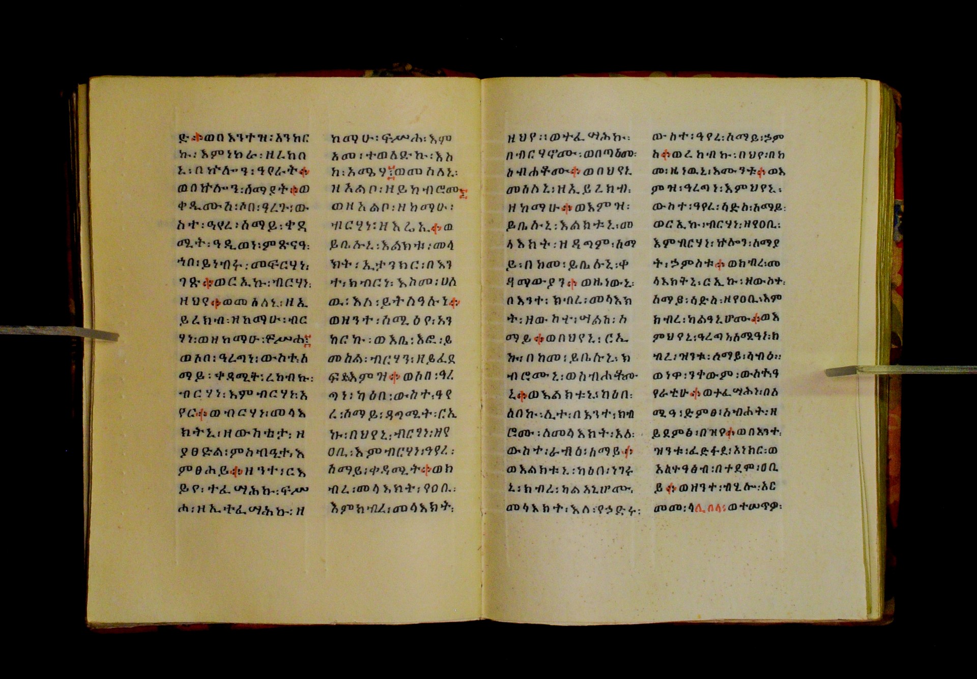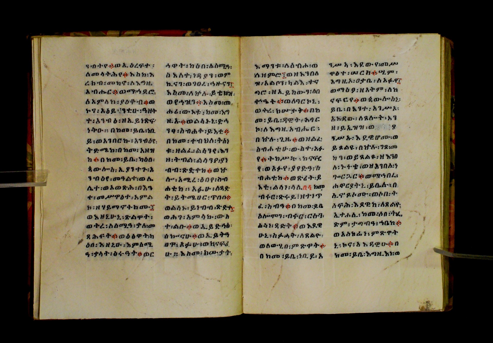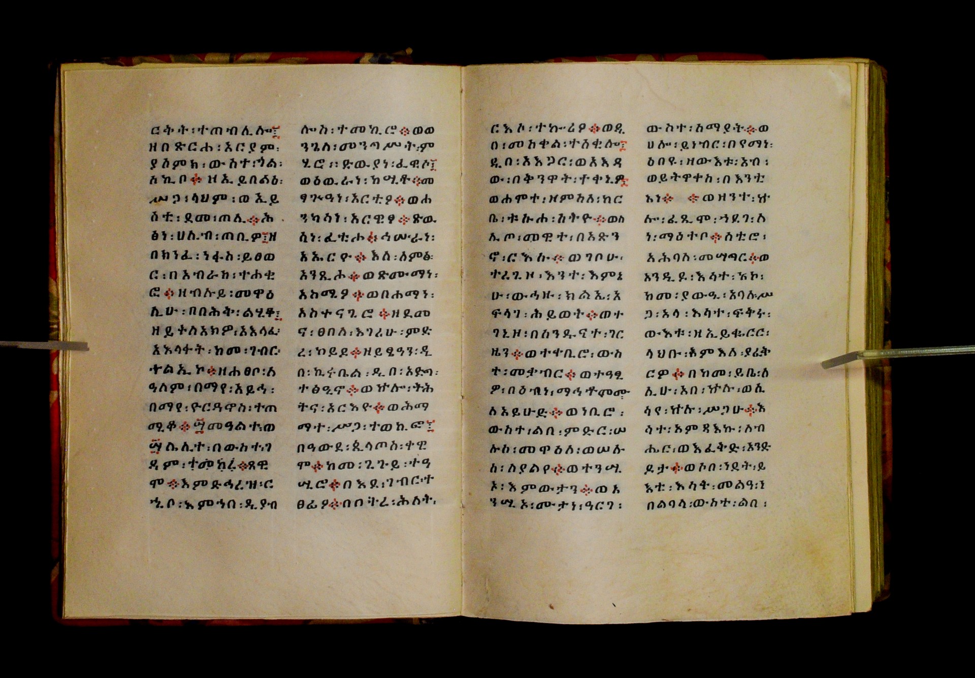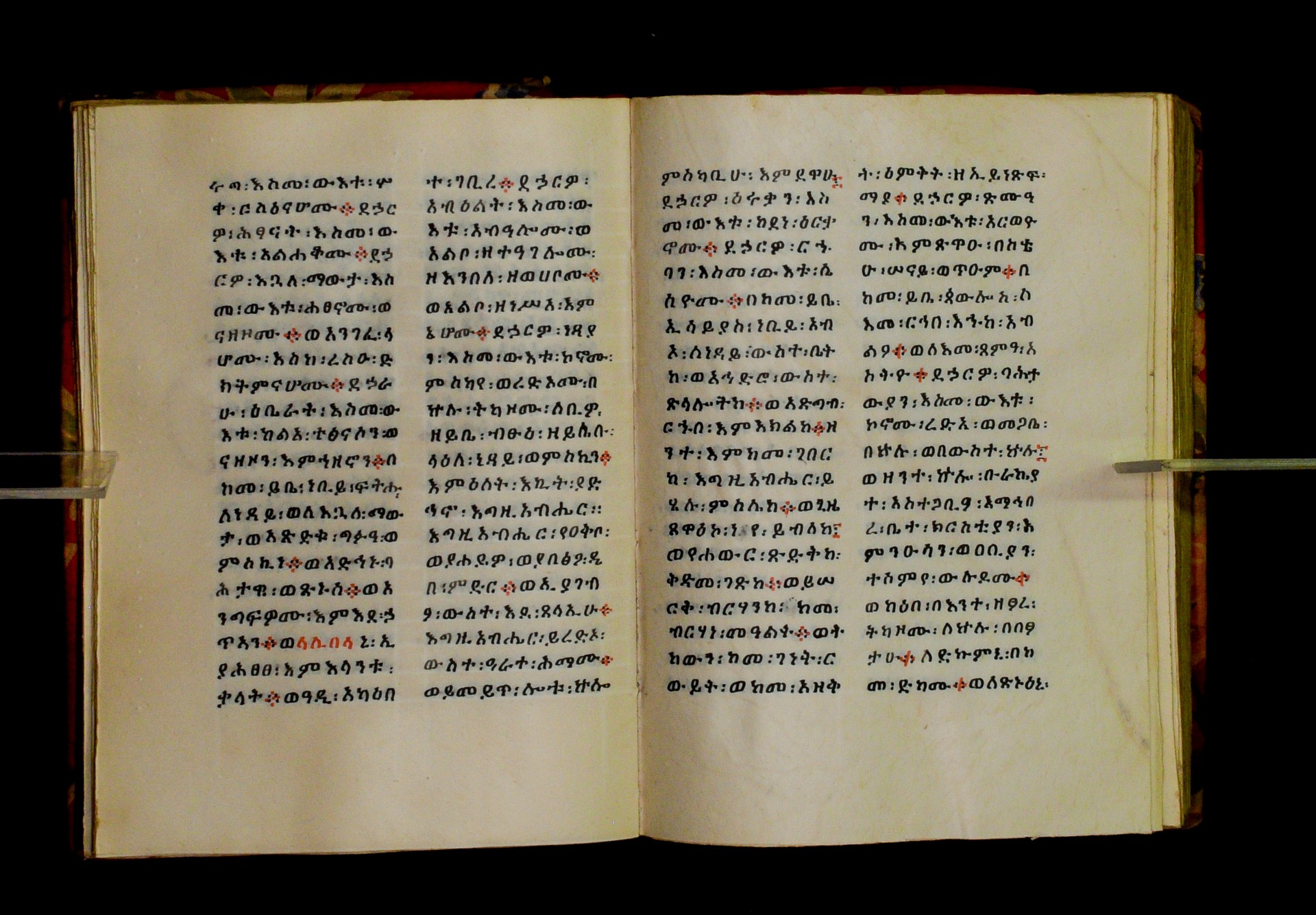 Indicated in black and red ink on the upper margin of the first folio of each quire: ff. 1r (፩,), 11r (፪), 21r (፫), 31r (፬), 41r (፭), 51r (፮), 61r (፯), 71r (፰), 81r (፱), 91r (፲), 101r (፲፩,), 111r (፲፪), 121r (፲፫). |