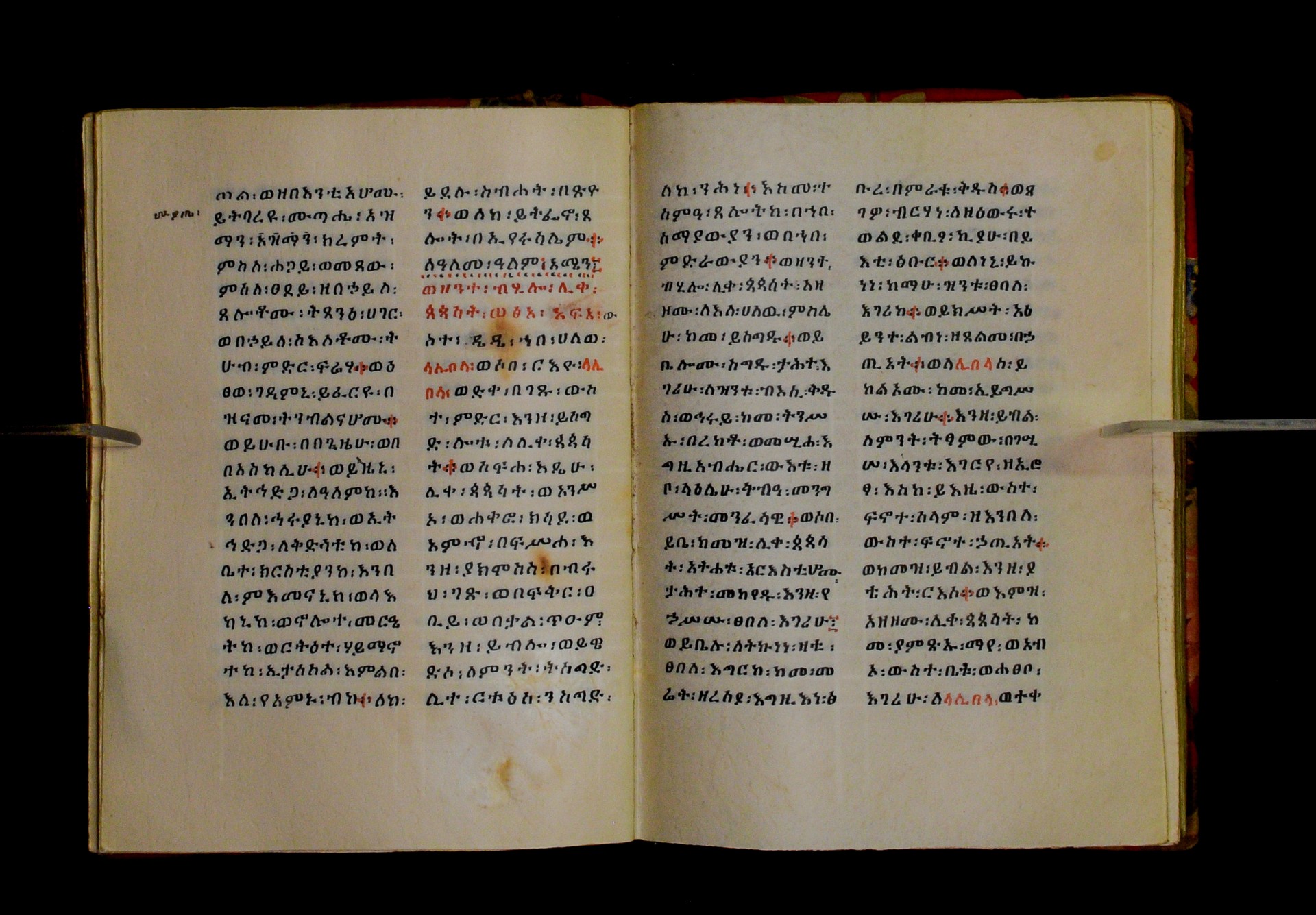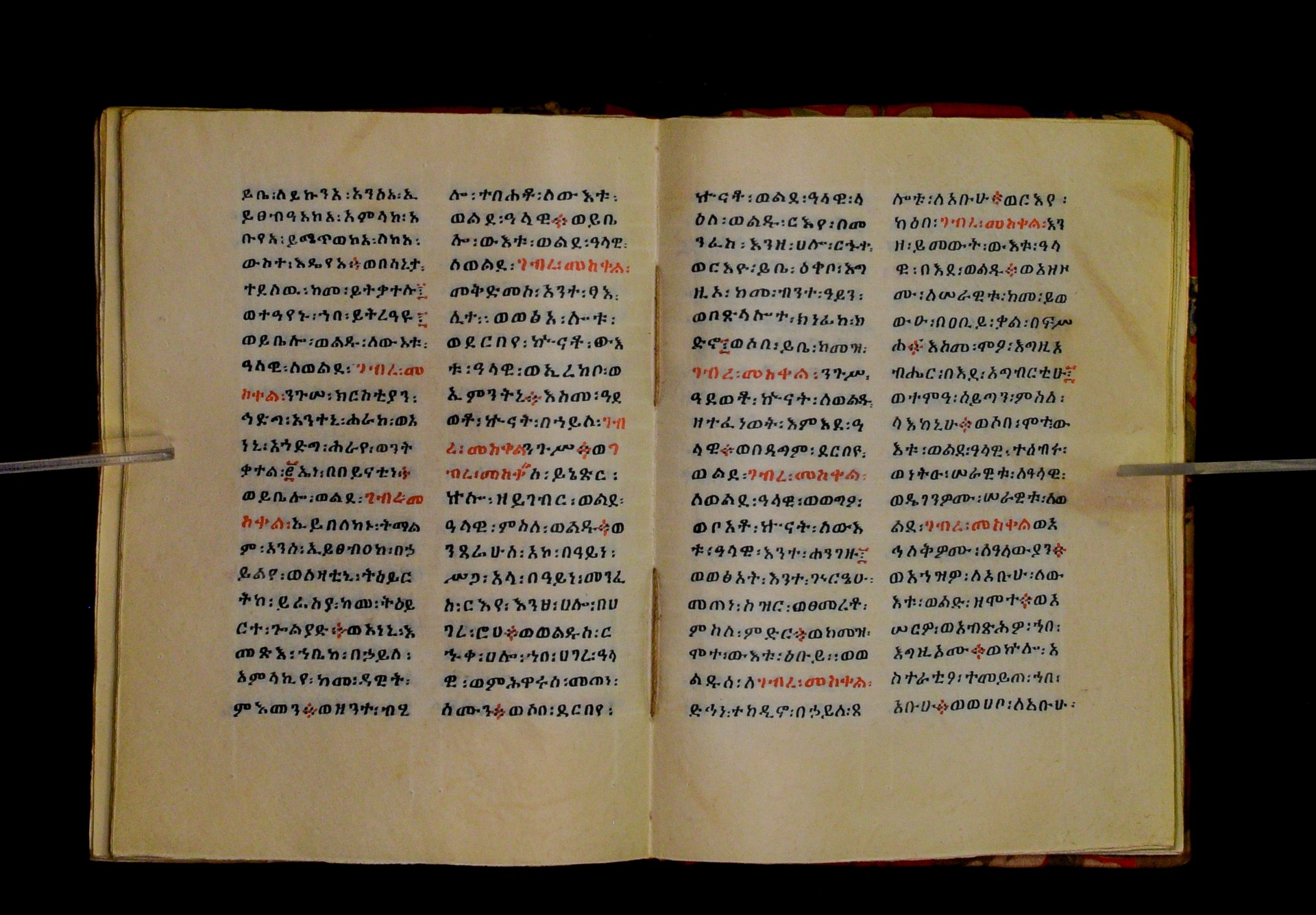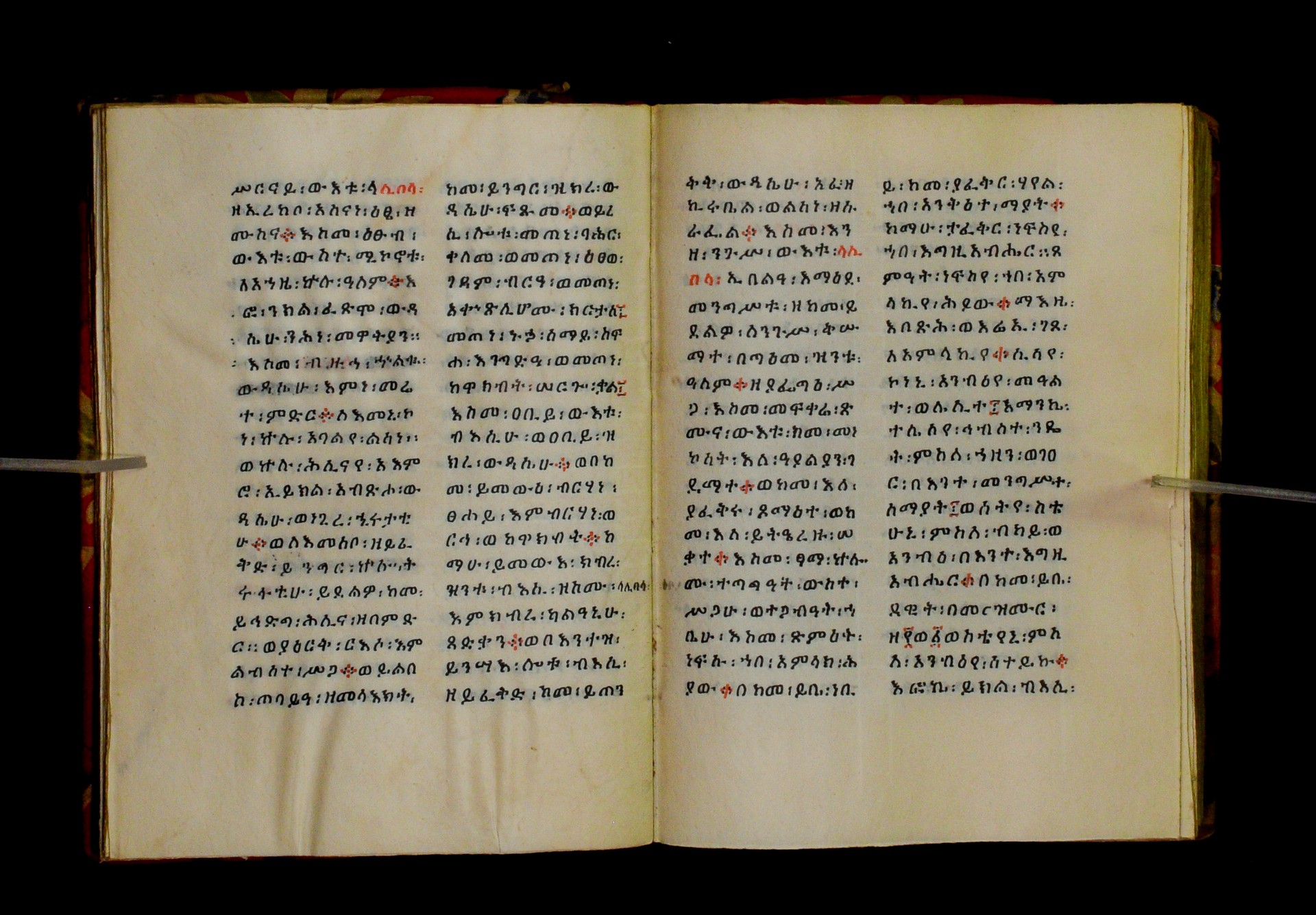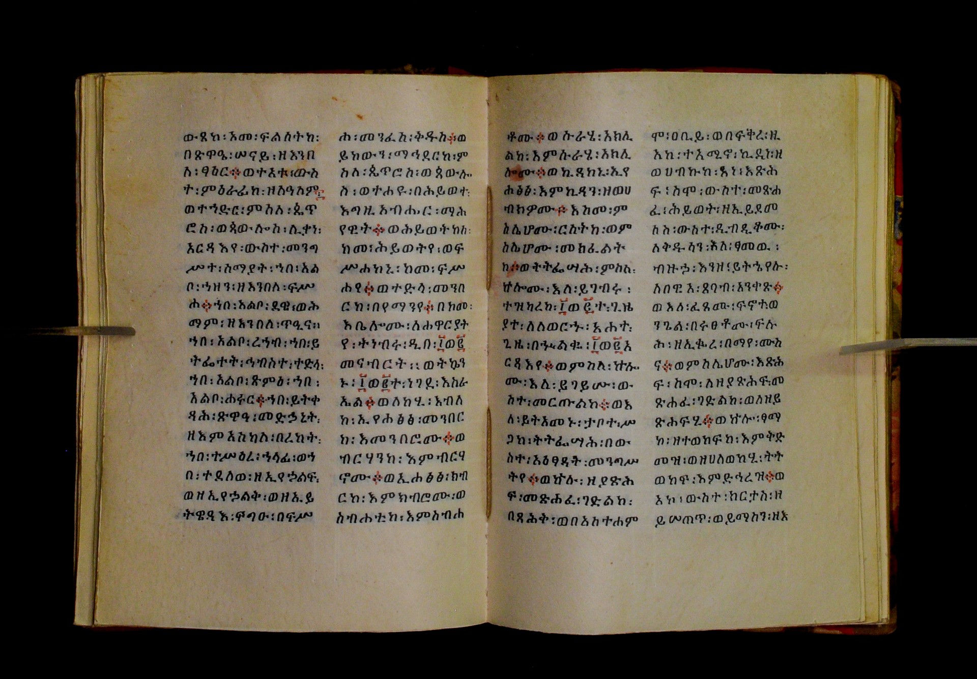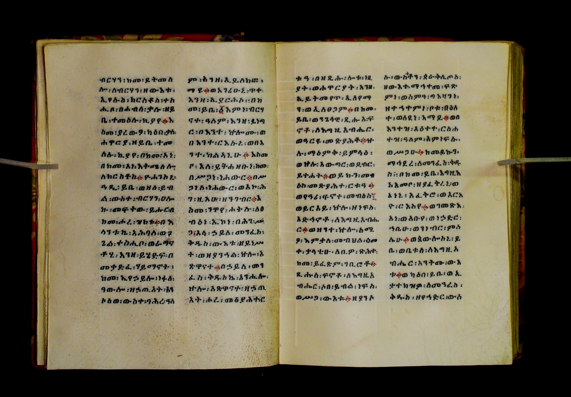Indicated in black and red ink on the upper margin of the first folio of each quire: ff. 1r (፩,), 11r (፪), 21r (፫), 31r (፬), 41r (፭), 51r (፮), 61r (፯), 71r (፰), 81r (፱), 91r (፲), 101r (፲፩,), 111r (፲፪), 121r (፲፫). |