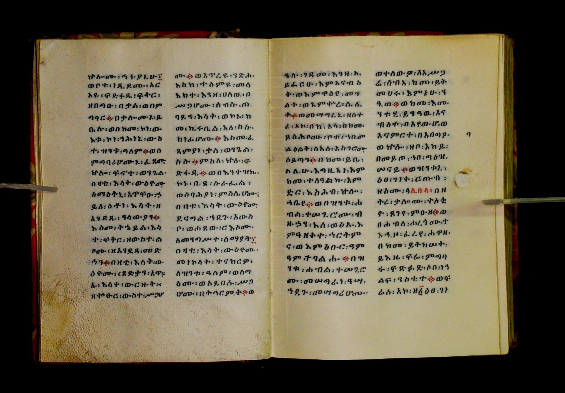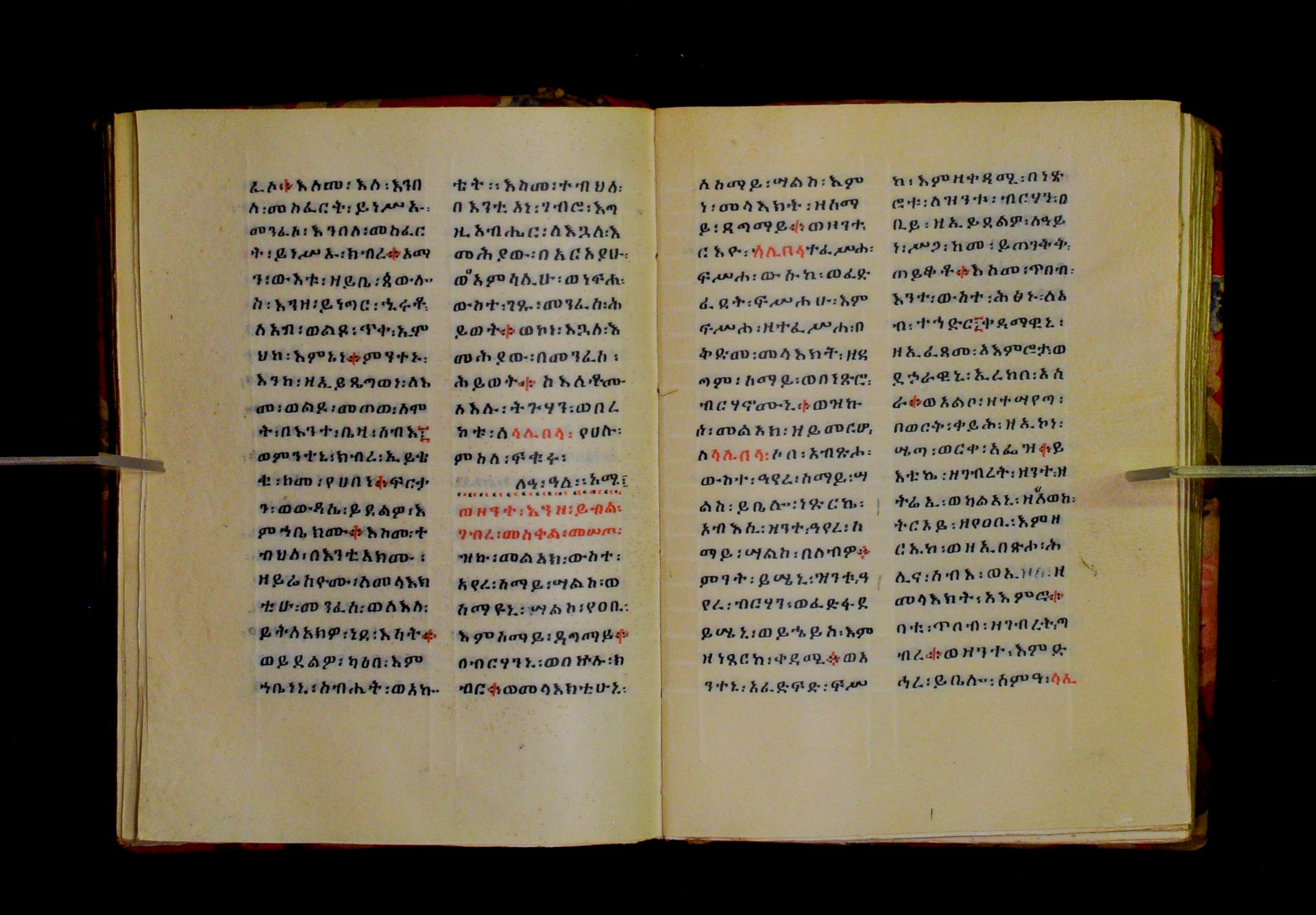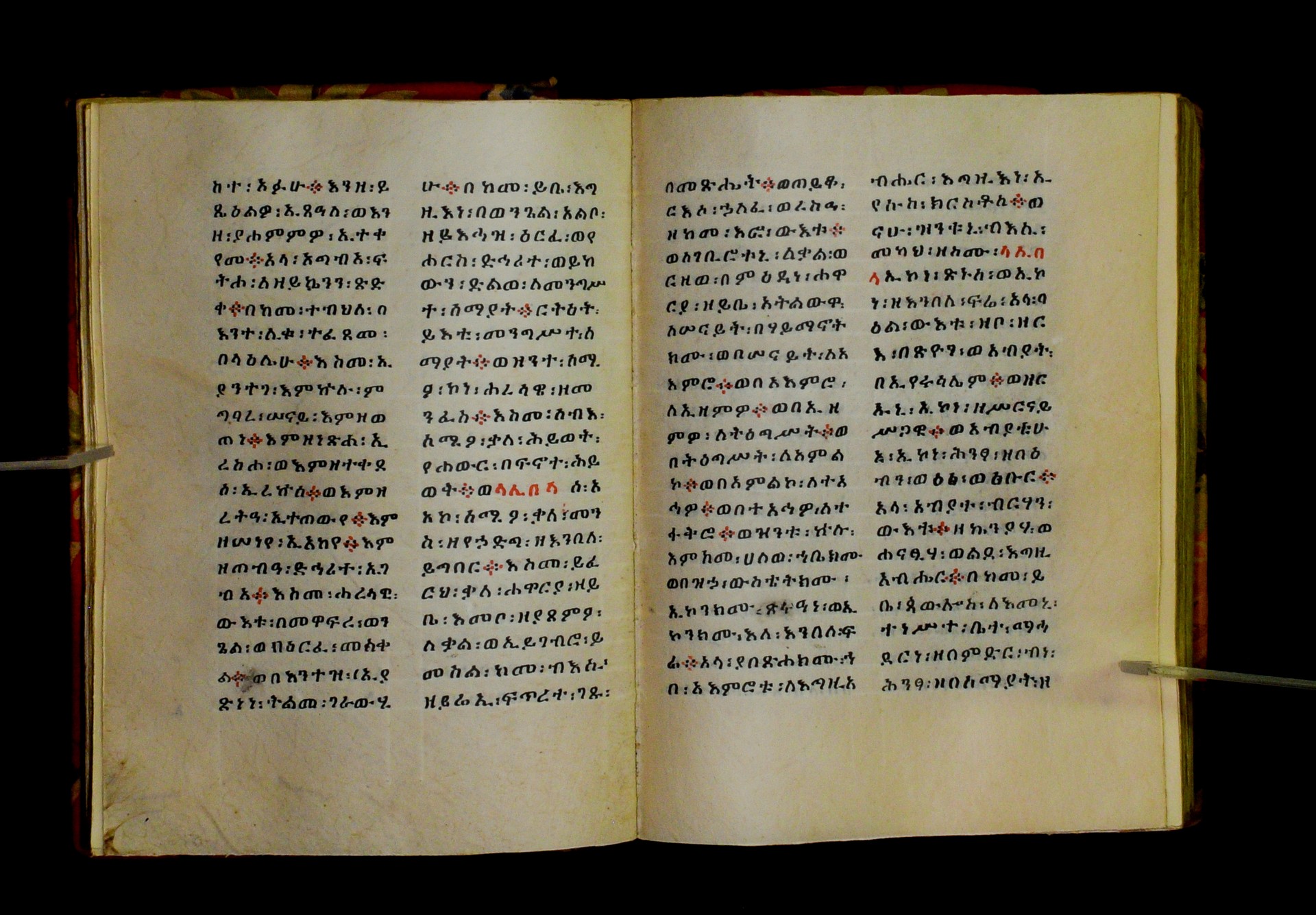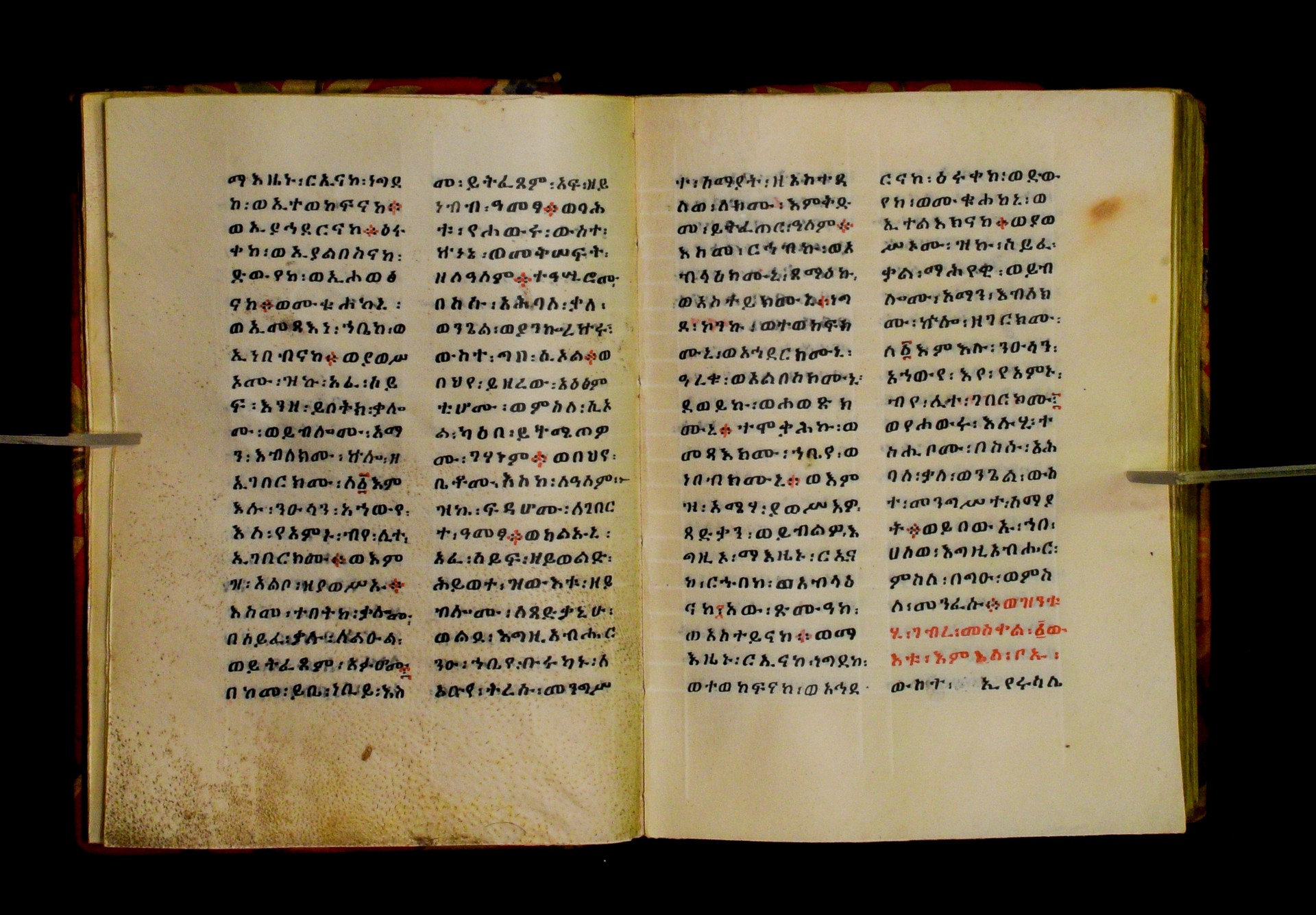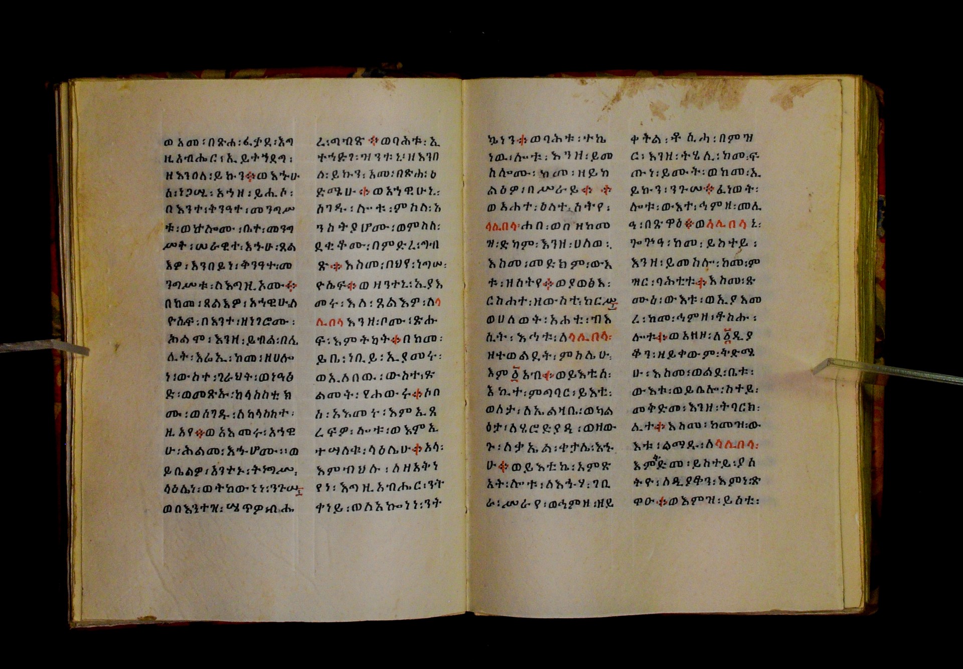 Indicated in black and red ink on the upper margin of the first folio of each quire: ff. 1r (፩,), 11r (፪), 21r (፫), 31r (፬), 41r (፭), 51r (፮), 61r (፯), 71r (፰), 81r (፱), 91r (፲), 101r (፲፩,), 111r (፲፪), 121r (፲፫). |