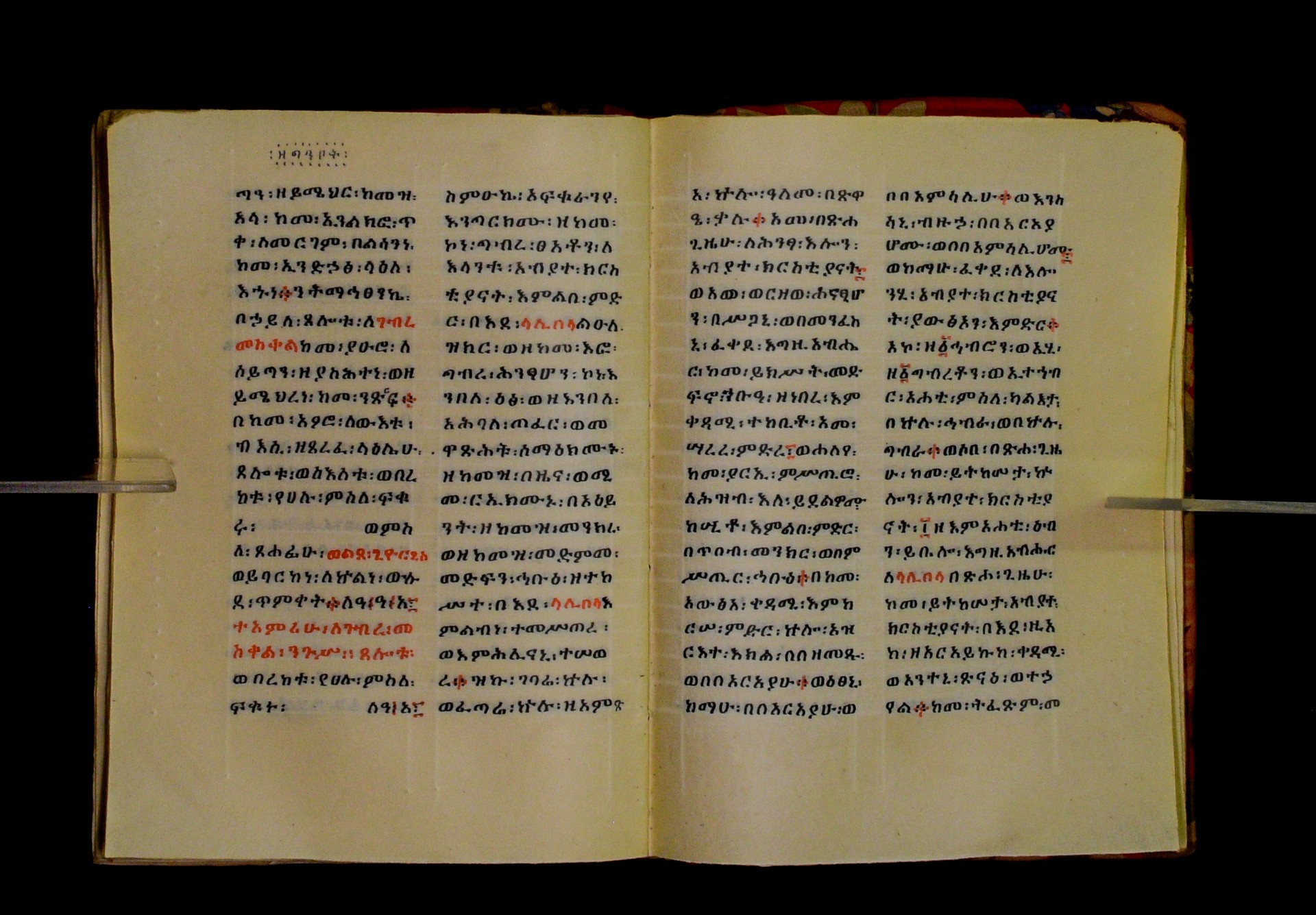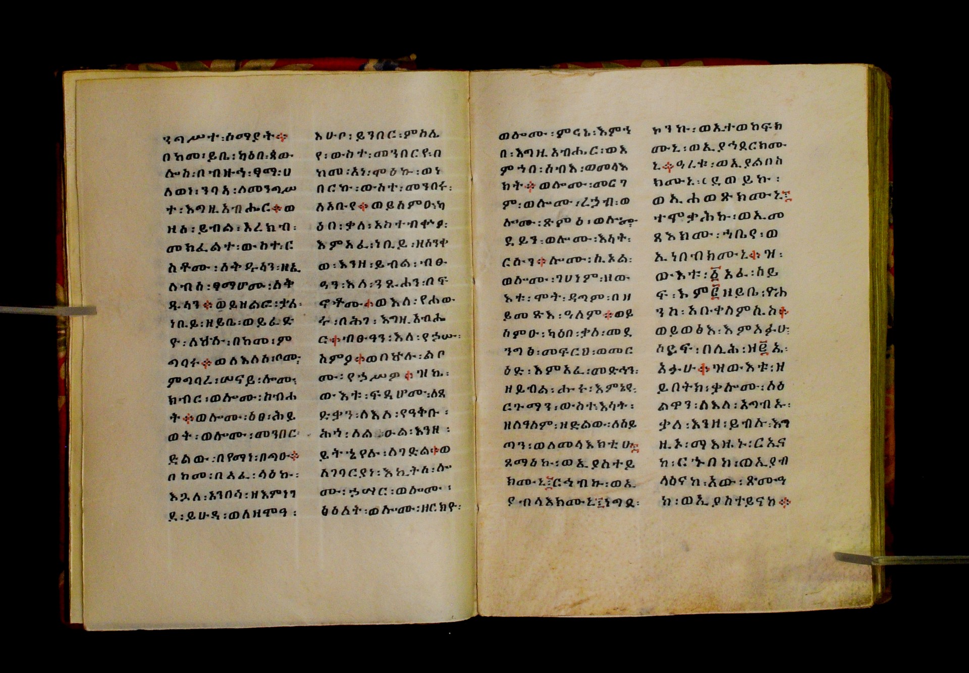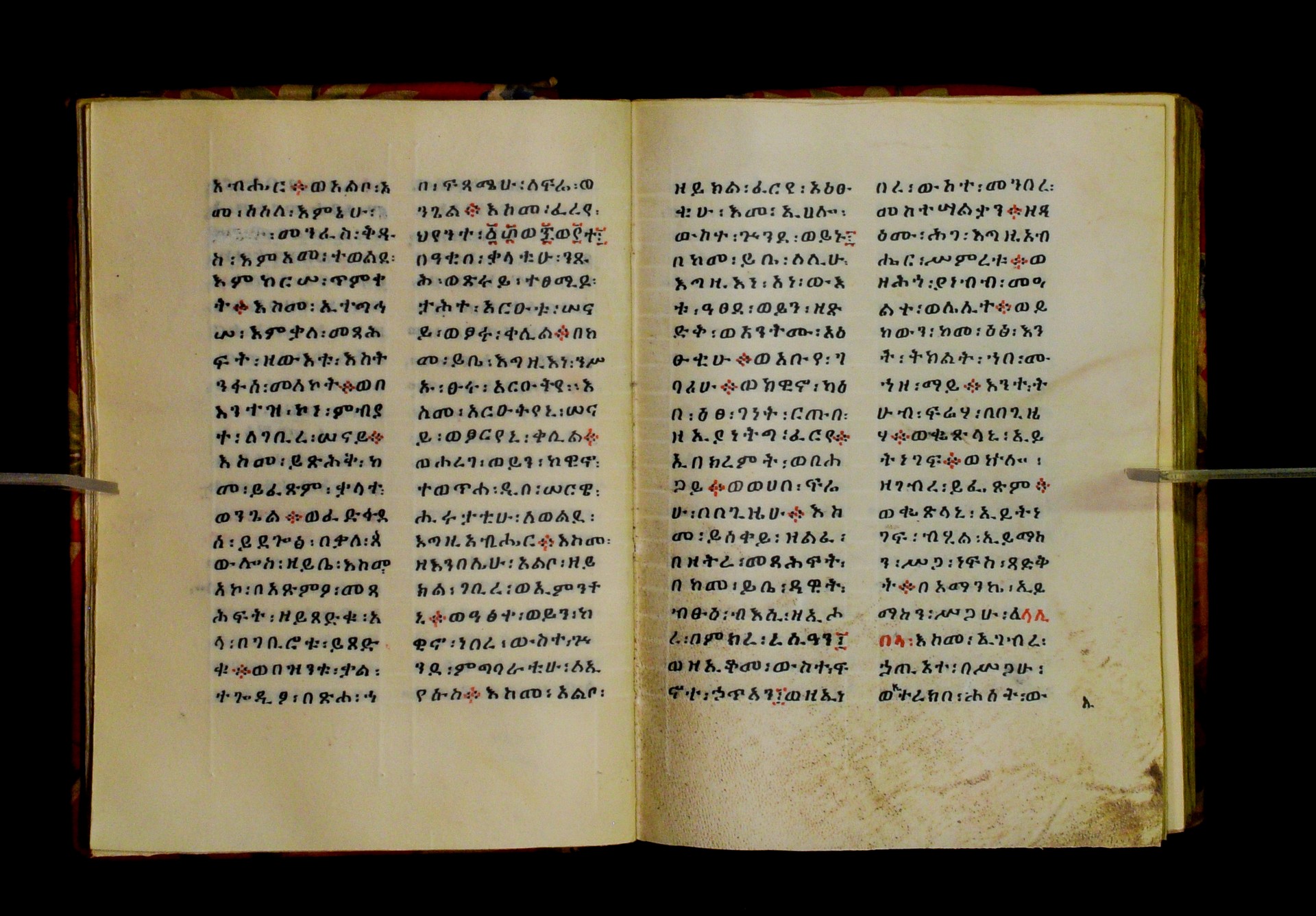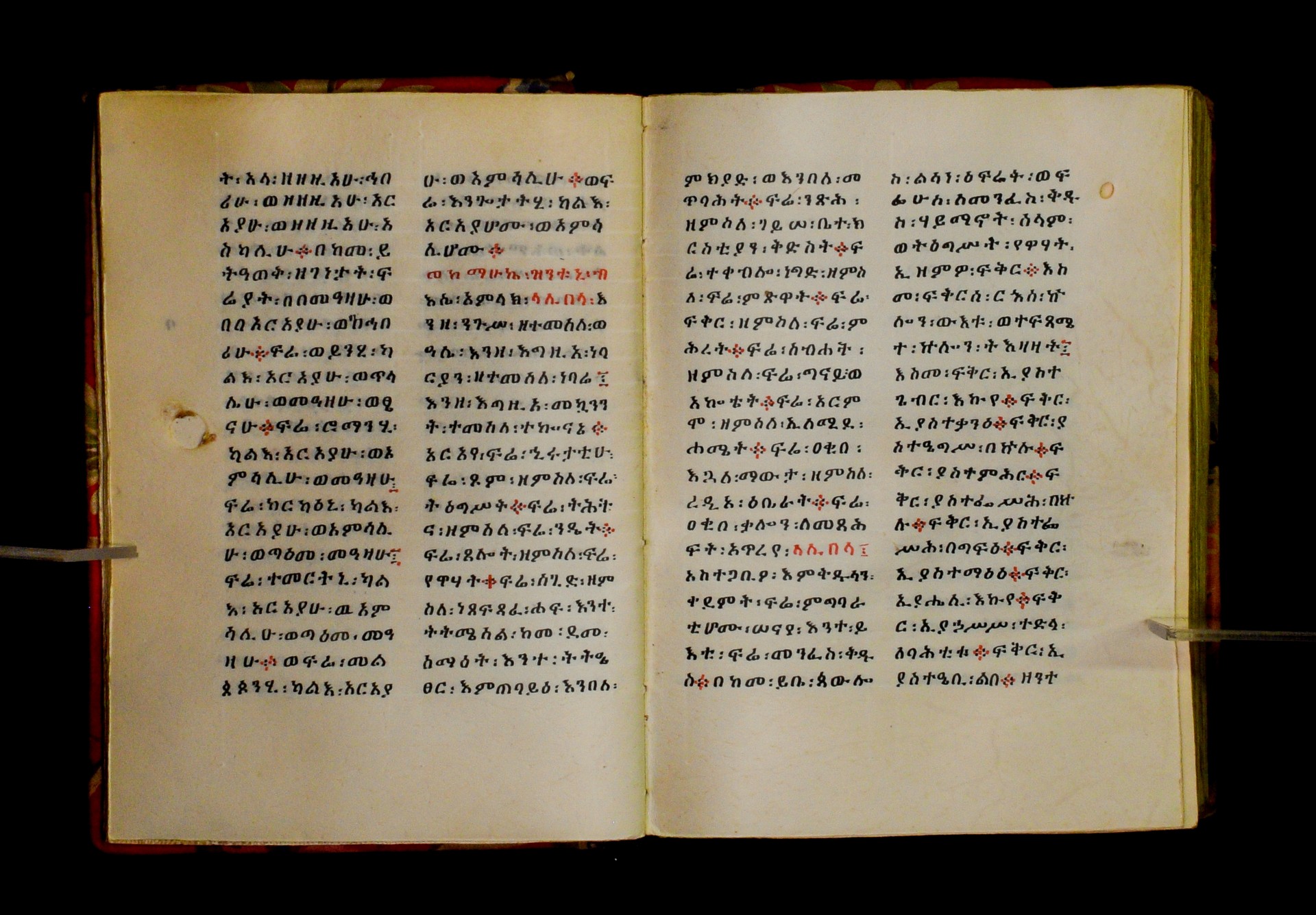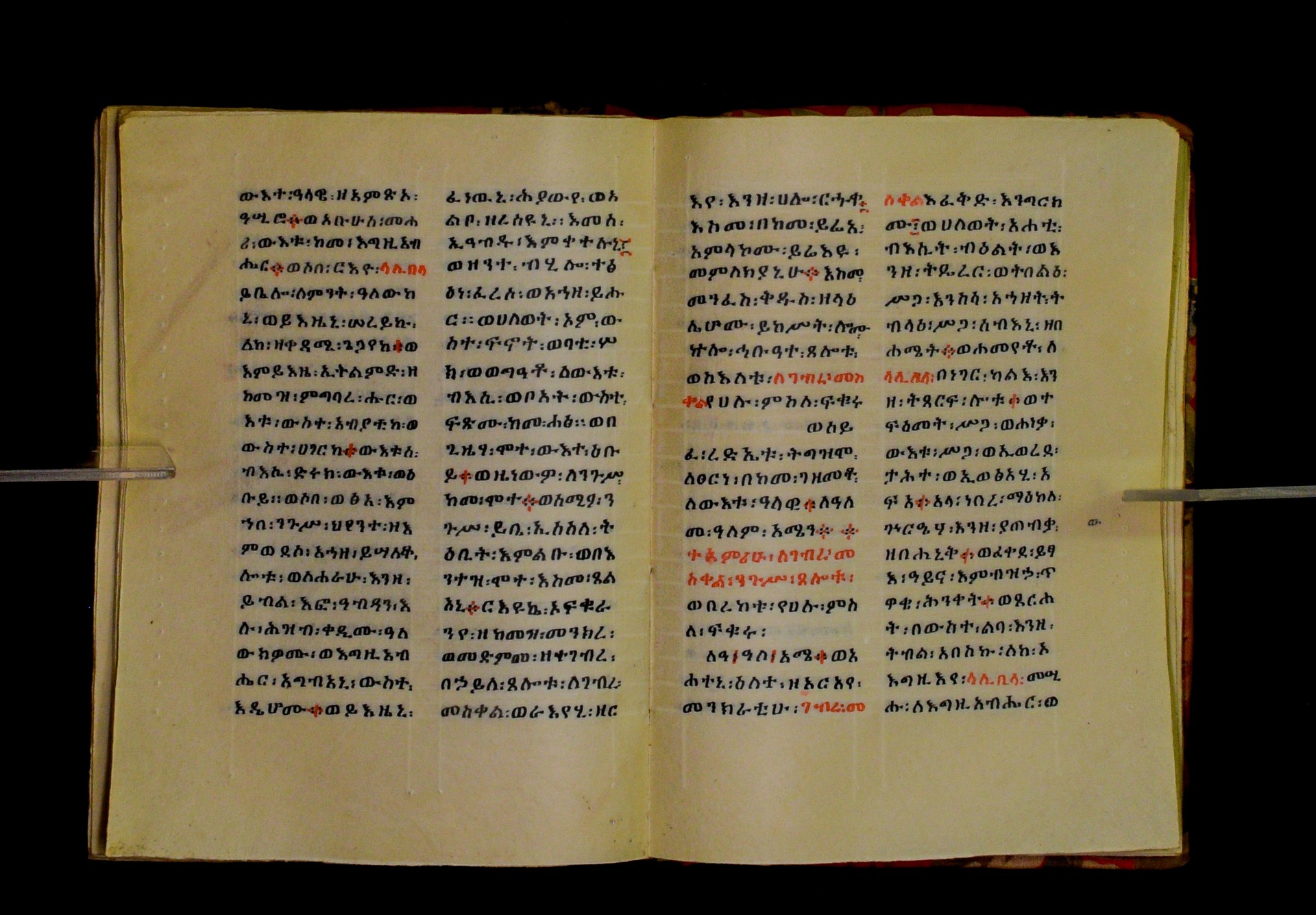 Indicated in black and red ink on the upper margin of the first folio of each quire: ff. 1r (፩,), 11r (፪), 21r (፫), 31r (፬), 41r (፭), 51r (፮), 61r (፯), 71r (፰), 81r (፱), 91r (፲), 101r (፲፩,), 111r (፲፪), 121r (፲፫). |