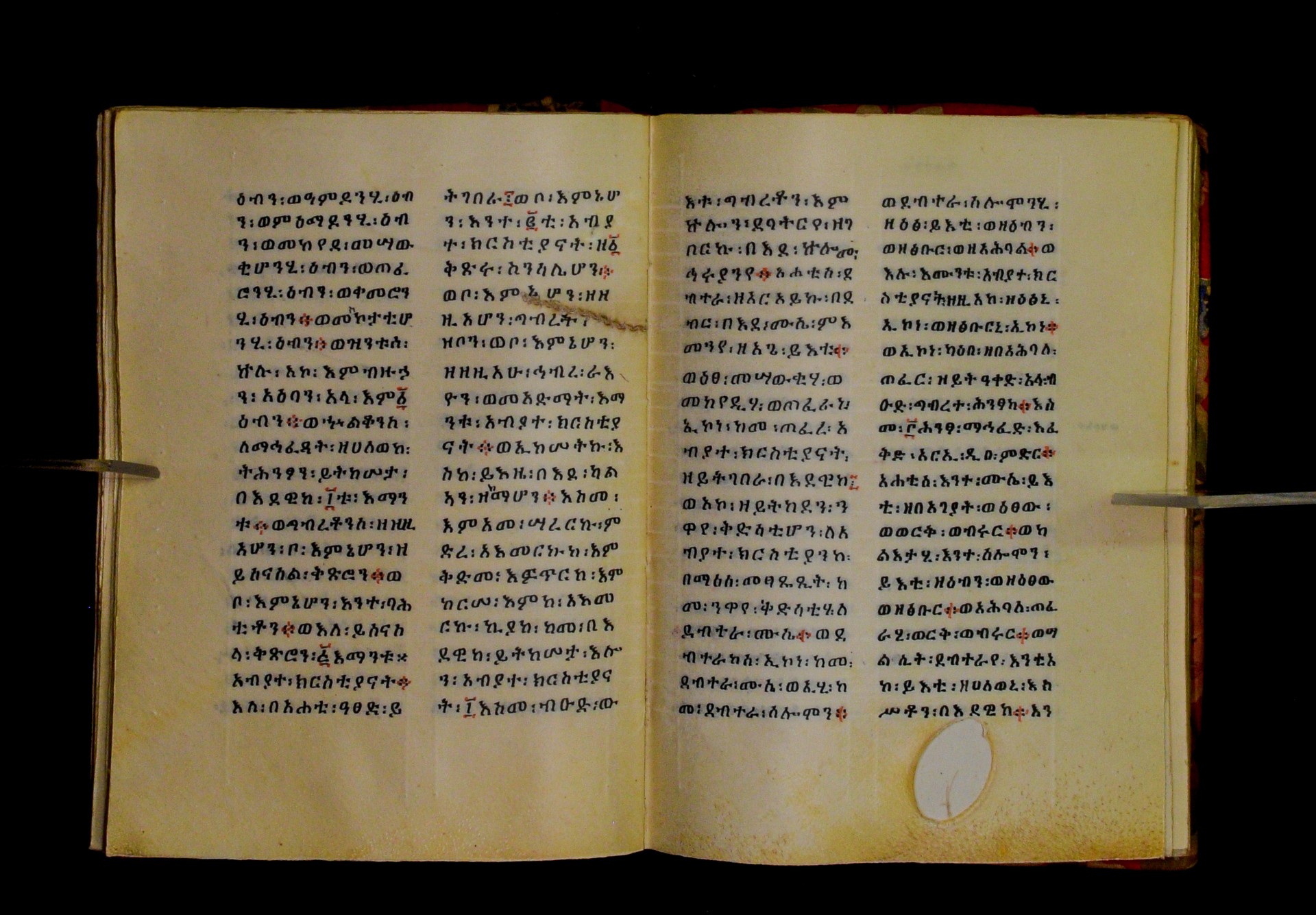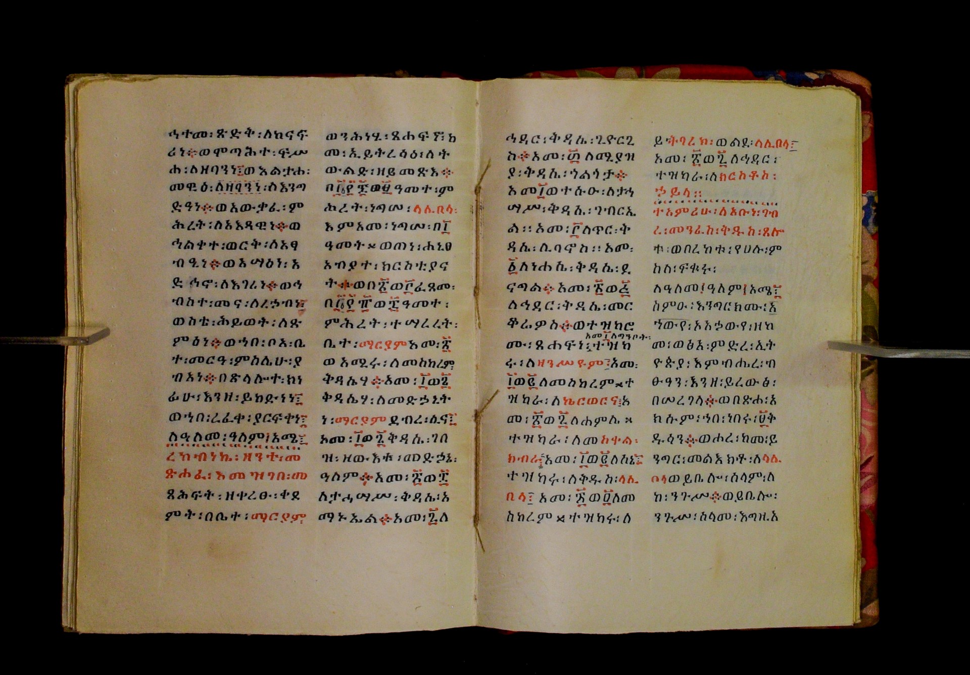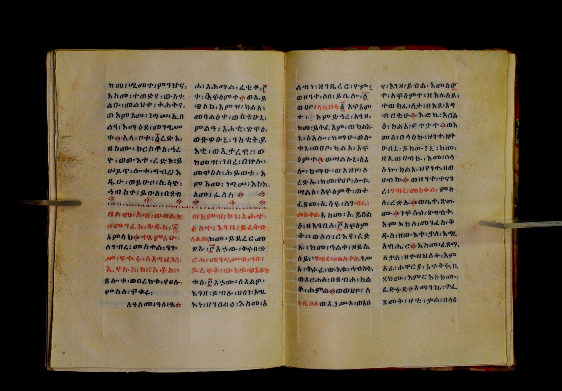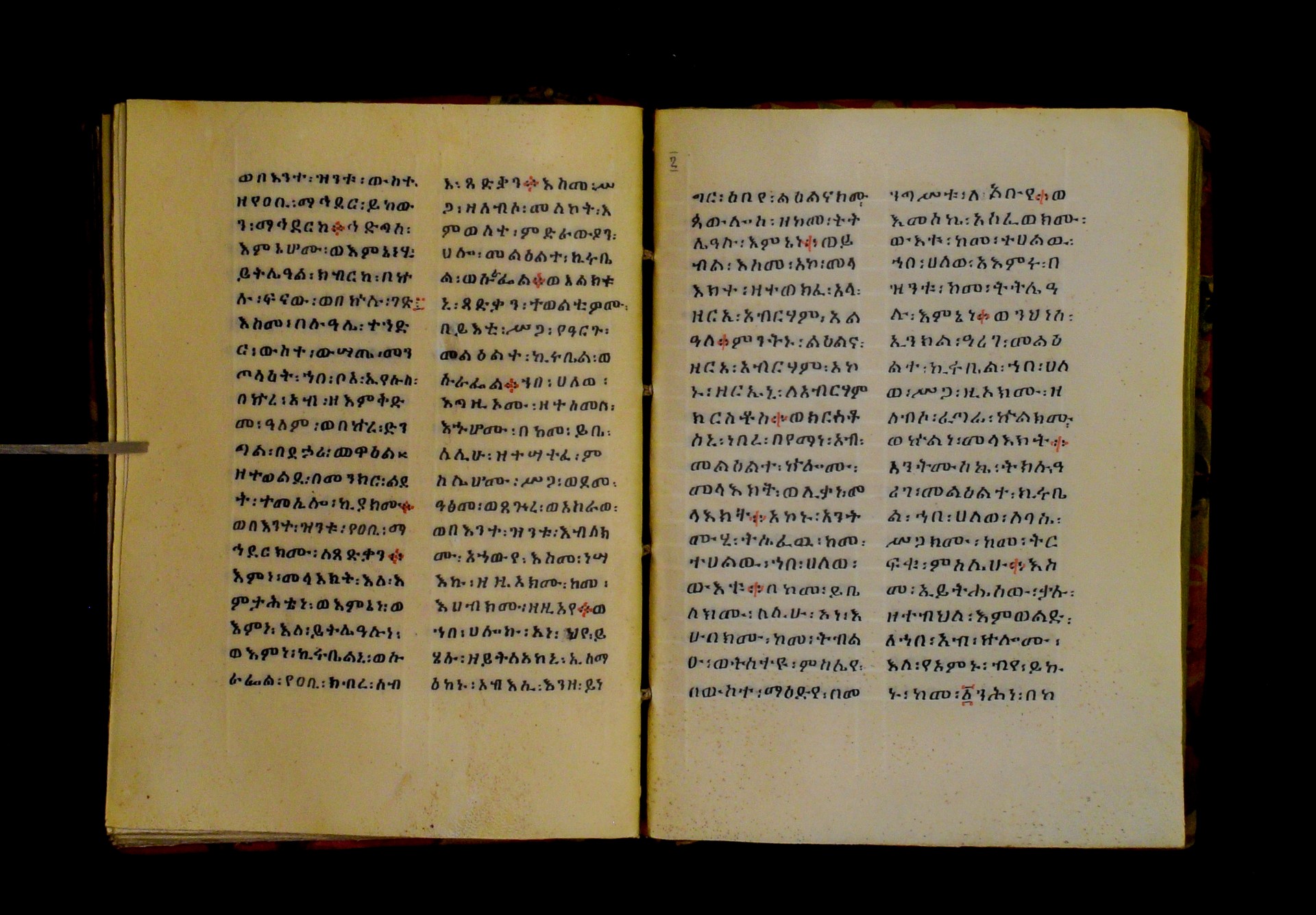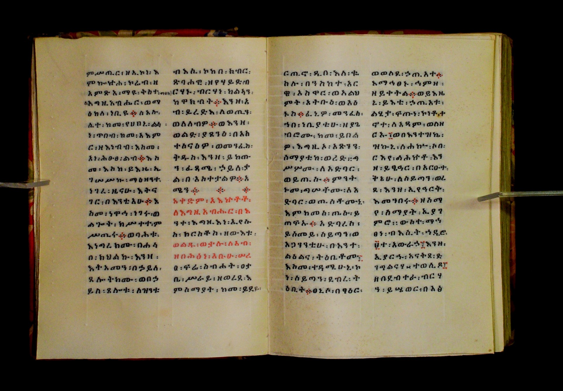 Indicated in black and red ink on the upper margin of the first folio of each quire: ff. 1r (፩,), 11r (፪), 21r (፫), 31r (፬), 41r (፭), 51r (፮), 61r (፯), 71r (፰), 81r (፱), 91r (፲), 101r (፲፩,), 111r (፲፪), 121r (፲፫). |