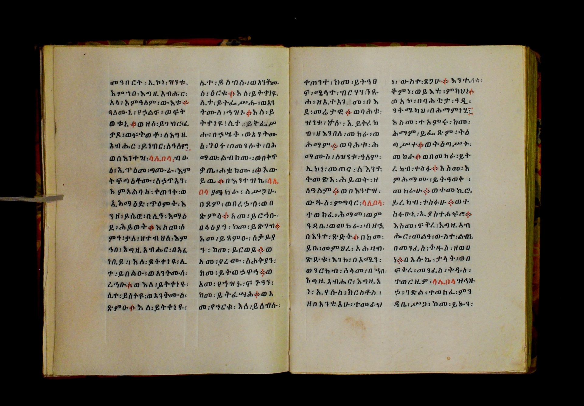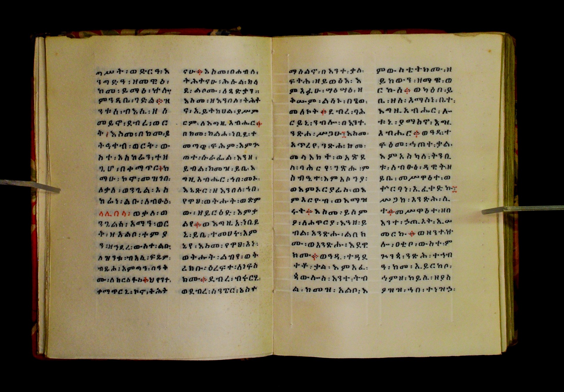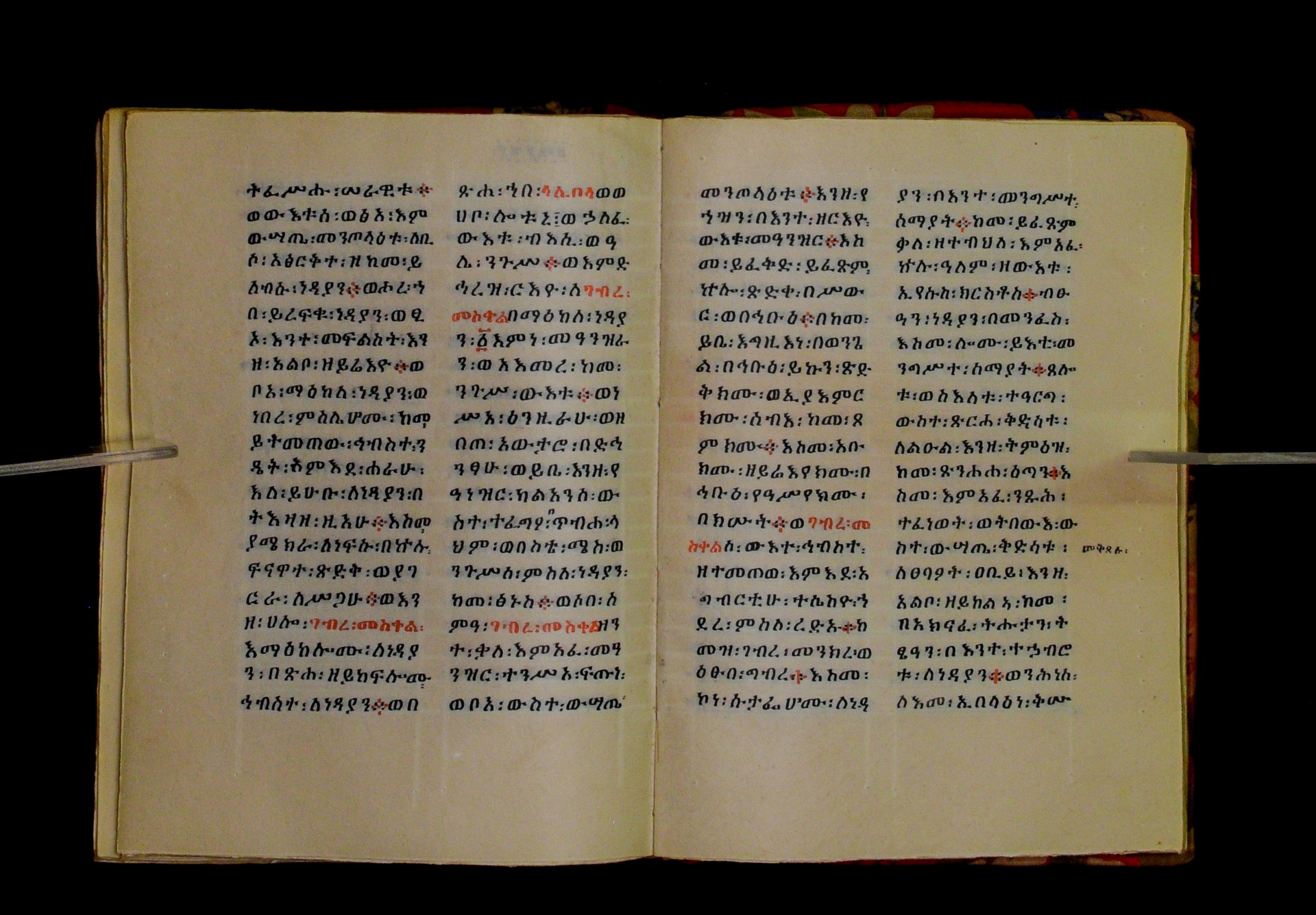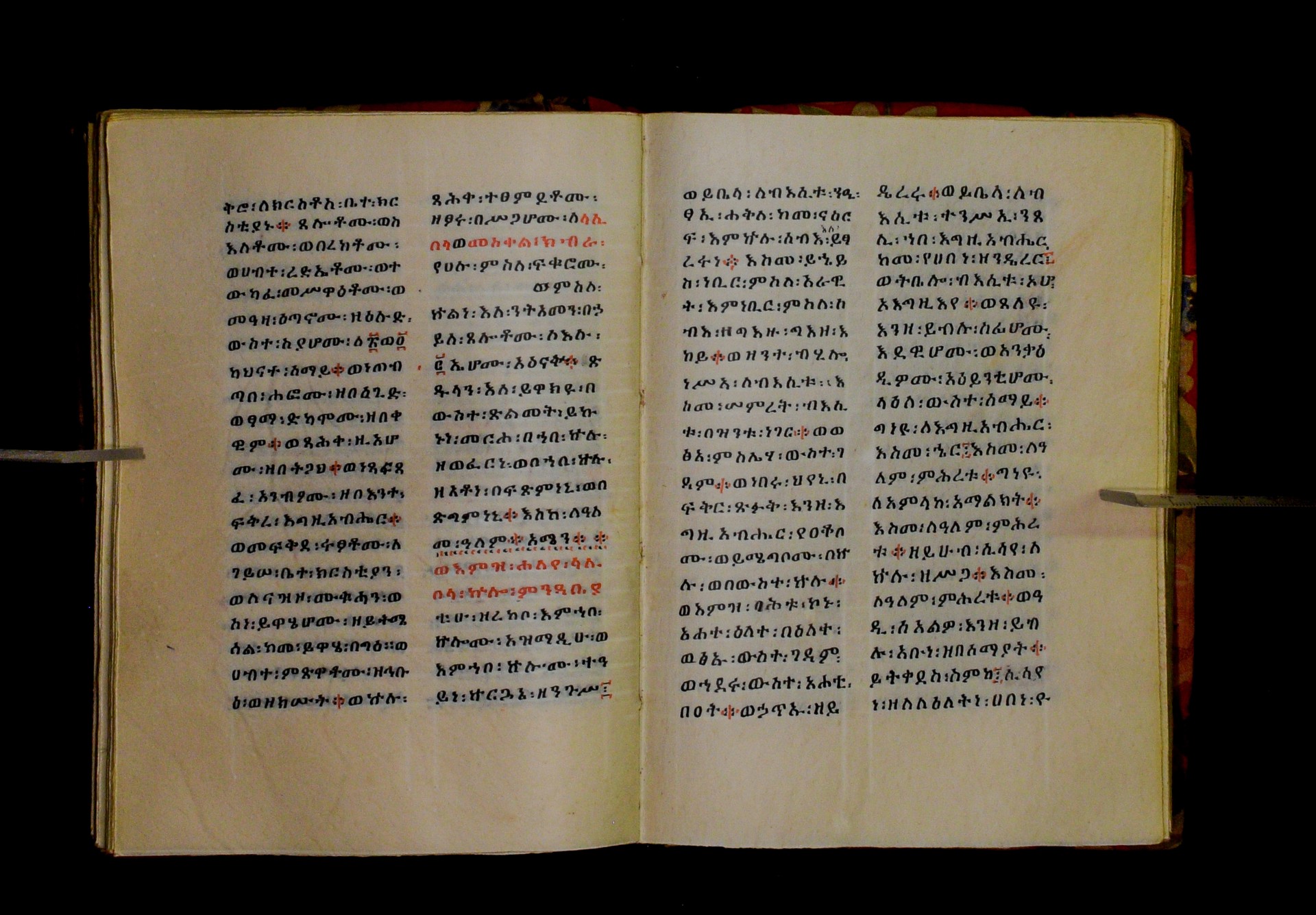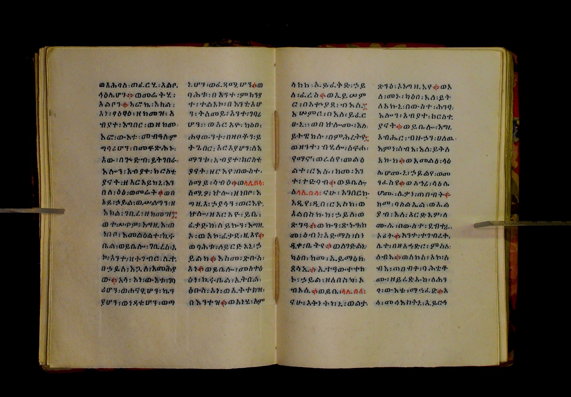 Indicated in black and red ink on the upper margin of the first folio of each quire: ff. 1r (፩,), 11r (፪), 21r (፫), 31r (፬), 41r (፭), 51r (፮), 61r (፯), 71r (፰), 81r (፱), 91r (፲), 101r (፲፩,), 111r (፲፪), 121r (፲፫). |