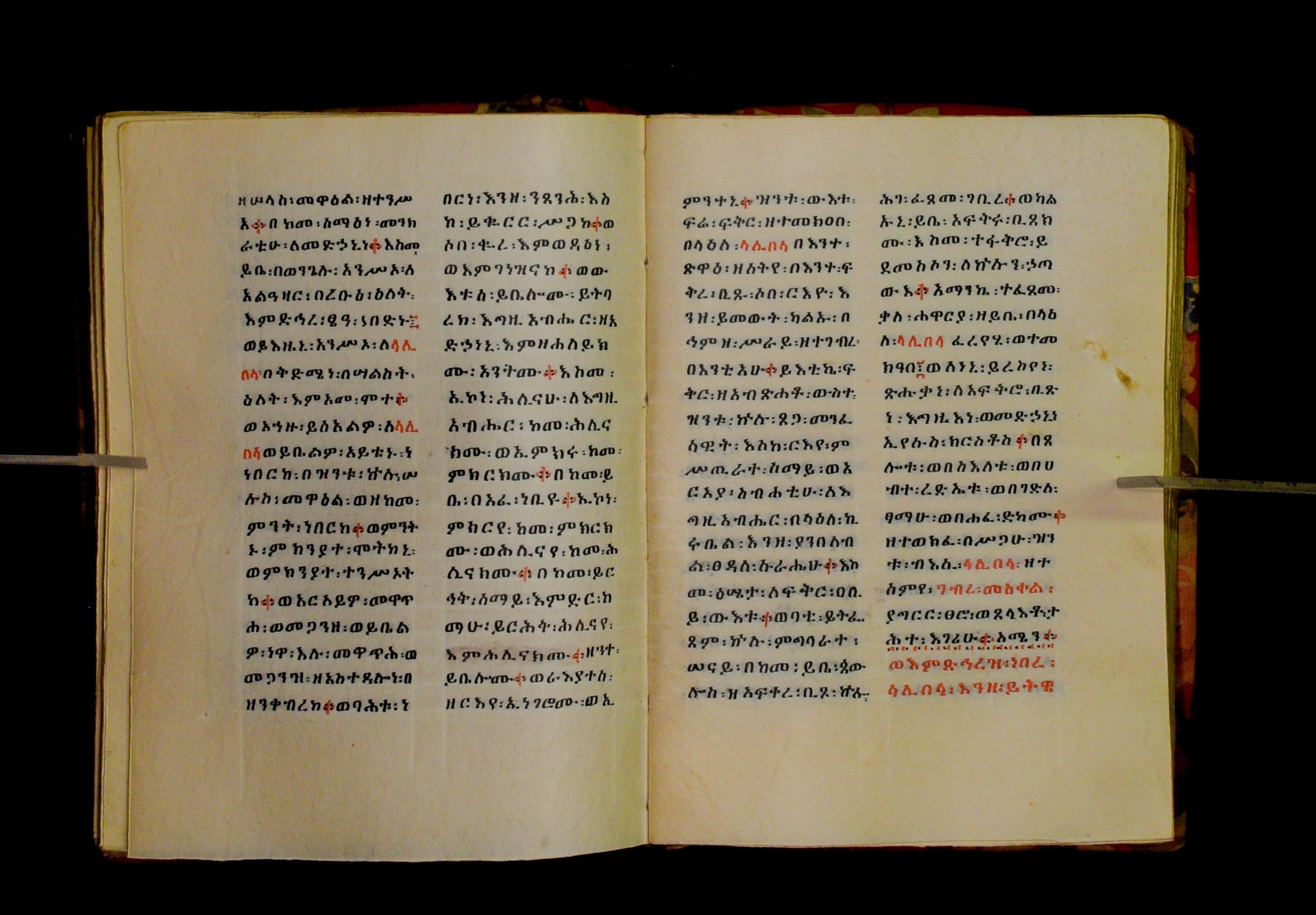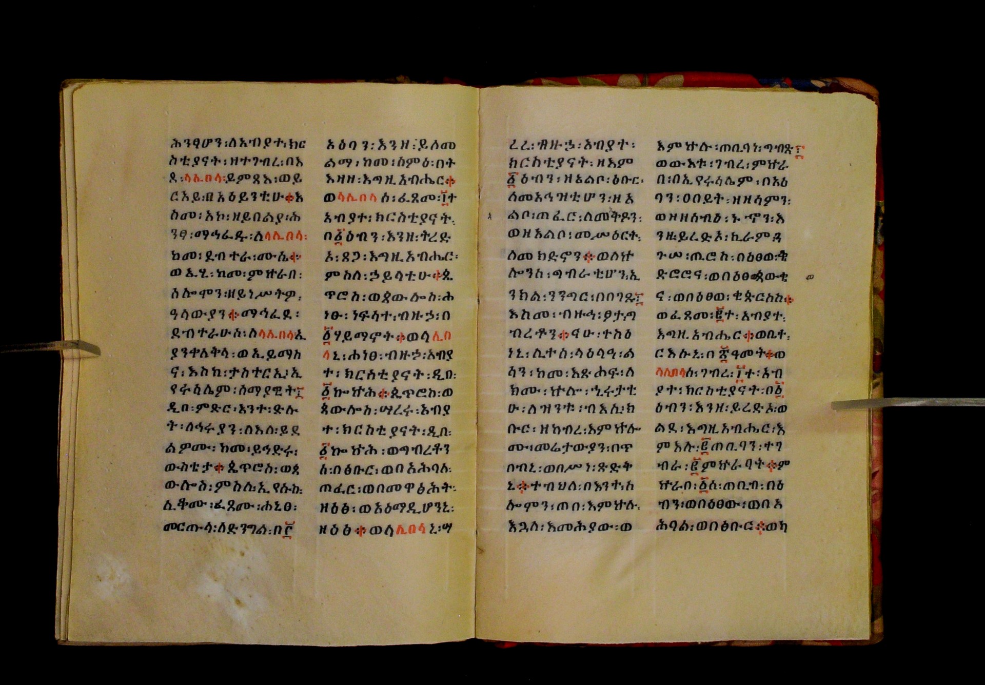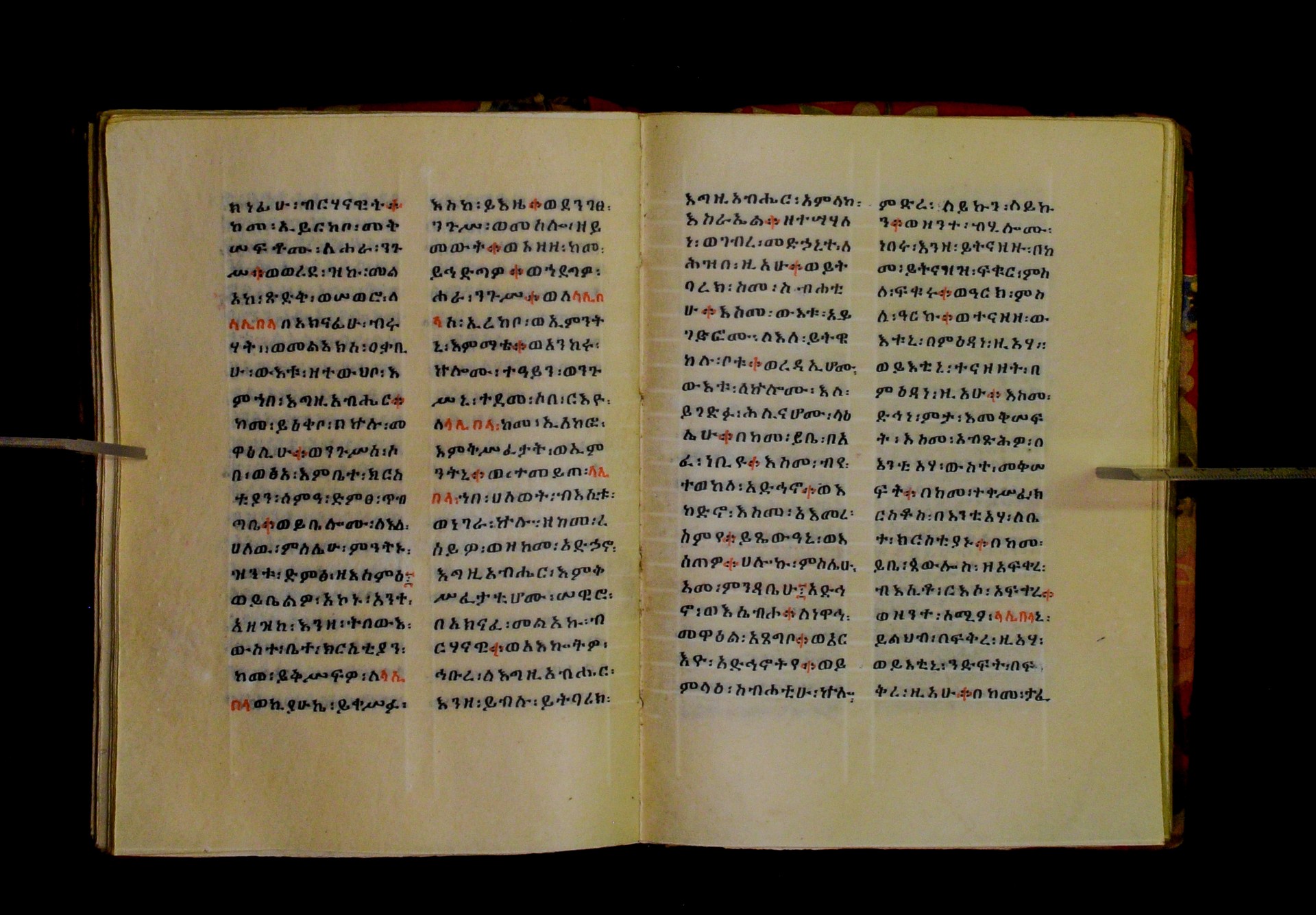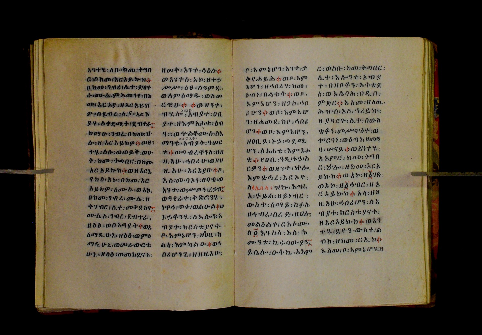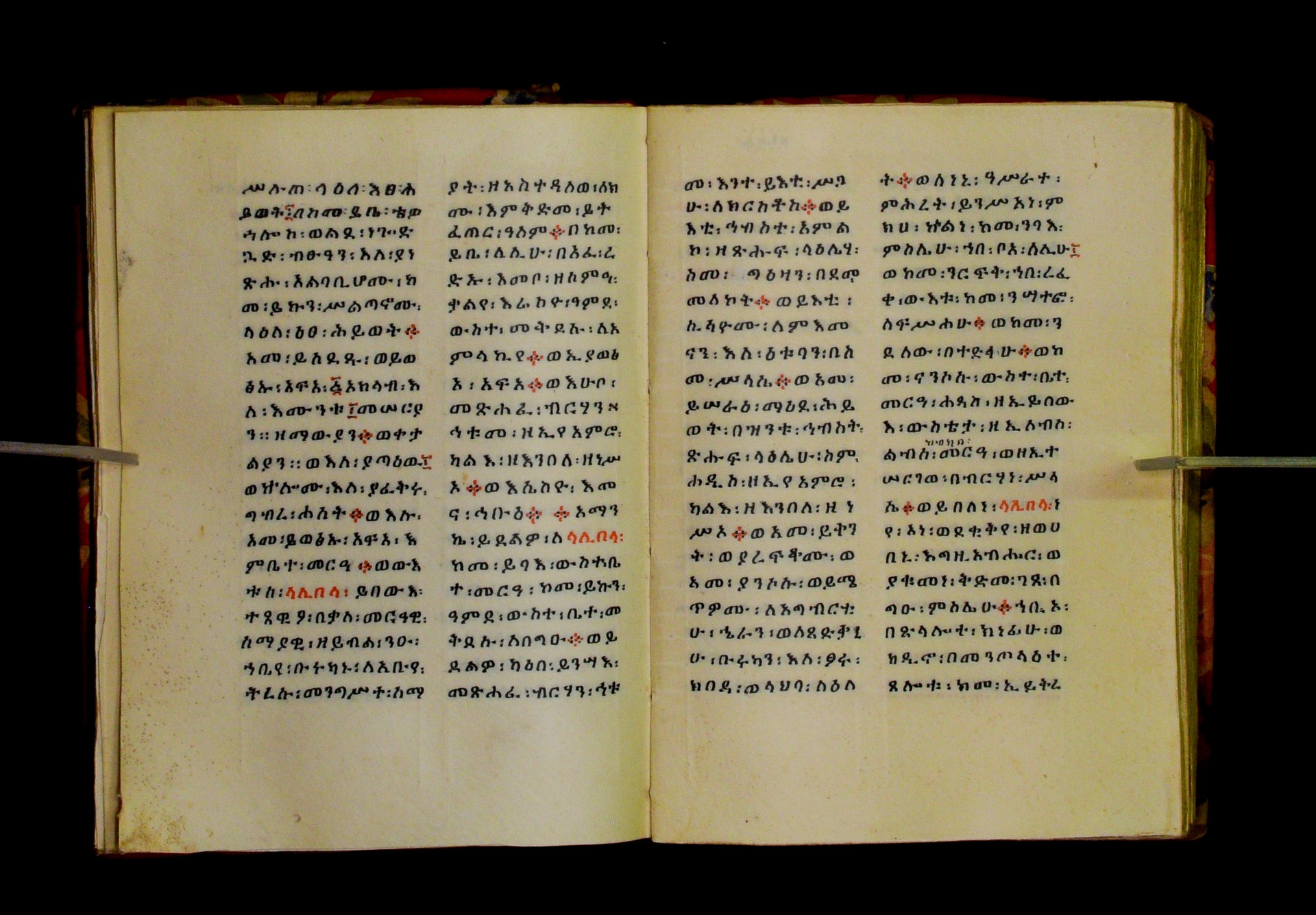 Indicated in black and red ink on the upper margin of the first folio of each quire: ff. 1r (፩,), 11r (፪), 21r (፫), 31r (፬), 41r (፭), 51r (፮), 61r (፯), 71r (፰), 81r (፱), 91r (፲), 101r (፲፩,), 111r (፲፪), 121r (፲፫). |