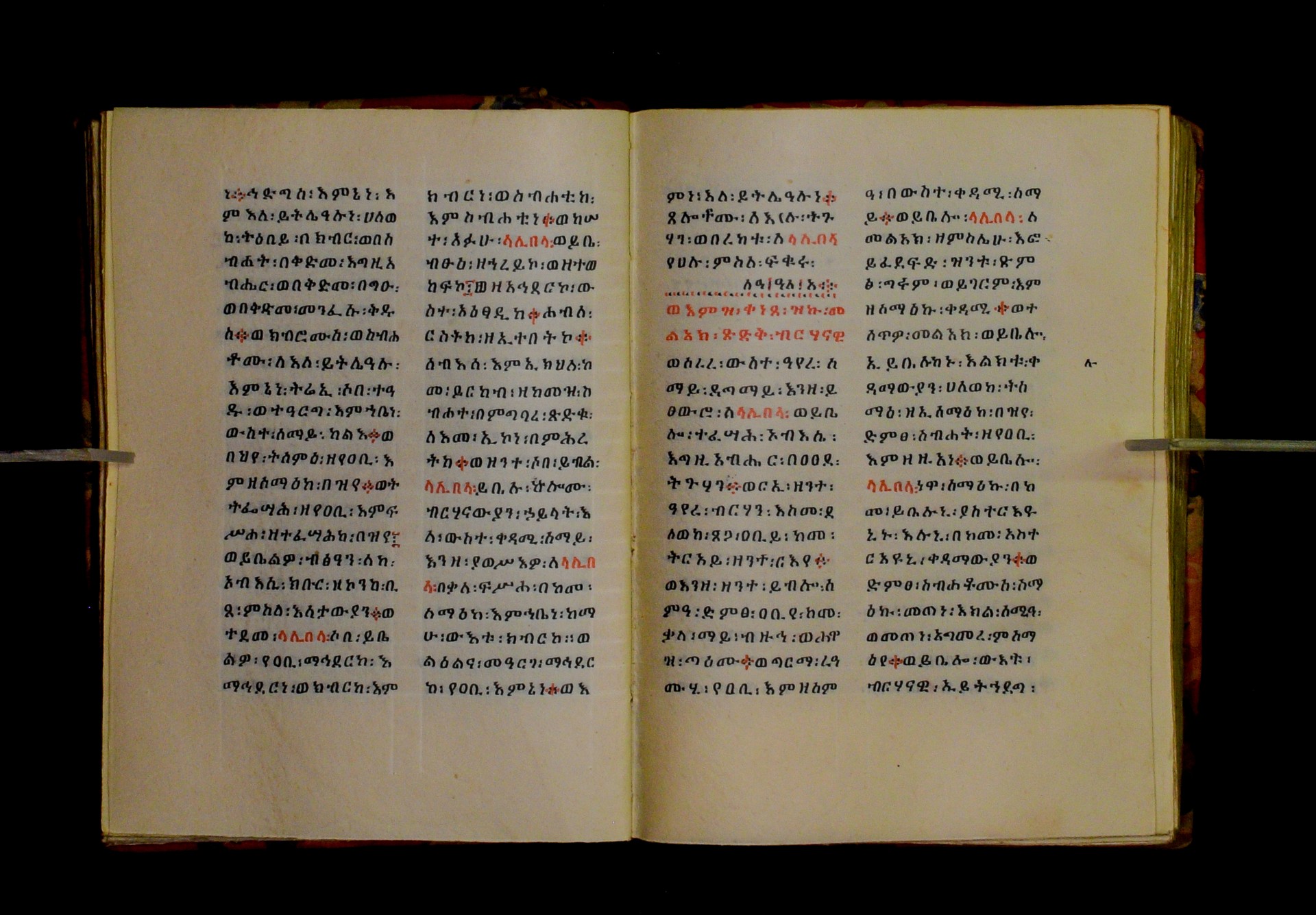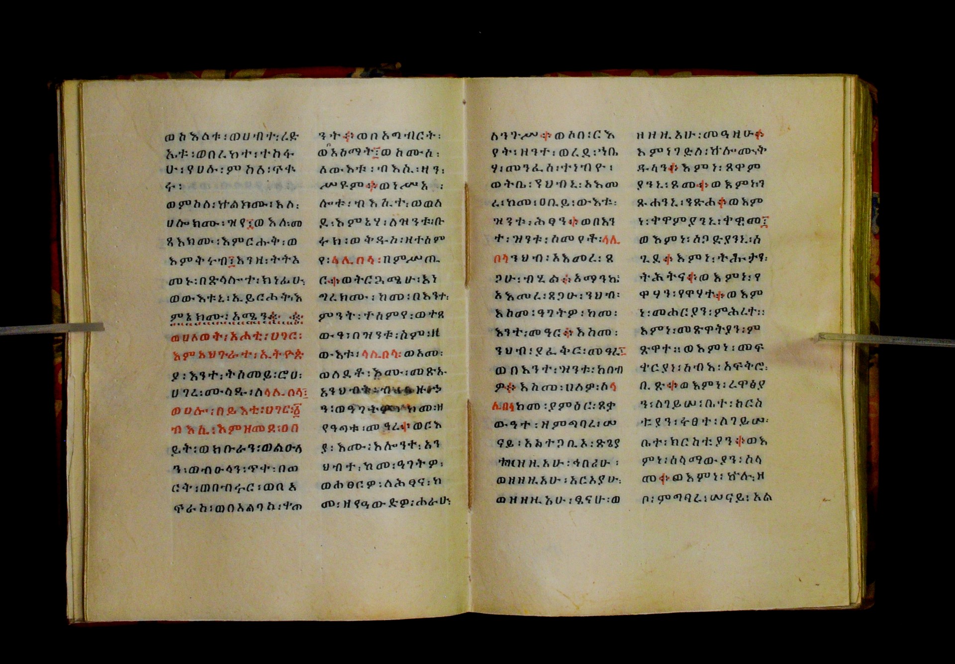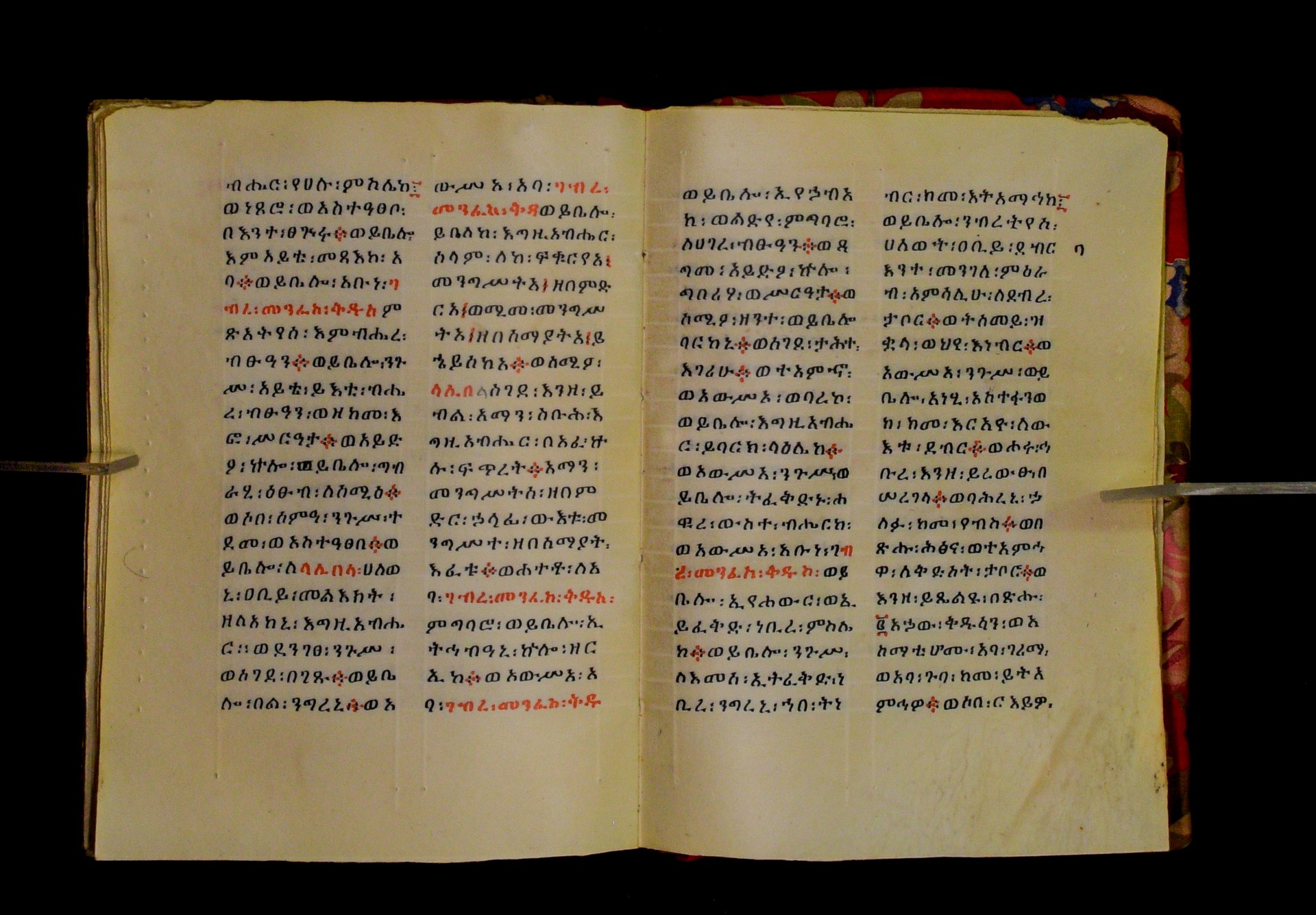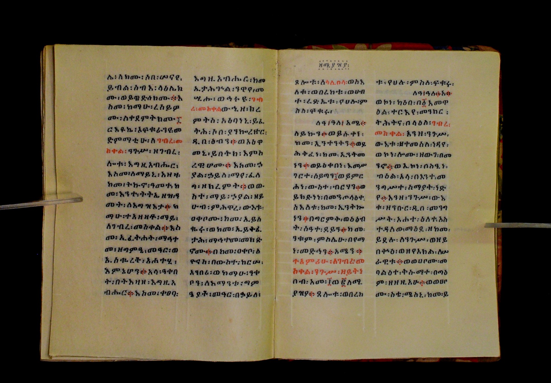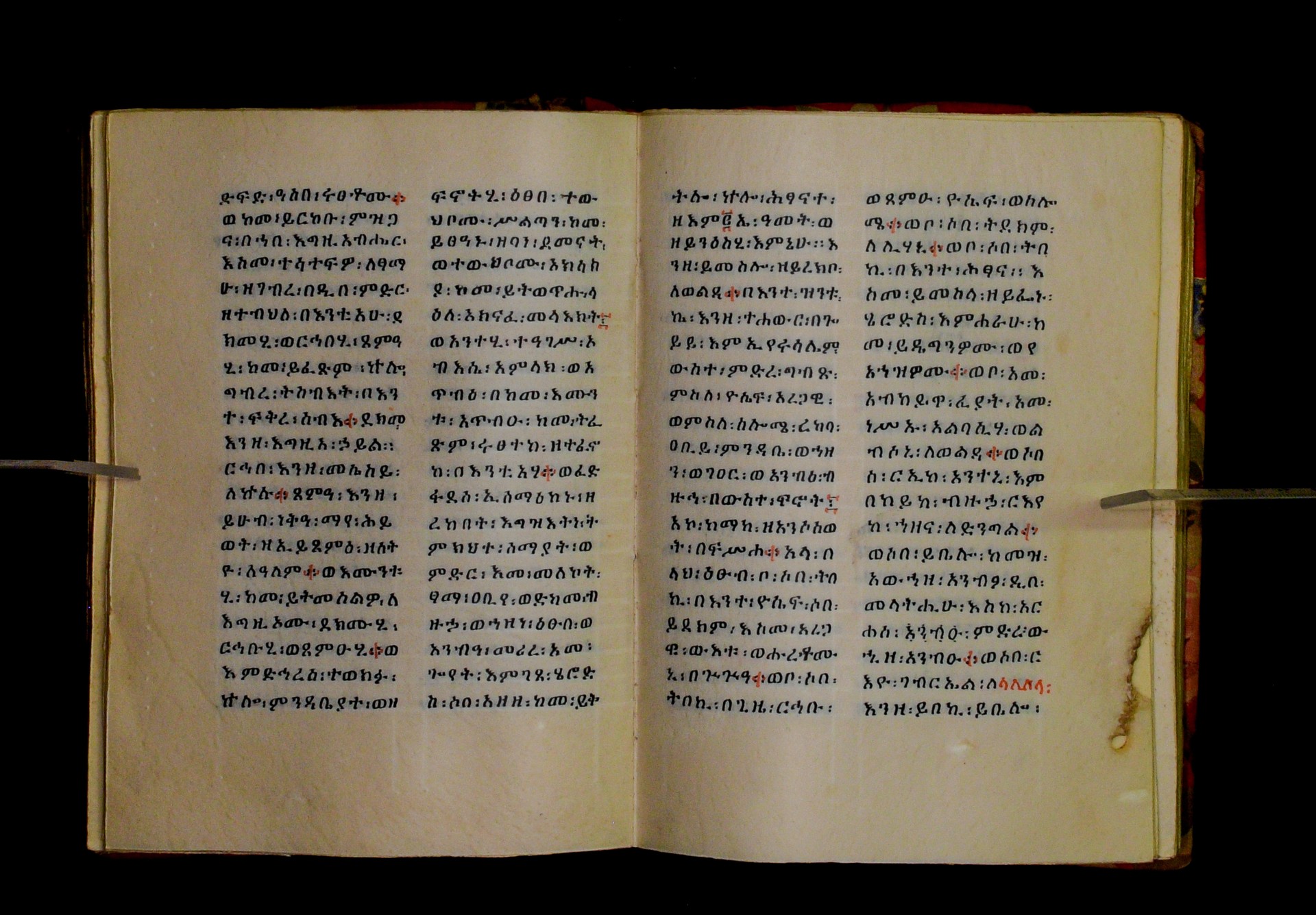 Indicated in black and red ink on the upper margin of the first folio of each quire: ff. 1r (፩,), 11r (፪), 21r (፫), 31r (፬), 41r (፭), 51r (፮), 61r (፯), 71r (፰), 81r (፱), 91r (፲), 101r (፲፩,), 111r (፲፪), 121r (፲፫). |