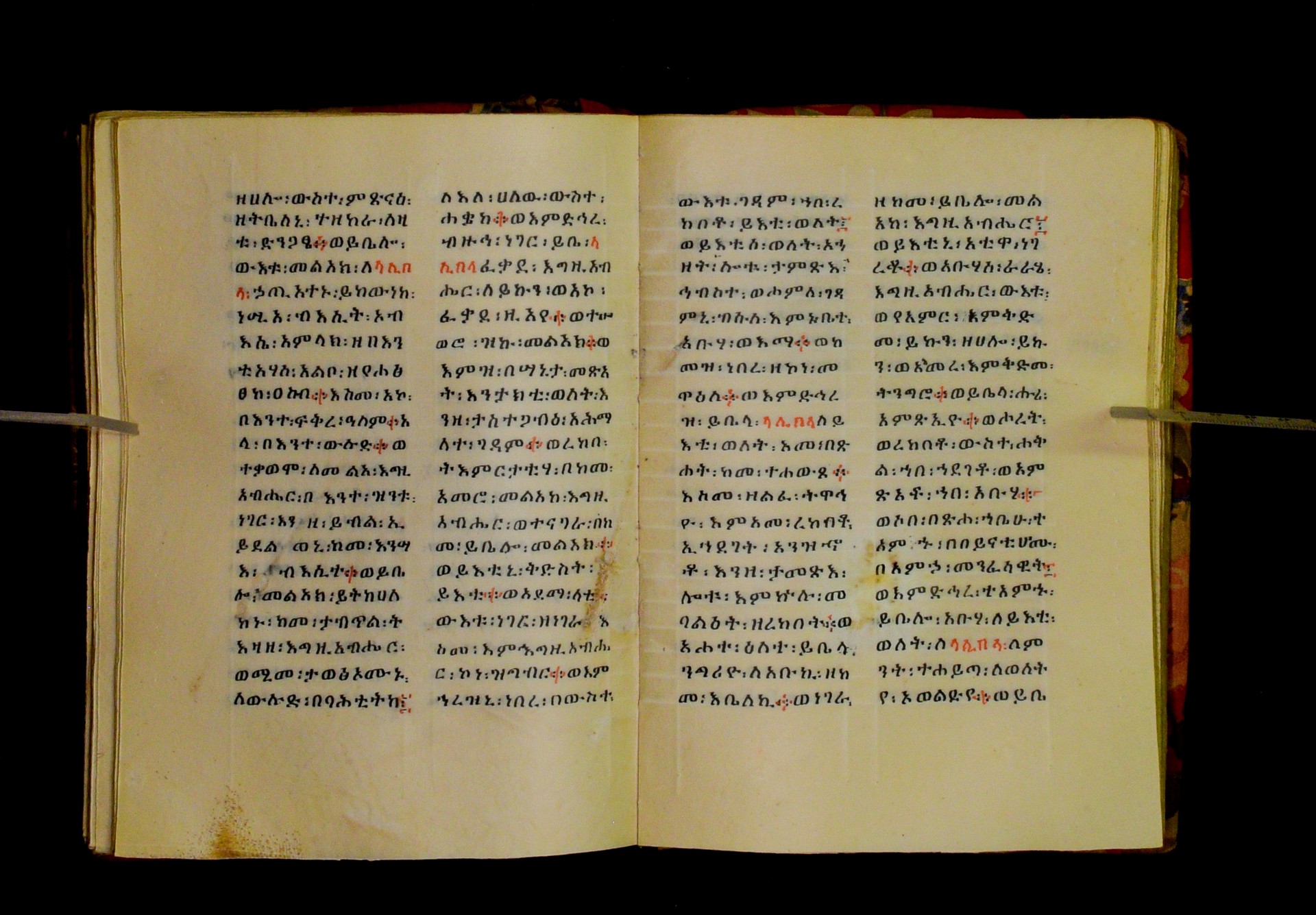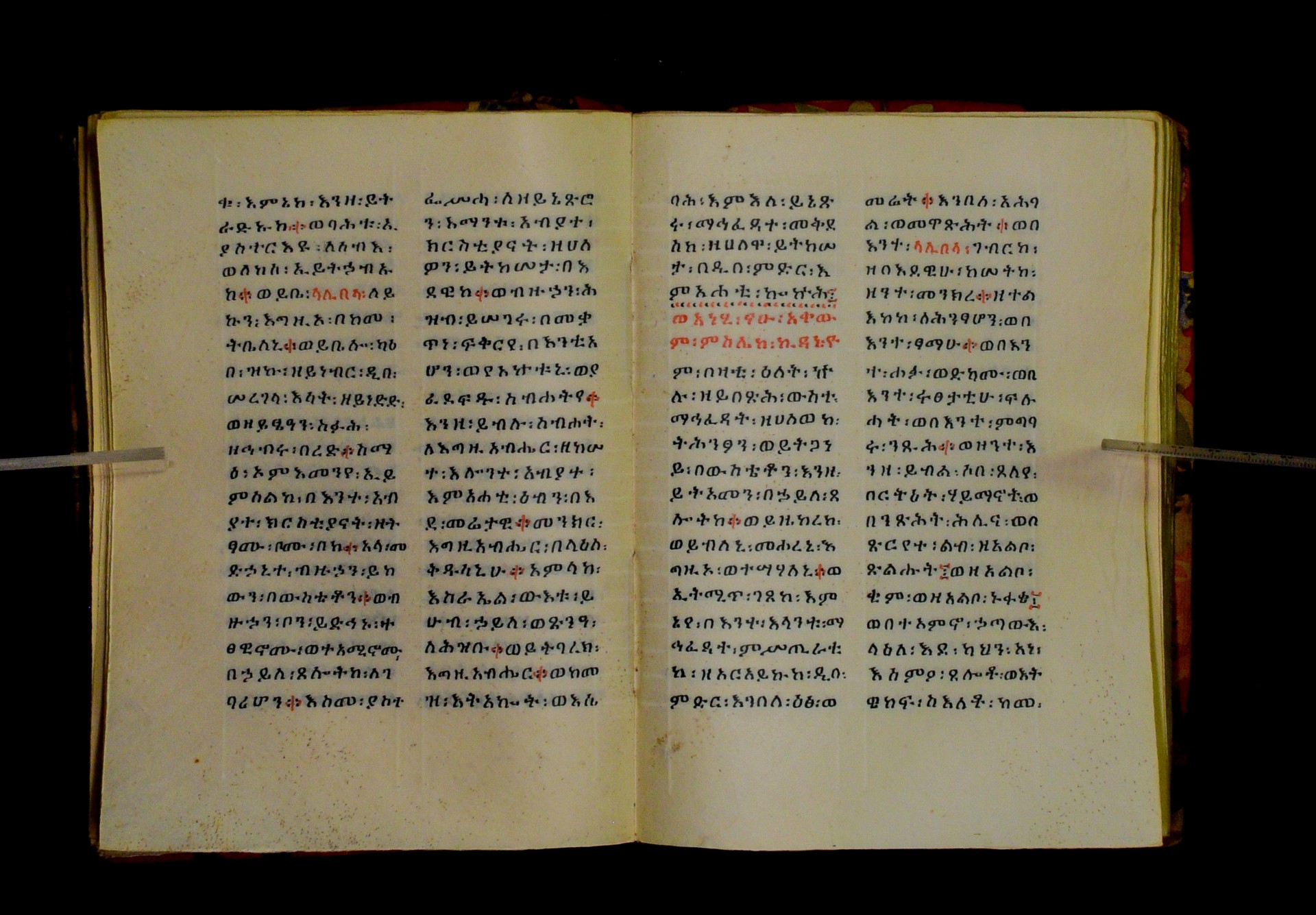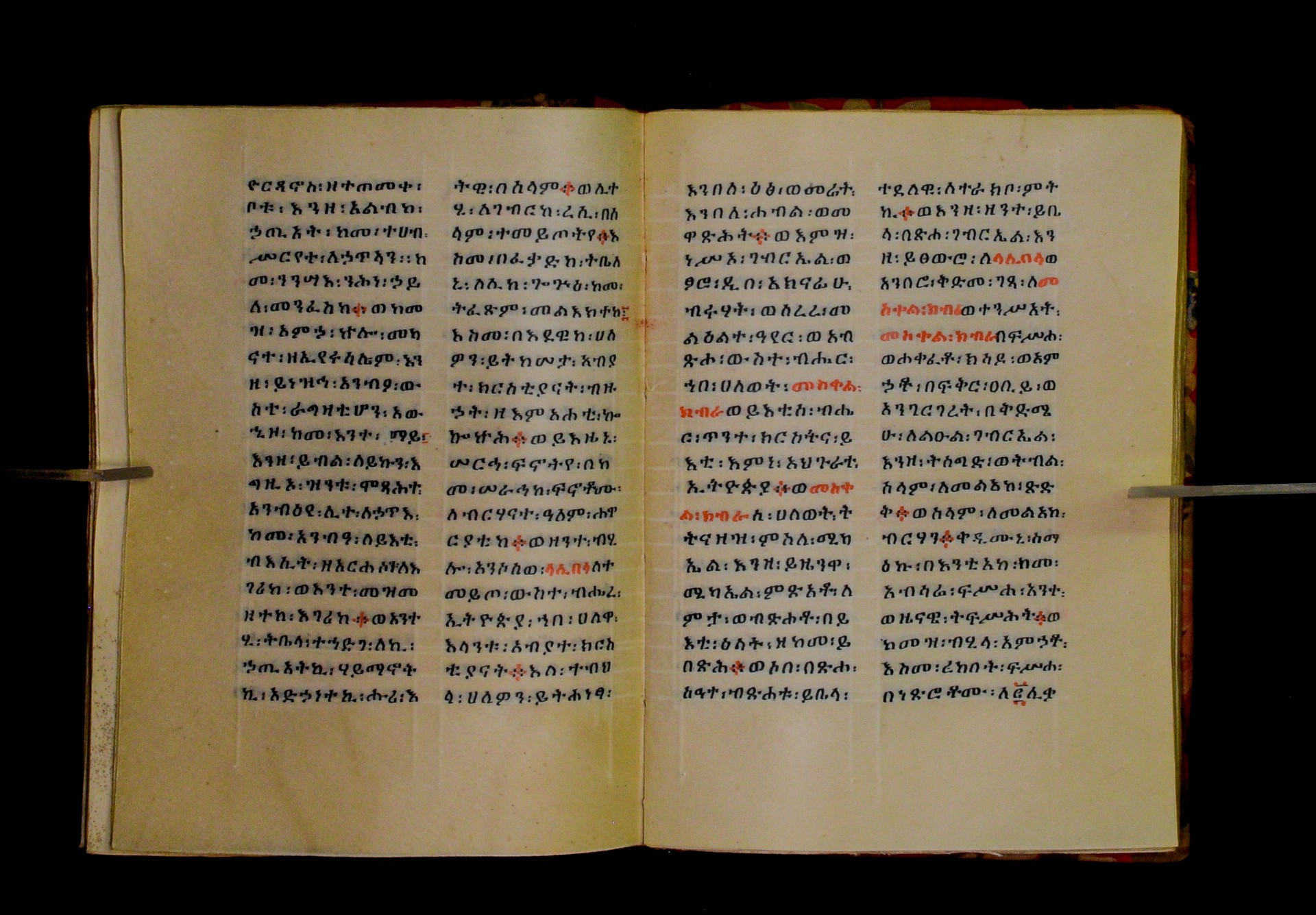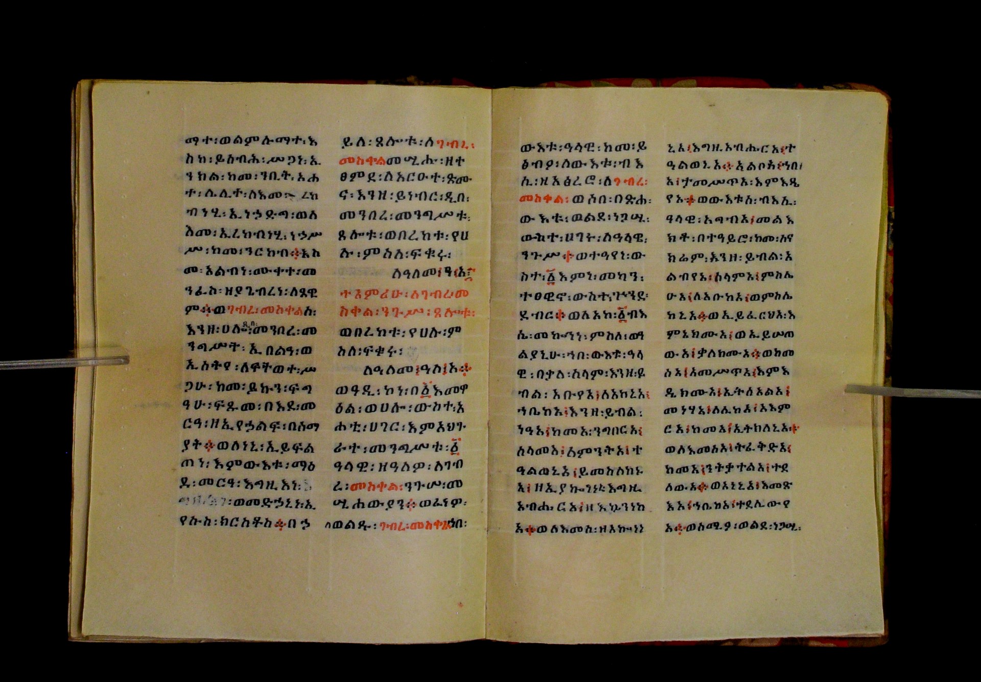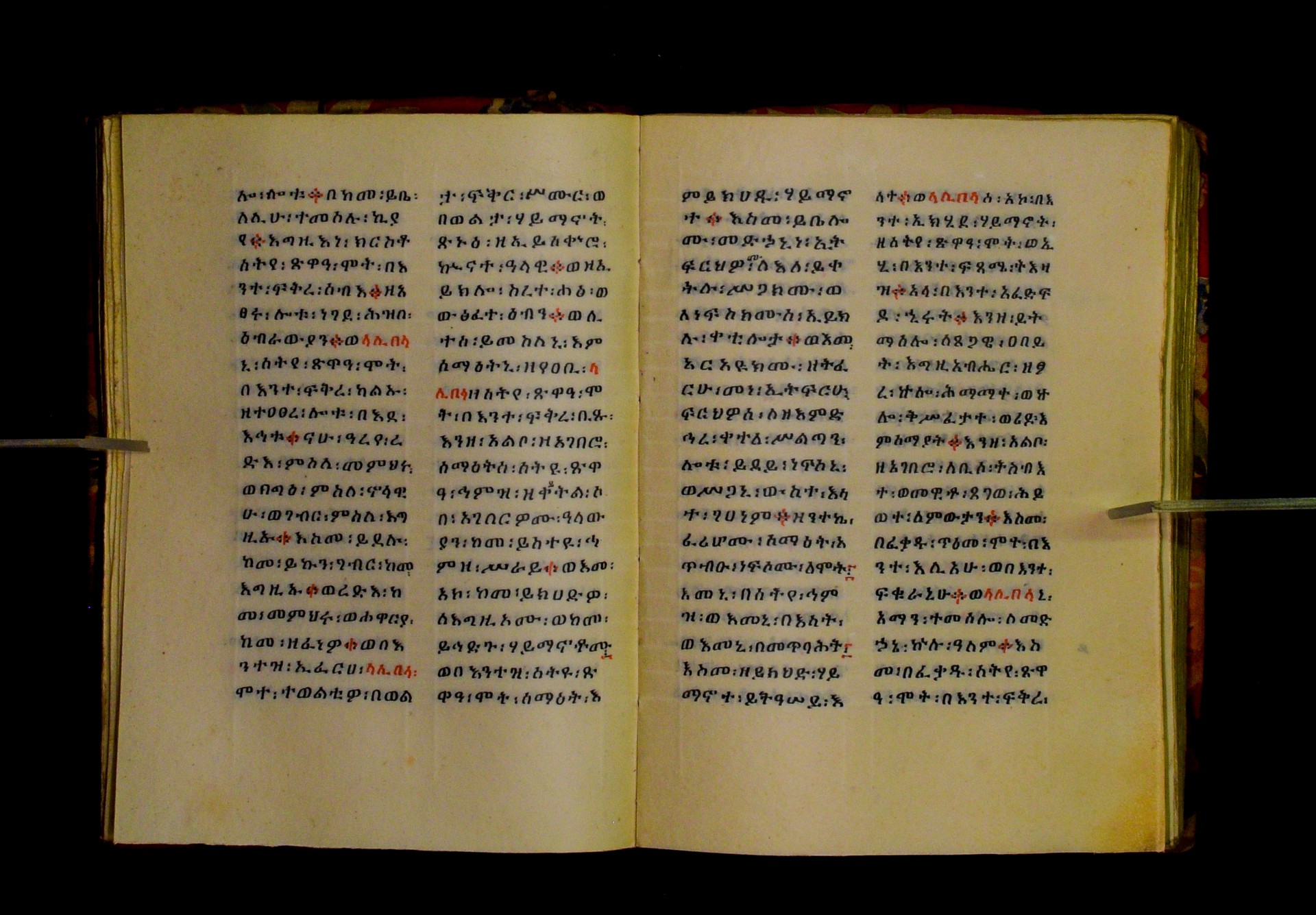 Indicated in black and red ink on the upper margin of the first folio of each quire: ff. 1r (፩,), 11r (፪), 21r (፫), 31r (፬), 41r (፭), 51r (፮), 61r (፯), 71r (፰), 81r (፱), 91r (፲), 101r (፲፩,), 111r (፲፪), 121r (፲፫). |