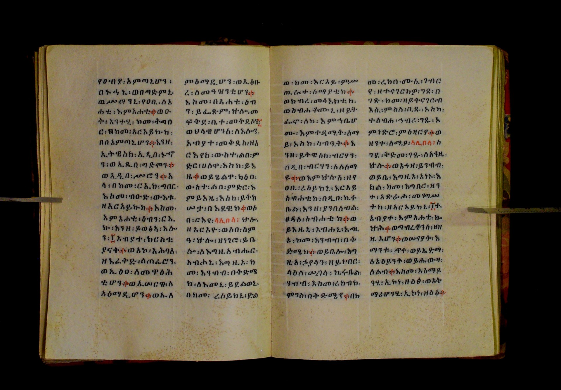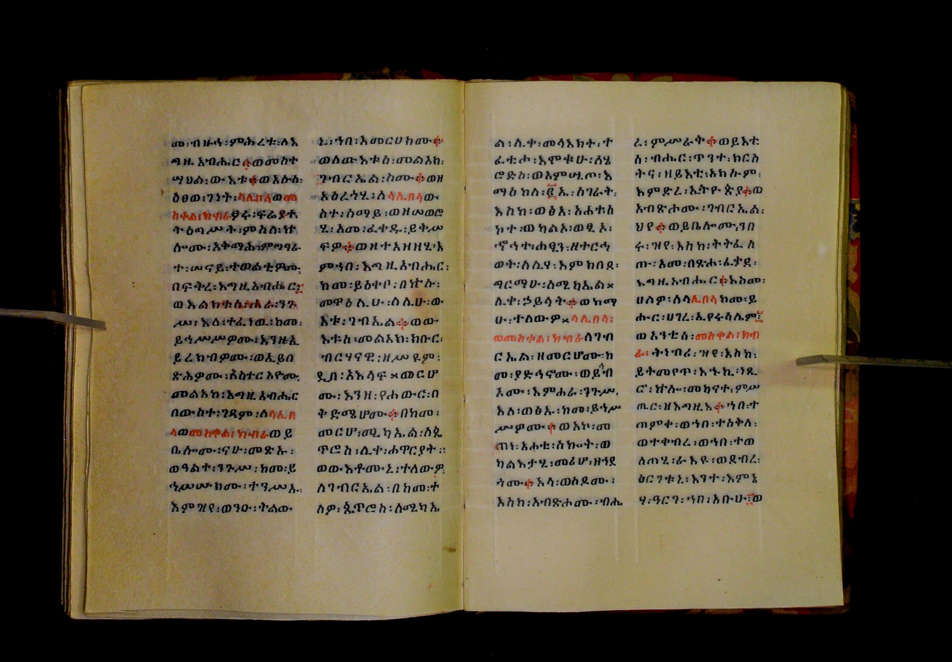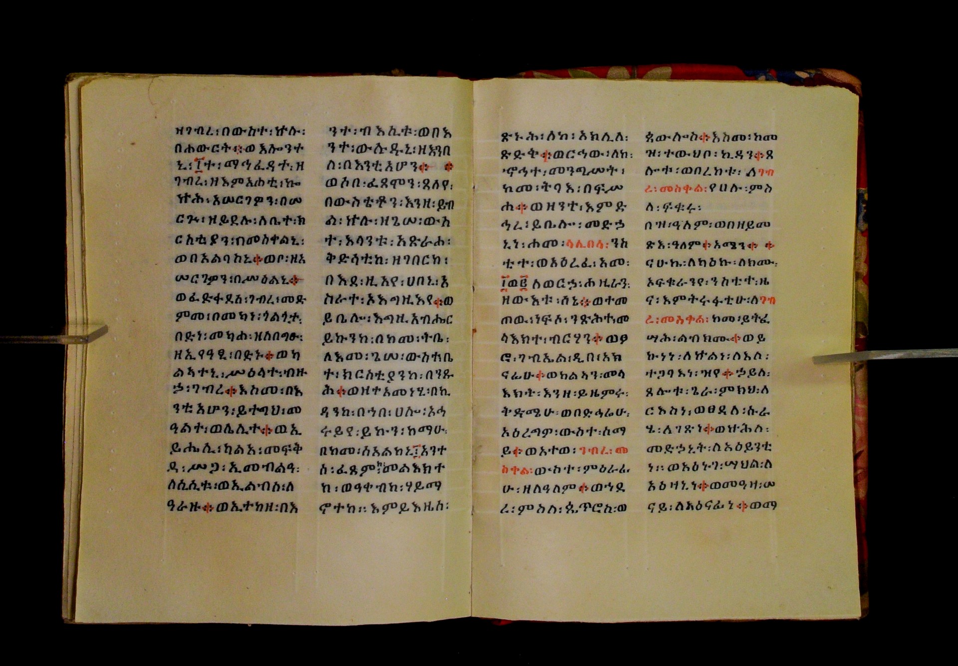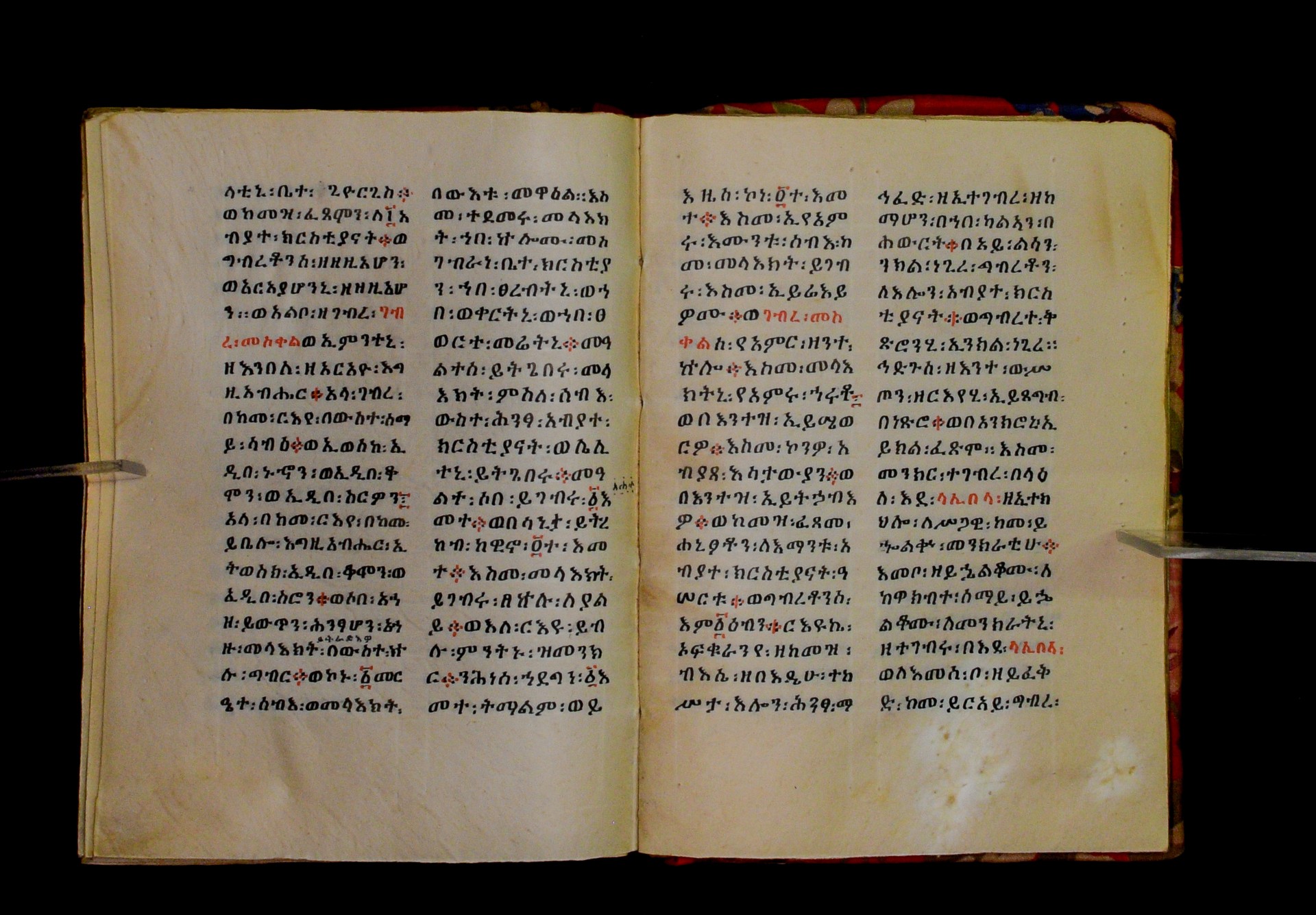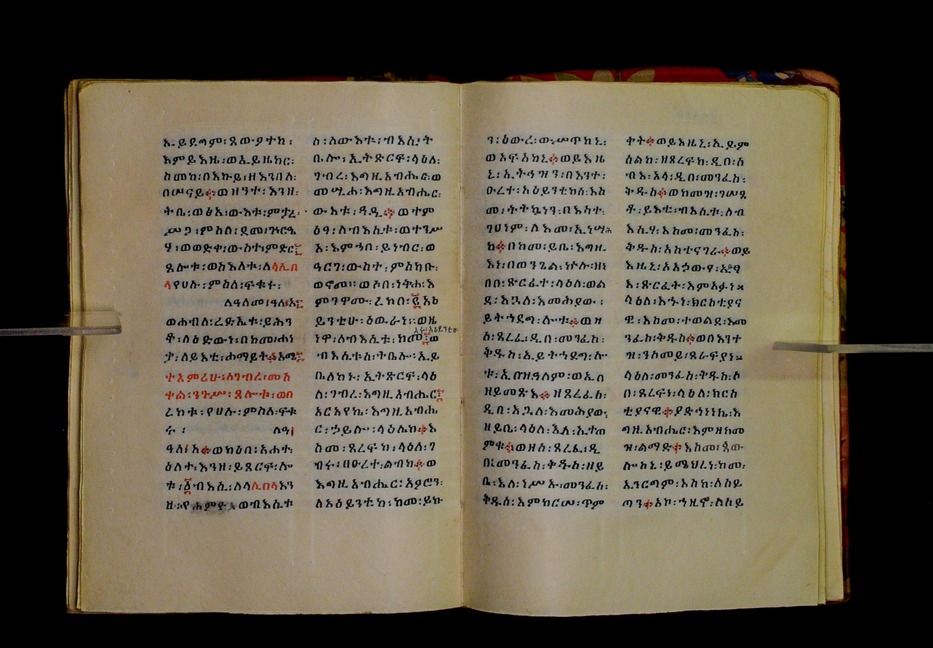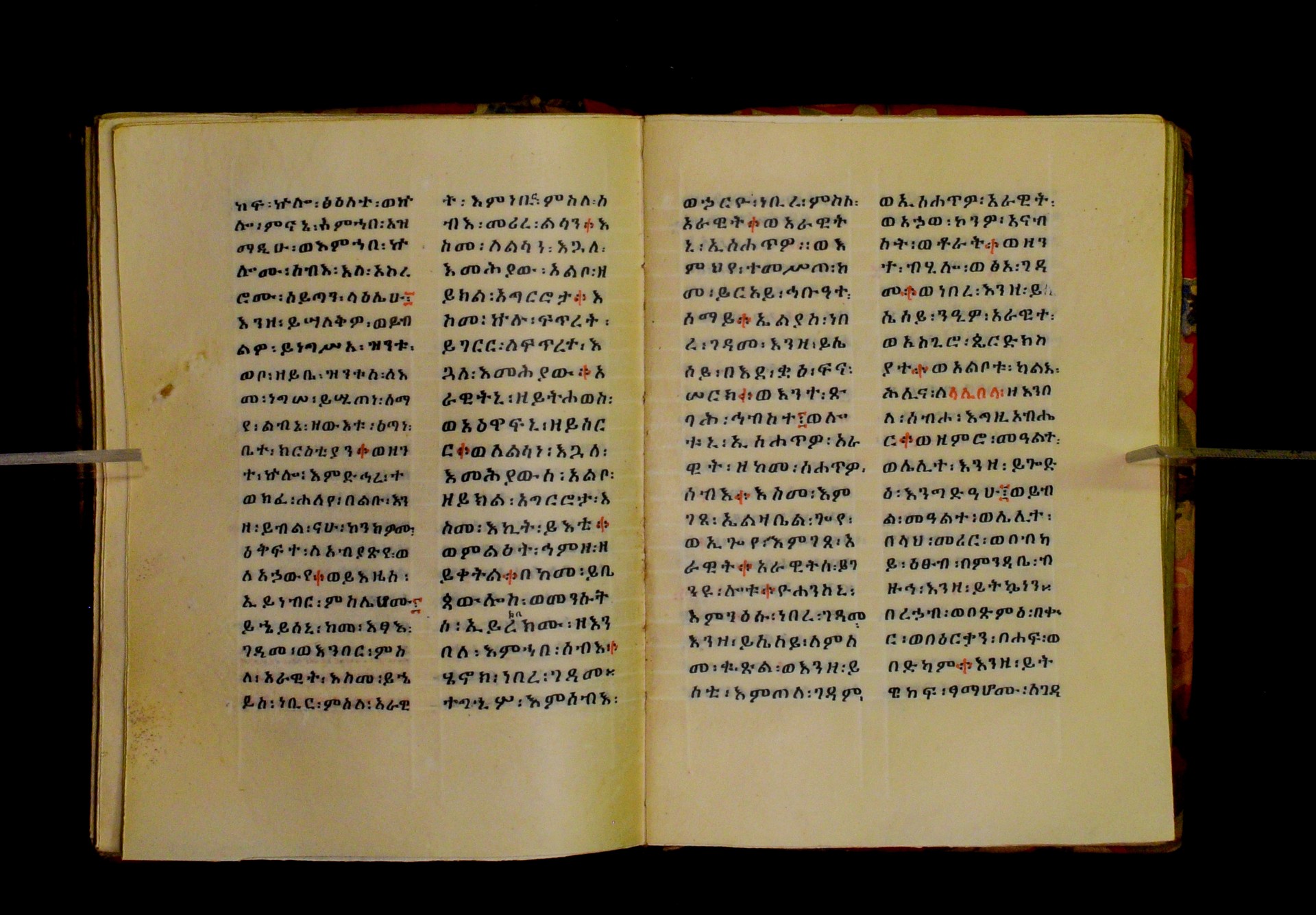 Indicated in black and red ink on the upper margin of the first folio of each quire: ff. 1r (፩,), 11r (፪), 21r (፫), 31r (፬), 41r (፭), 51r (፮), 61r (፯), 71r (፰), 81r (፱), 91r (፲), 101r (፲፩,), 111r (፲፪), 121r (፲፫). |