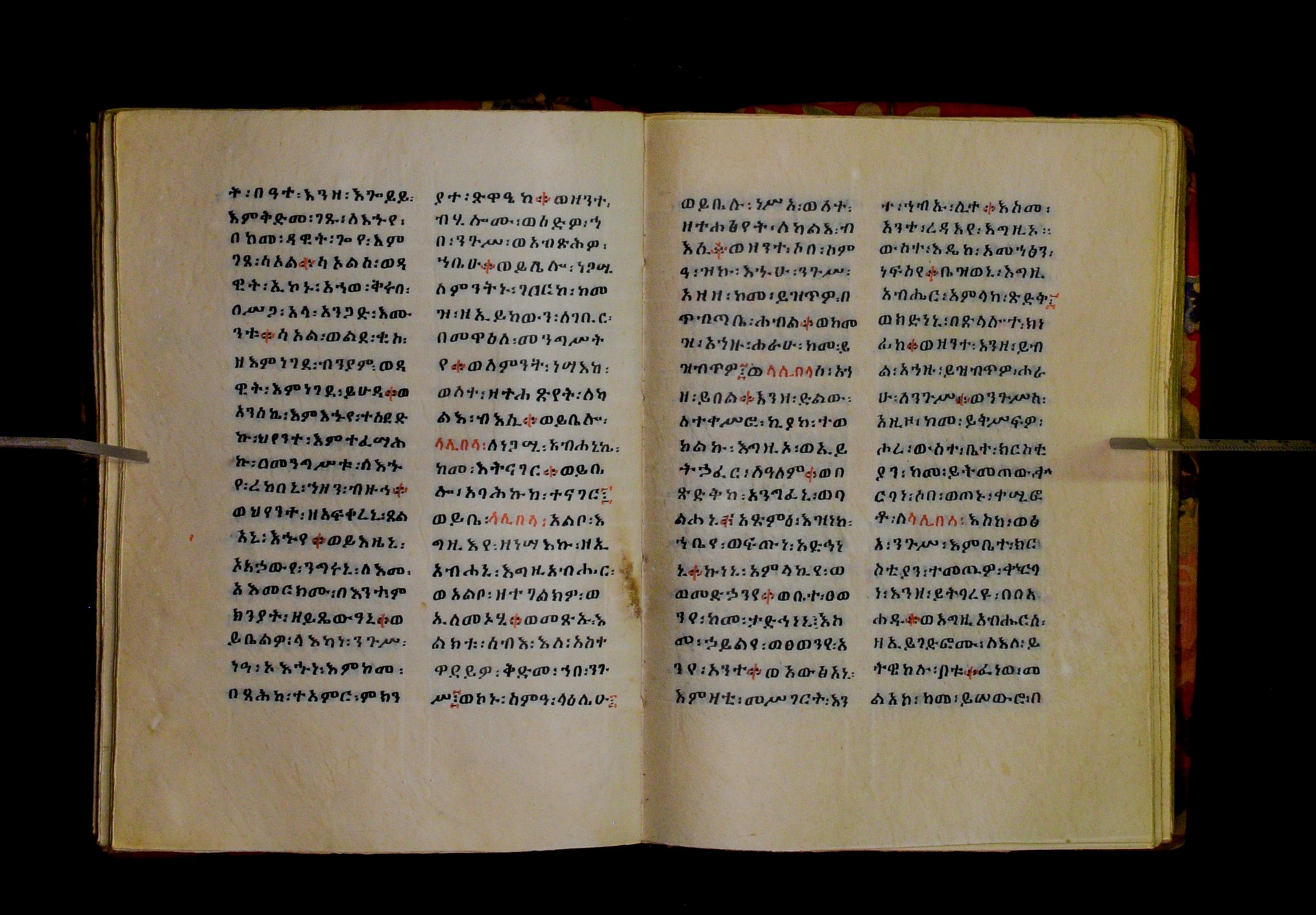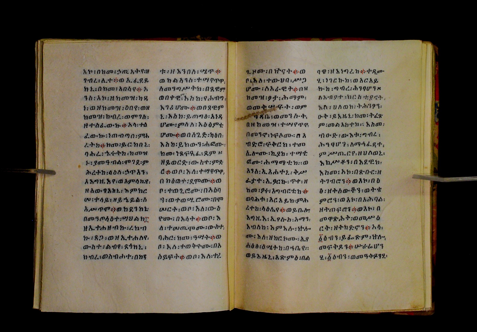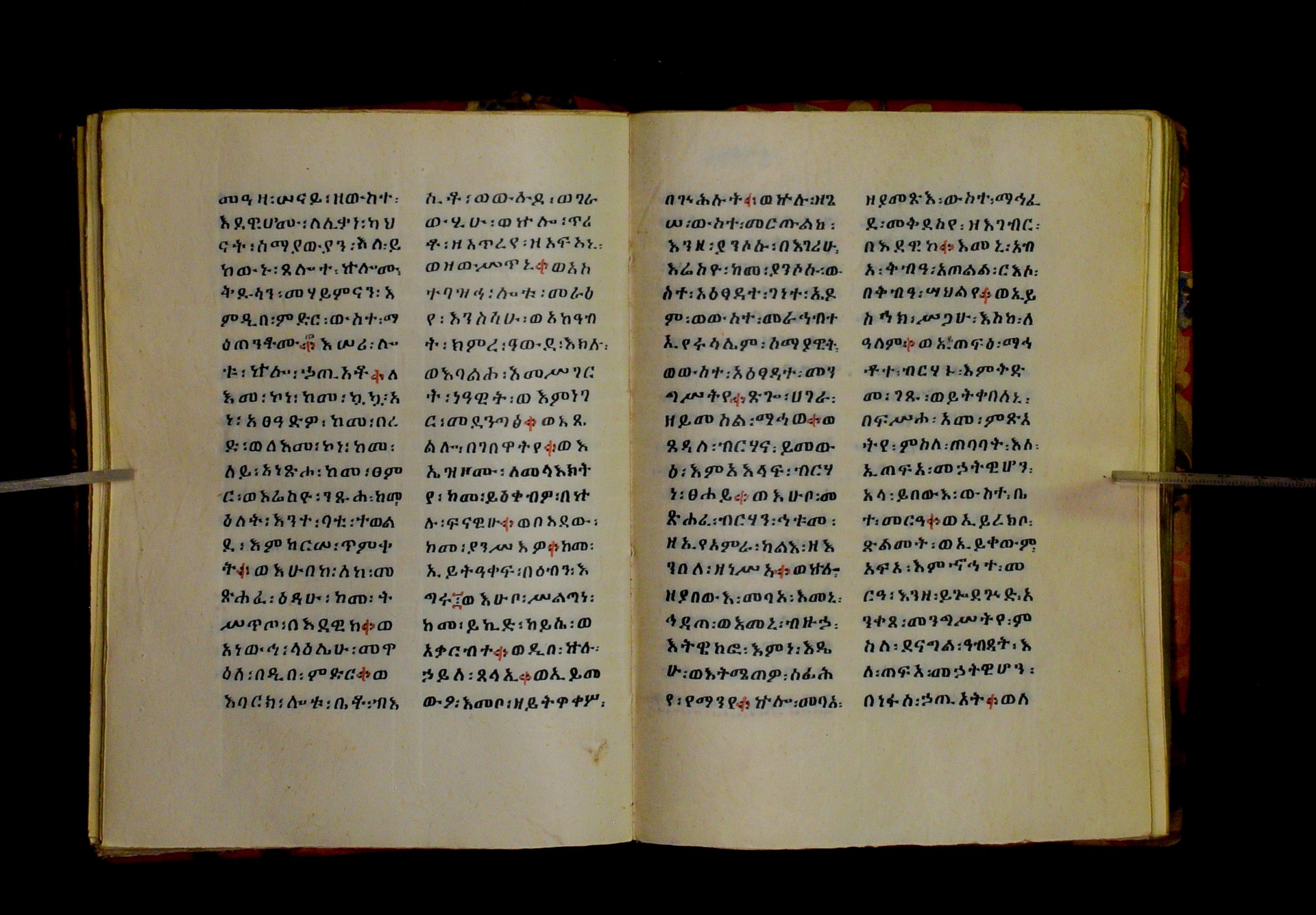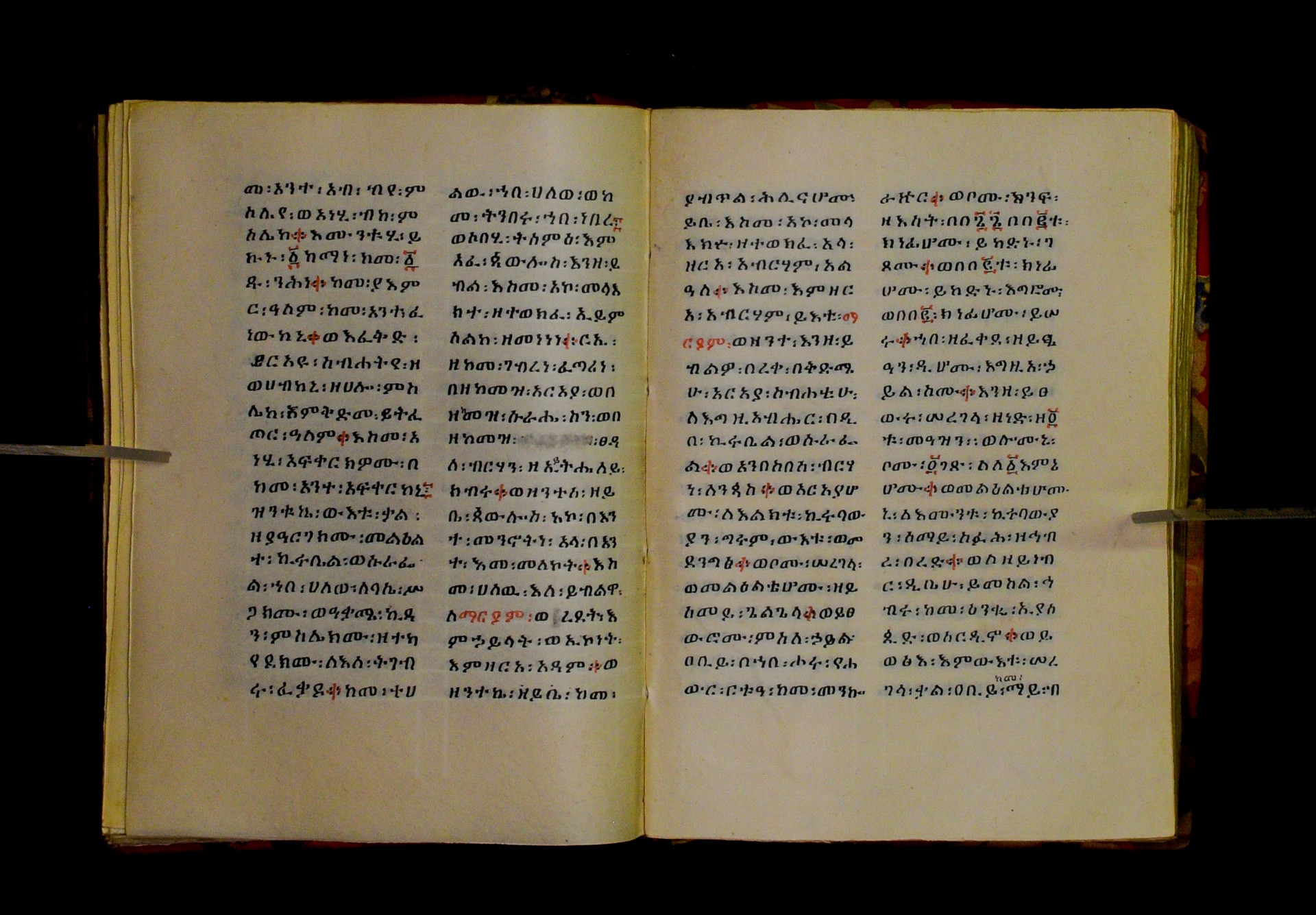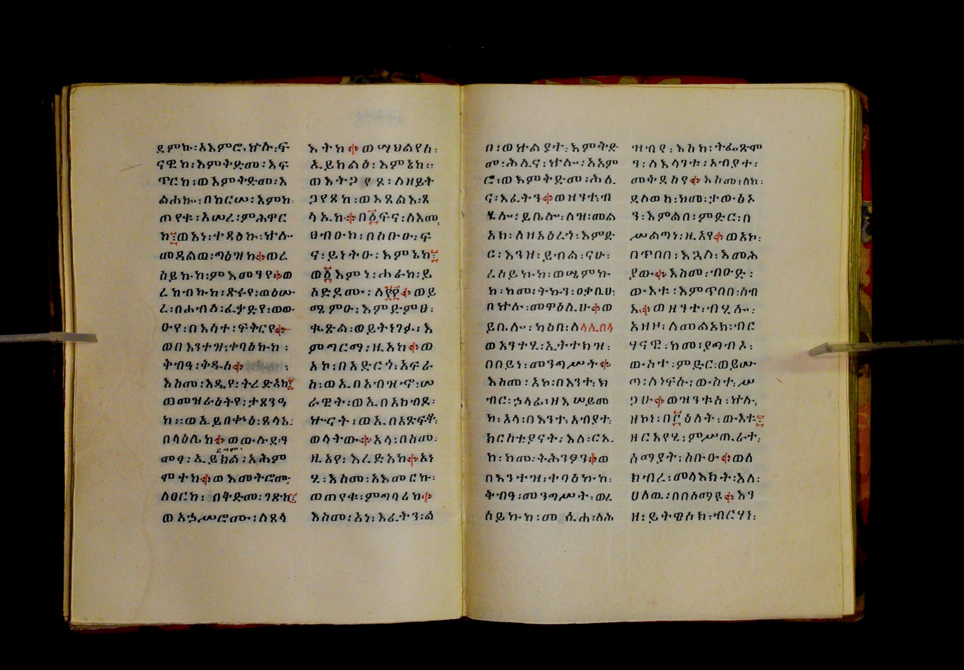 Indicated in black and red ink on the upper margin of the first folio of each quire: ff. 1r (፩,), 11r (፪), 21r (፫), 31r (፬), 41r (፭), 51r (፮), 61r (፯), 71r (፰), 81r (፱), 91r (፲), 101r (፲፩,), 111r (፲፪), 121r (፲፫). |