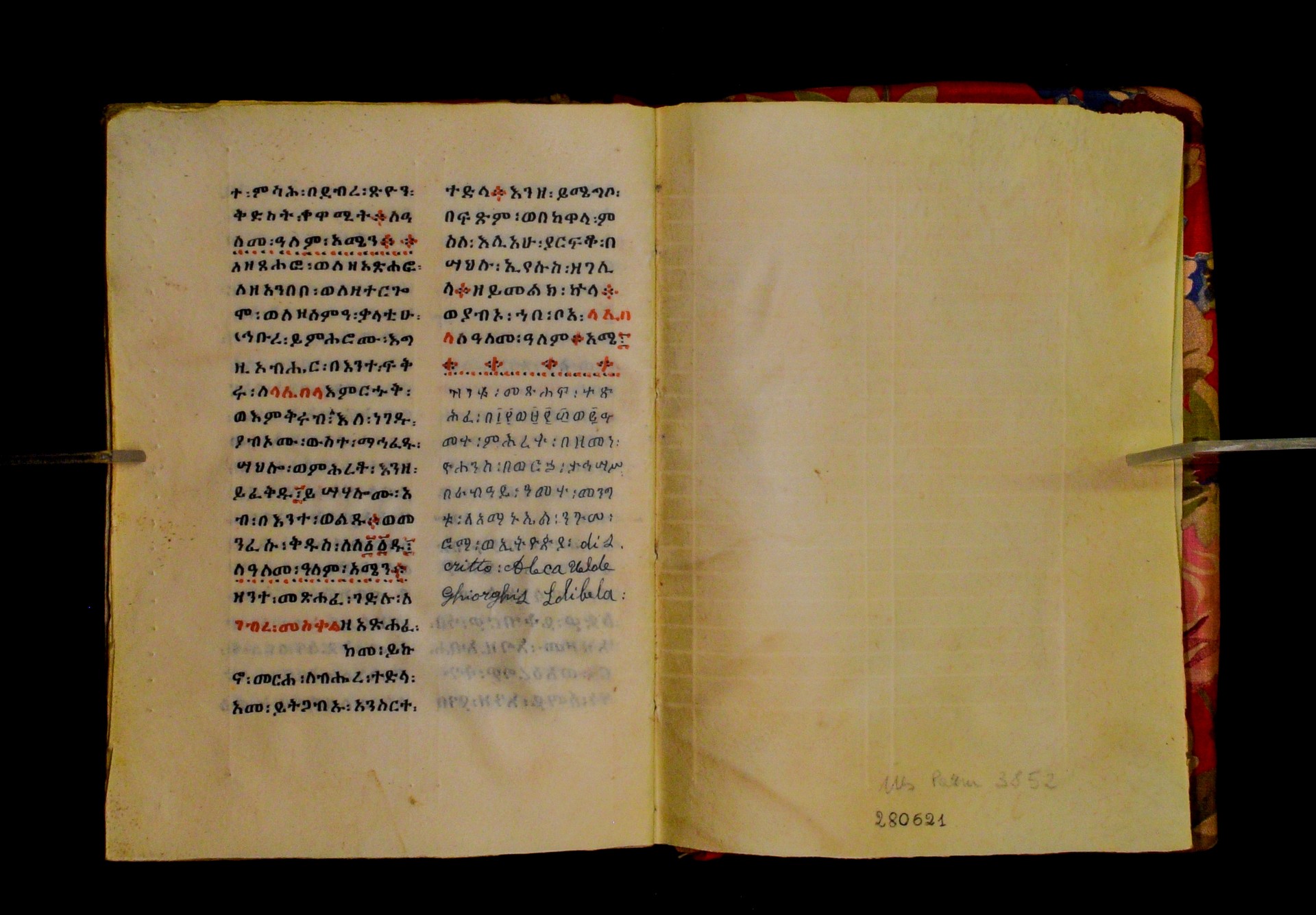 According to the colophon on f. 128vb, the manuscript was copied by a certain Aläqa Wäldä Giyorgis (also mentioned on ff. IVv, 57ra, 118va) in Sägänäyti (Eritrea) between December 1939 and January 1940. The scribe was presumably a Catholic Eritrean. The codex was presumably purchased by Mordini in the early 1940s and became part of his private collection in Barga (Lucca). In 1994 the Italian Ministry for Cultural Heritage bought the Mordini collection, which entered the Biblioteca Palatina in Parma (cf. Fiaccadori, G., 1995, ‘I manoscritti etiopici di Antonio Mordini’. Malacoda 57 (1995), 24–27). |
