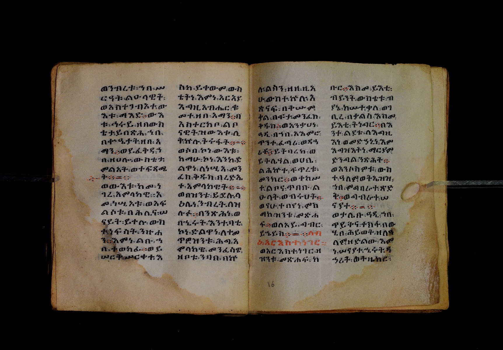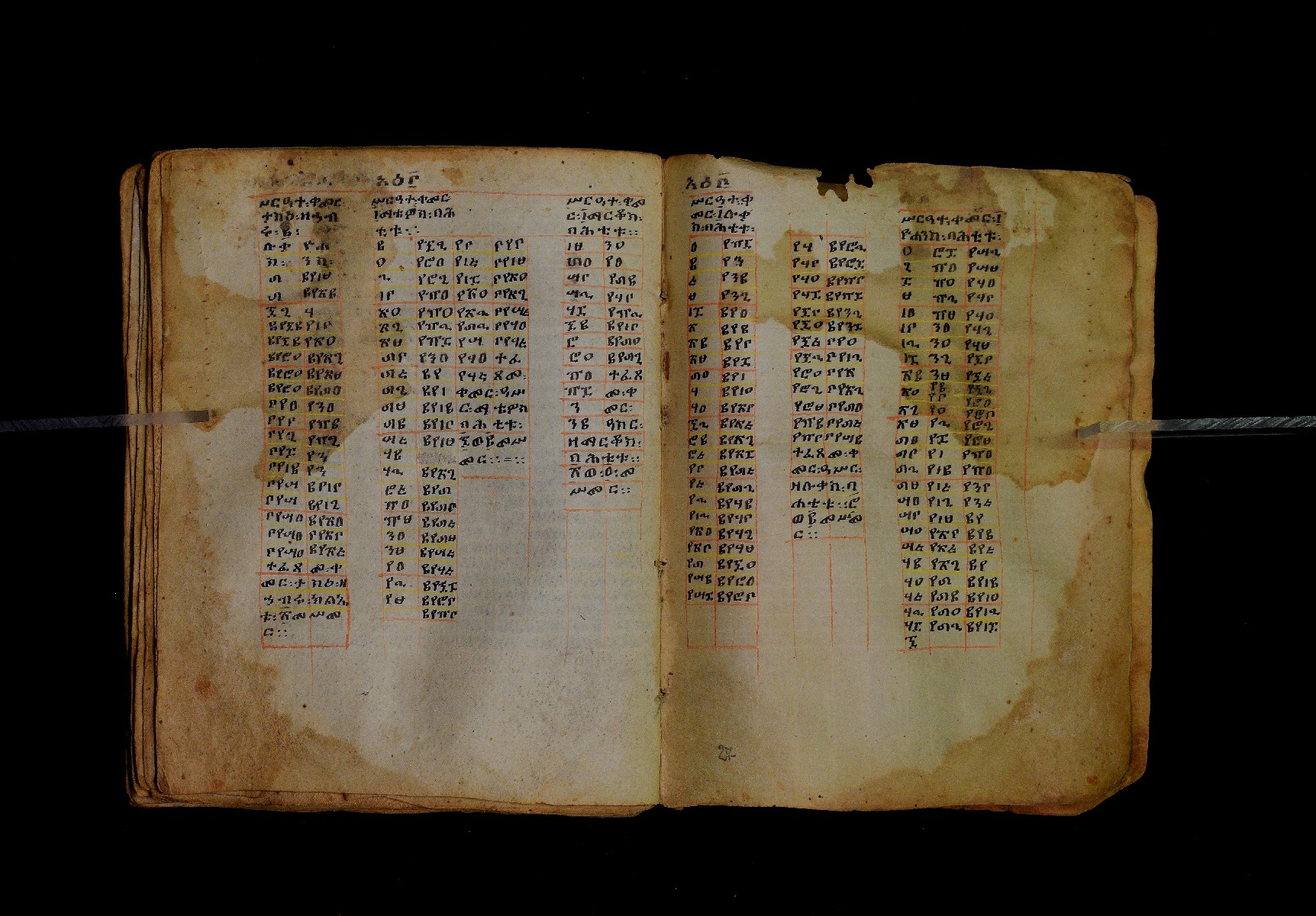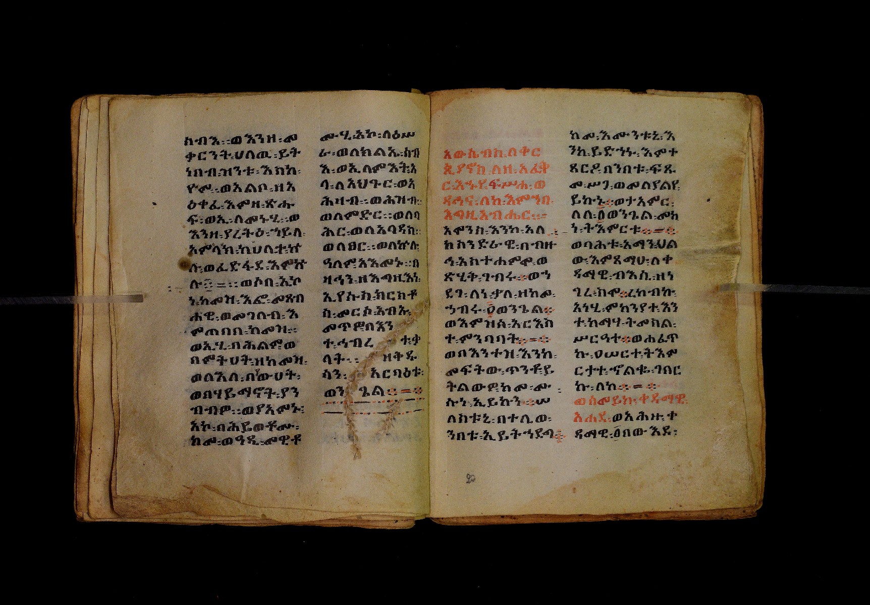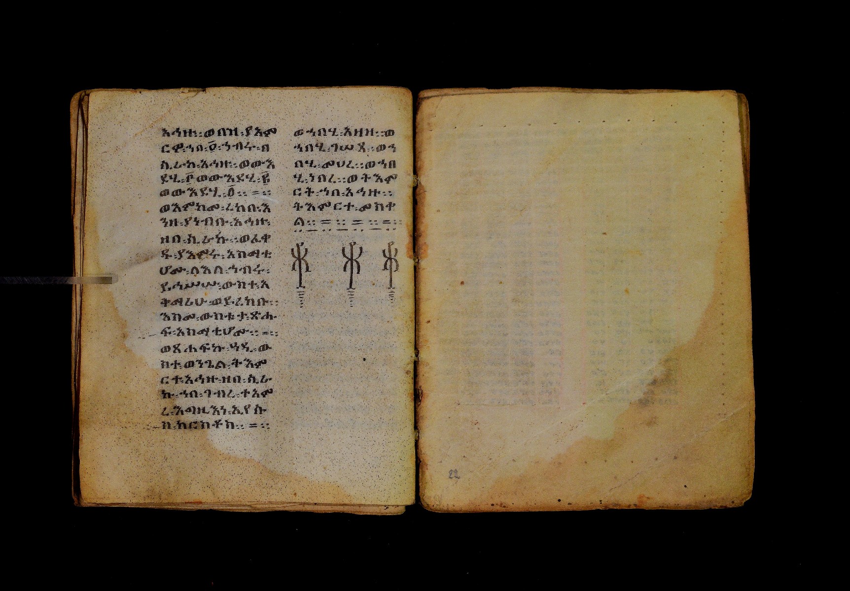Ff. 1ra–18rb: Mäqdǝmä wängel (“Introduction to the Gospels”), in seven chapters. Incipit: በስመ፡ አብ፡ … ንቅድም፡ በረድኤተ፡ እግዚአብሔር፡ ይትባረክ፡ እግዚአብሔር፡ ወይትሌዓል፡ ዝክሩ። ዘእምኔሁ፡ ኵሉ፡ ሢመተ፡ ኀይል። ወቦቱ፡ ተፍጻሜተ፡ ኵሉ፡ ስእለት። ወኀቤሁ፡ ምብጻሐ፡ ኵሉ፡ አስተብቍዖት። በጽሕፈተ፡ መቅድመ፡ ፬ወንጌላት፡ ስቡሐን። (!) አቅማራት፡ በሰላመ፡ እግዚአብሔር፡ አሜን። =። Ff. 18rb–19vb: Gǝṣṣawe śǝrʿat (“Synopsis of classes”) Incipit: በእንተ፡ ኅብረተ፡ ቃላት፡ ዘ፬ወንጌላት፡ ግጻዌ፡ ሥርዓት። =። ወእንዘ፡ ይተሉ፡ ረድኤተ፡ ፪ባሕቲቶሙ፡ ጸሐፉ፡ እንከ፡ ወንጌለ፡ እምሐዋርያት፡ ወ፪እመትሎሆሙ፡ ፩ዘጳውሎስ፡ ወ፩ዘጴጥሮስ፡ ዘድአ፡ ዚአሁ። ምስለ፡ ማቴዎስ፡ ወዮ(18va)ሐንስ፡ ጸሐፉ፡ እንከ፡ ወንጌላተ። እንዘ፡ ኢየኀሡ፡ ክብረ፡ ለርእሶሙ። አላ፡ በከመ፡ ይትፈቀድ። Ff. 20ra–21vb: Letter of Eusebius to Carpianus Incipit: አውሴብስ፡ ለቀርጲያኖስ፡ ለዘ፡ አፈቅር፡ እኁየ፡ ፍሥሐ፡ ወዳኅና፡ ለከ፡ እምኀብ፡ አግዚአብሔር። አሞንስ፡ እንከ፡ አለክስንድራዊ፡ በብዙኅ፡ አስተሐምሞ፡ ወጽሂቅ፡ ገብሩ። ወኀደገ፡ ለነ፡ ቃለ፡ ዘከመ፡ ኃብሩ፡ ፬ወንጌል። ወእምዝሰ፡ አርእስተ፡ ምንባባት። =። ወበእንተዝ፡ እንከ፡ መፍትው፡ ጥንቶ፡ ይትልውዎ፡ ከመ፡ ሙሱነ፡ ኢይኩን። ሠለስቱኒ፡ በተሊወ፡ ንበቱ፡ ኢይትኀደግ። Ff. 22v–27v: Śərʿatä qämär zäkämä ḫabru arbaʿǝttu (Canon tables). |
