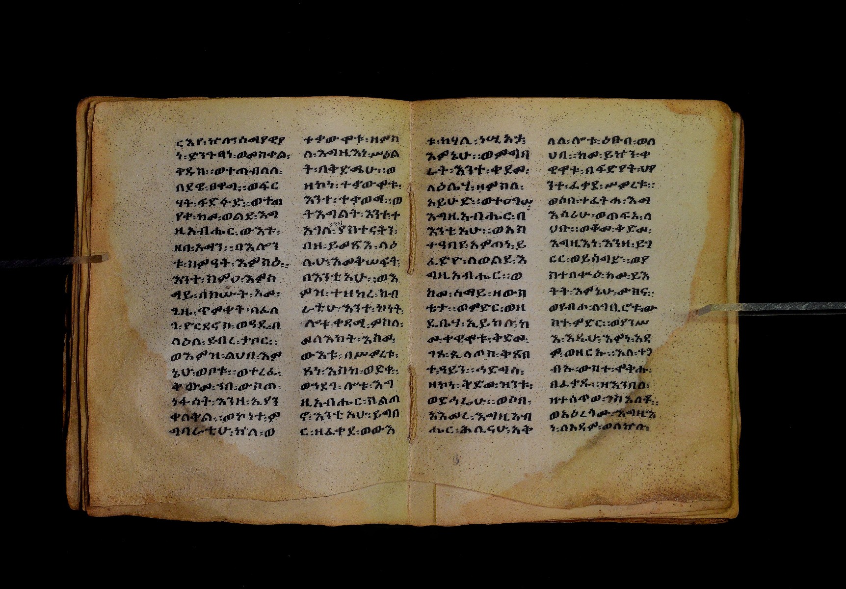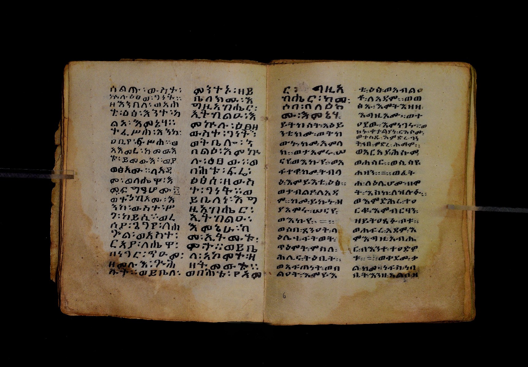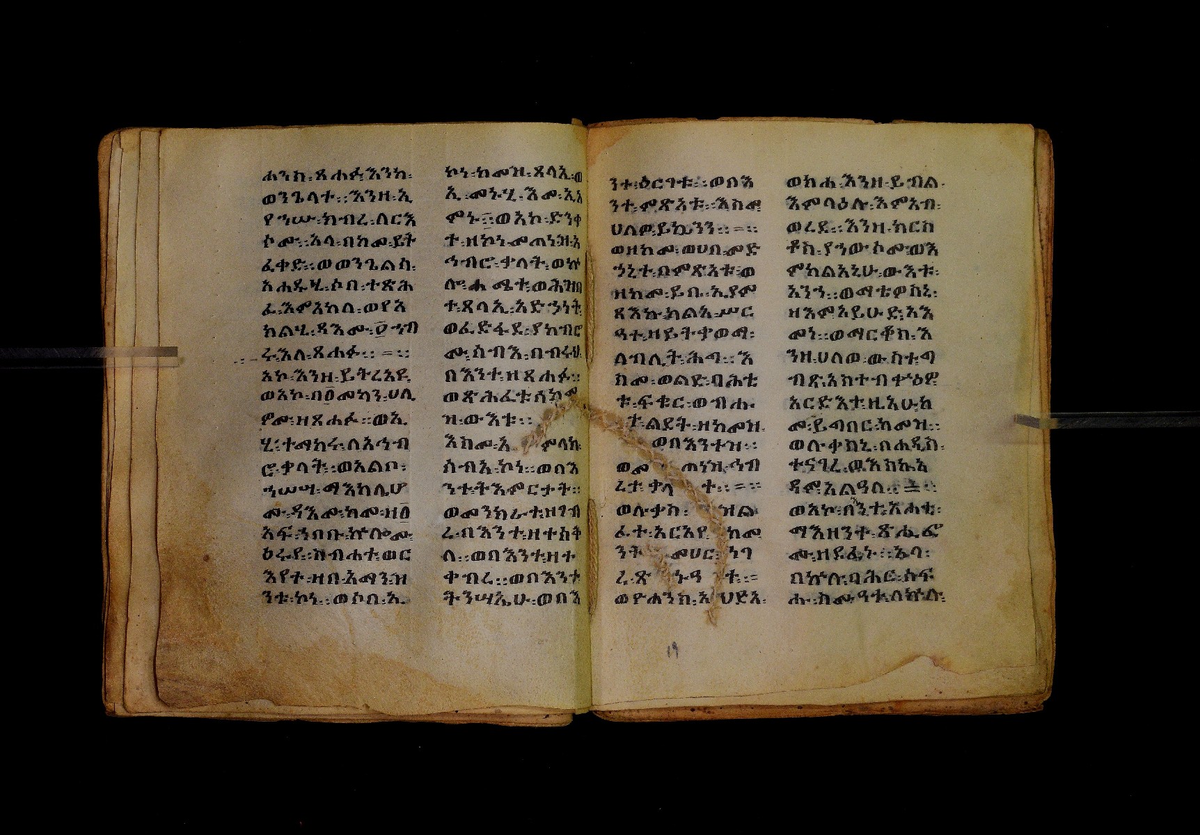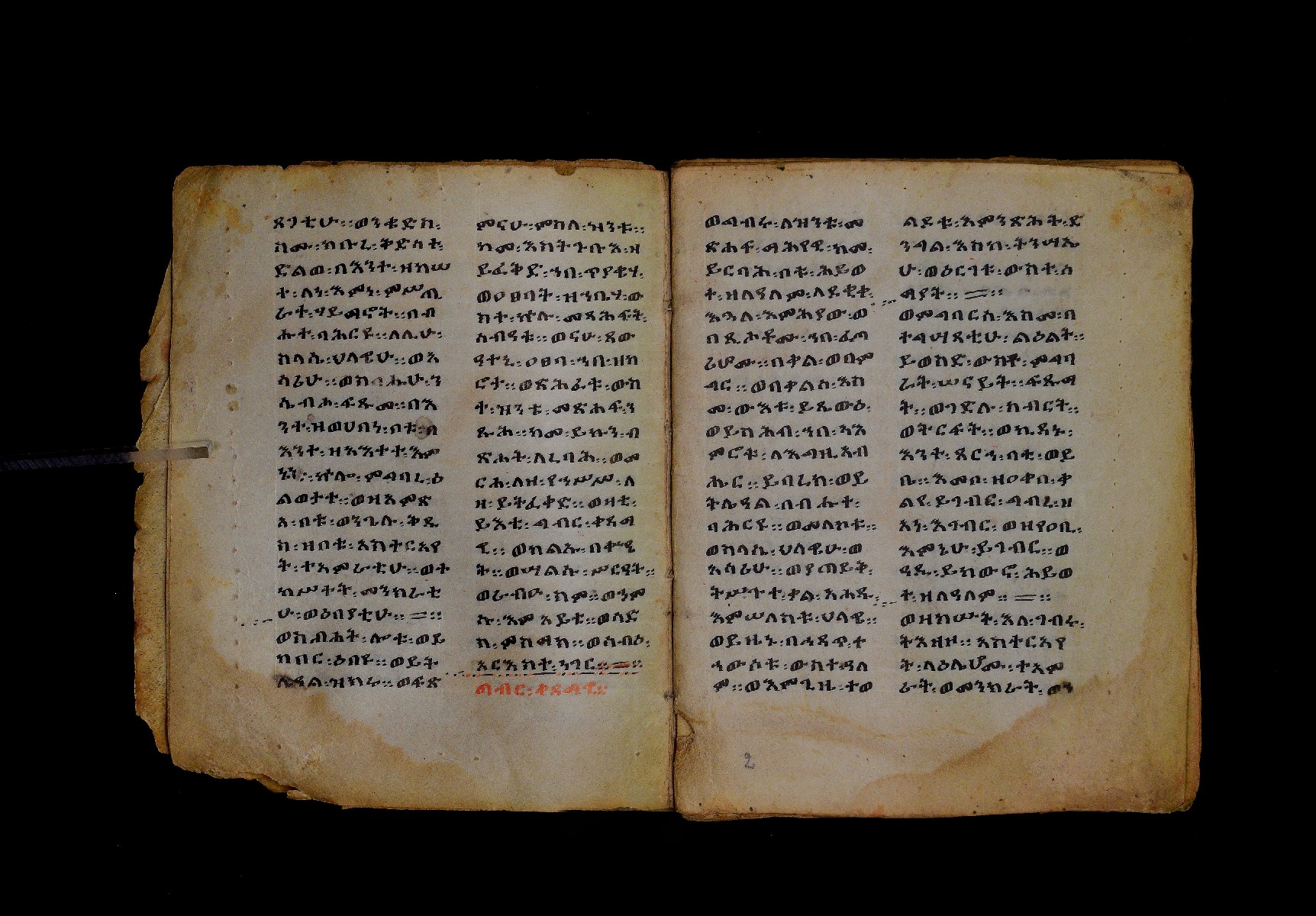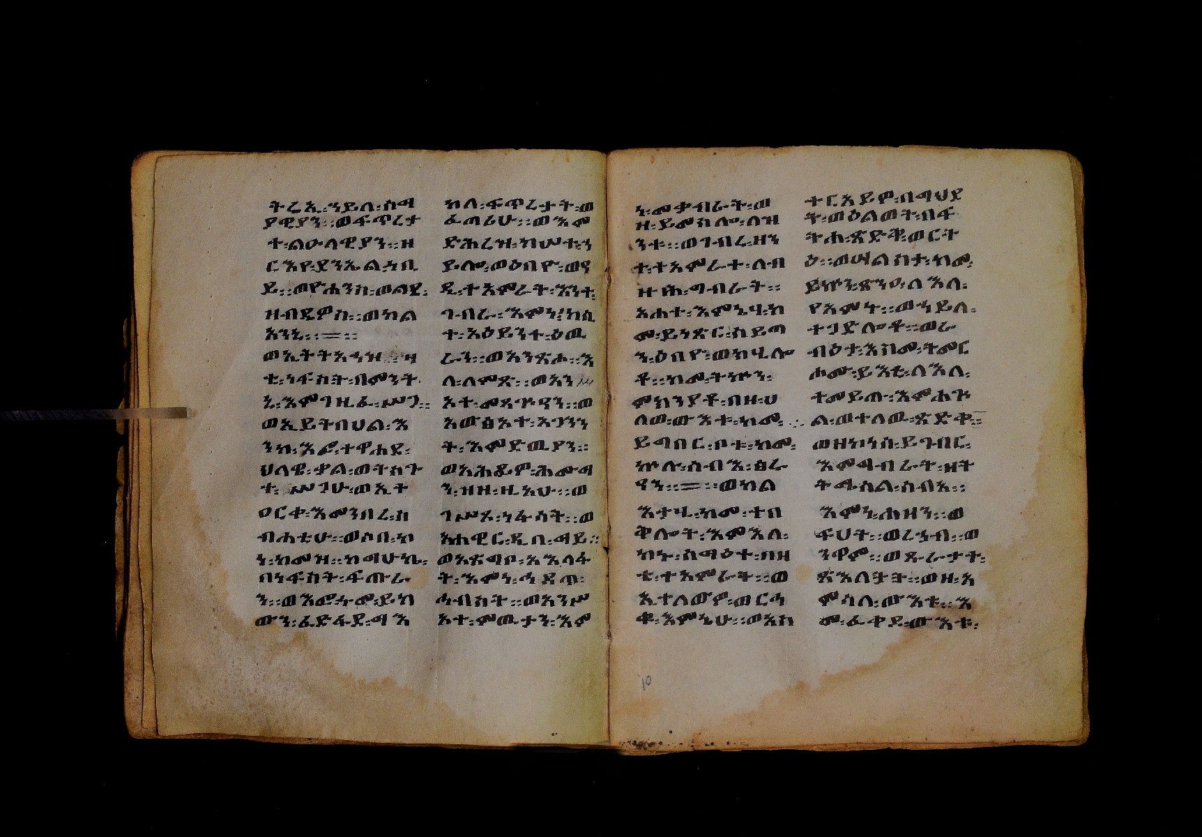 Ff. 1ra–18rb: Mäqdǝmä wängel (“Introduction to the Gospels”), in seven chapters. Incipit: በስመ፡ አብ፡ … ንቅድም፡ በረድኤተ፡ እግዚአብሔር፡ ይትባረክ፡ እግዚአብሔር፡ ወይትሌዓል፡ ዝክሩ። ዘእምኔሁ፡ ኵሉ፡ ሢመተ፡ ኀይል። ወቦቱ፡ ተፍጻሜተ፡ ኵሉ፡ ስእለት። ወኀቤሁ፡ ምብጻሐ፡ ኵሉ፡ አስተብቍዖት። በጽሕፈተ፡ መቅድመ፡ ፬ወንጌላት፡ ስቡሐን። (!) አቅማራት፡ በሰላመ፡ እግዚአብሔር፡ አሜን። =። Ff. 18rb–19vb: Gǝṣṣawe śǝrʿat (“Synopsis of classes”) Incipit: በእንተ፡ ኅብረተ፡ ቃላት፡ ዘ፬ወንጌላት፡ ግጻዌ፡ ሥርዓት። =። ወእንዘ፡ ይተሉ፡ ረድኤተ፡ ፪ባሕቲቶሙ፡ ጸሐፉ፡ እንከ፡ ወንጌለ፡ እምሐዋርያት፡ ወ፪እመትሎሆሙ፡ ፩ዘጳውሎስ፡ ወ፩ዘጴጥሮስ፡ ዘድአ፡ ዚአሁ። ምስለ፡ ማቴዎስ፡ ወዮ(18va)ሐንስ፡ ጸሐፉ፡ እንከ፡ ወንጌላተ። እንዘ፡ ኢየኀሡ፡ ክብረ፡ ለርእሶሙ። አላ፡ በከመ፡ ይትፈቀድ። Ff. 20ra–21vb: Letter of Eusebius to Carpianus Incipit: አውሴብስ፡ ለቀርጲያኖስ፡ ለዘ፡ አፈቅር፡ እኁየ፡ ፍሥሐ፡ ወዳኅና፡ ለከ፡ እምኀብ፡ አግዚአብሔር። አሞንስ፡ እንከ፡ አለክስንድራዊ፡ በብዙኅ፡ አስተሐምሞ፡ ወጽሂቅ፡ ገብሩ። ወኀደገ፡ ለነ፡ ቃለ፡ ዘከመ፡ ኃብሩ፡ ፬ወንጌል። ወእምዝሰ፡ አርእስተ፡ ምንባባት። =። ወበእንተዝ፡ እንከ፡ መፍትው፡ ጥንቶ፡ ይትልውዎ፡ ከመ፡ ሙሱነ፡ ኢይኩን። ሠለስቱኒ፡ በተሊወ፡ ንበቱ፡ ኢይትኀደግ። Ff. 22v–27v: Śərʿatä qämär zäkämä ḫabru arbaʿǝttu (Canon tables). |
