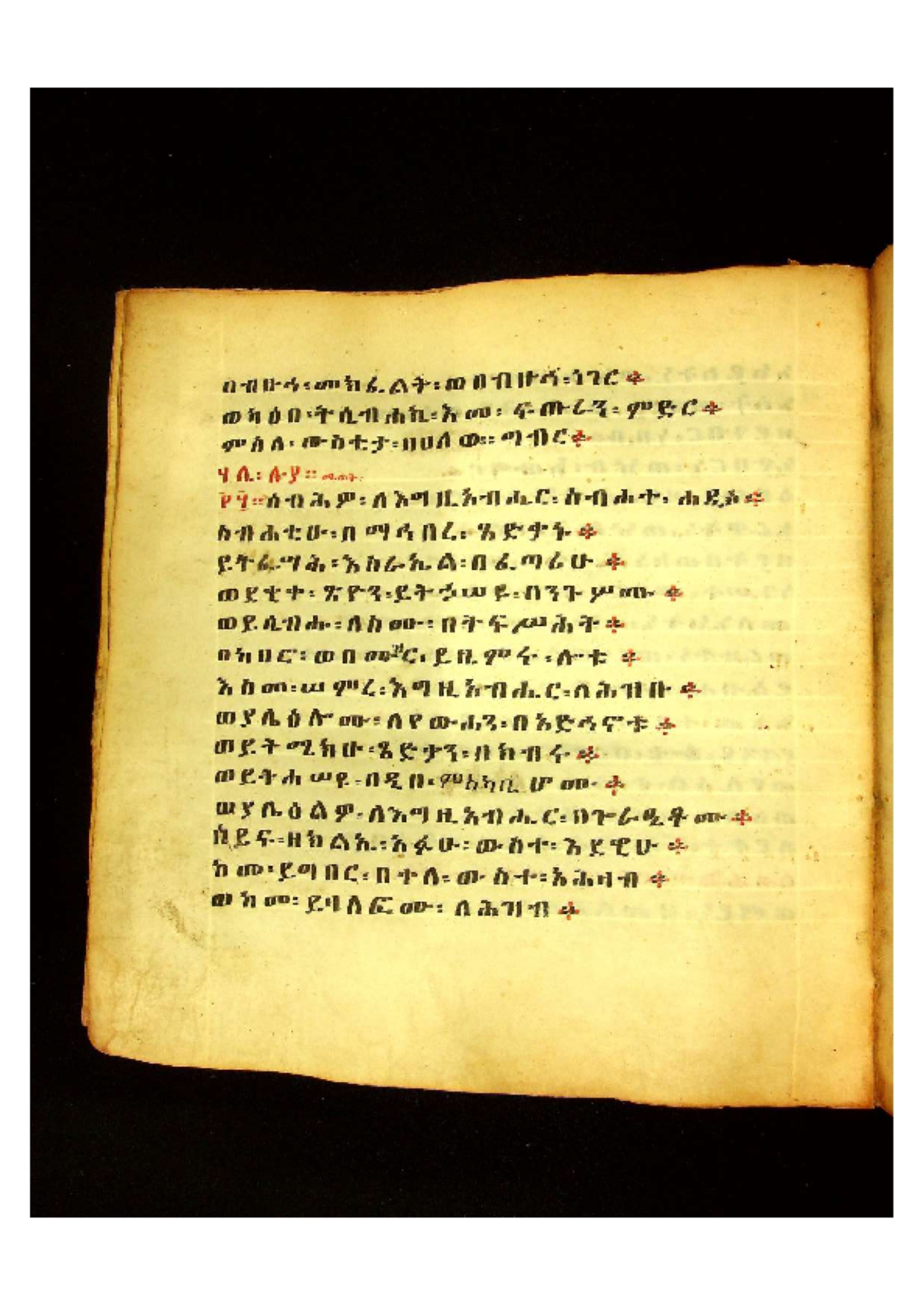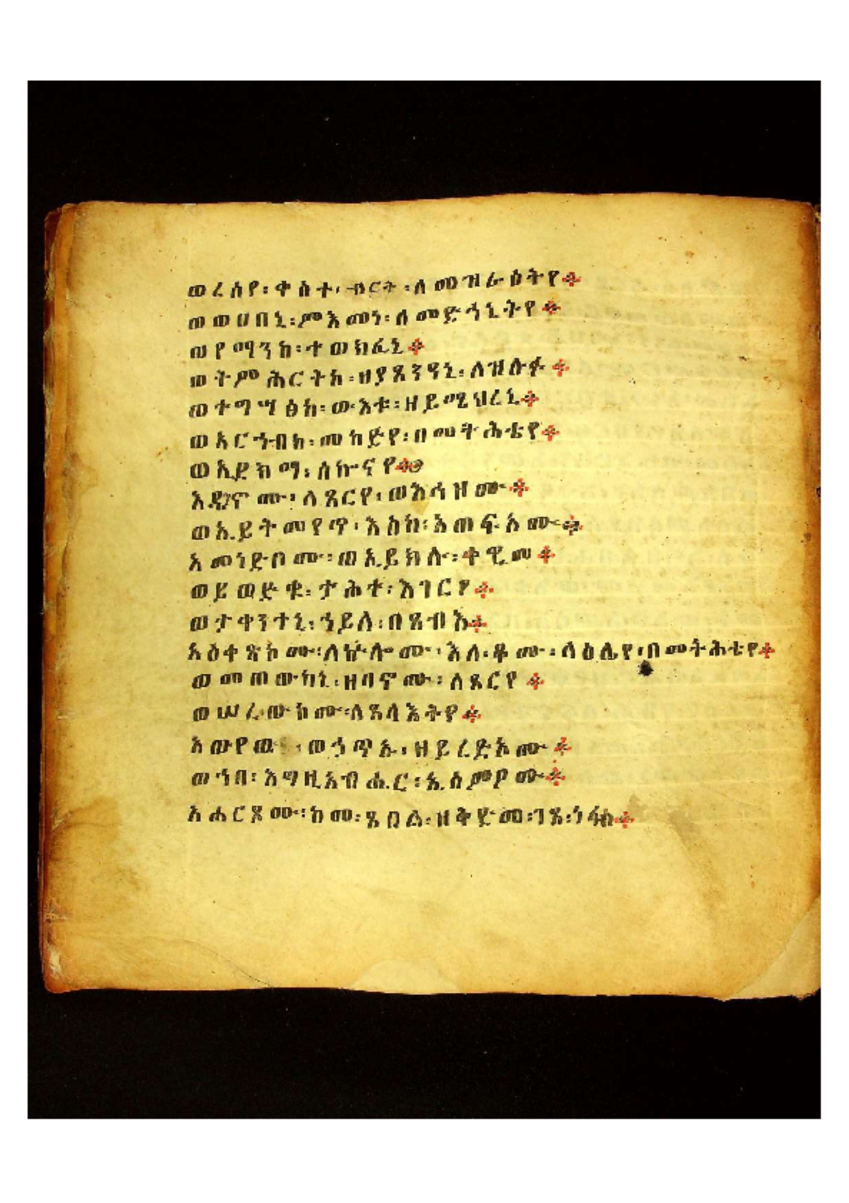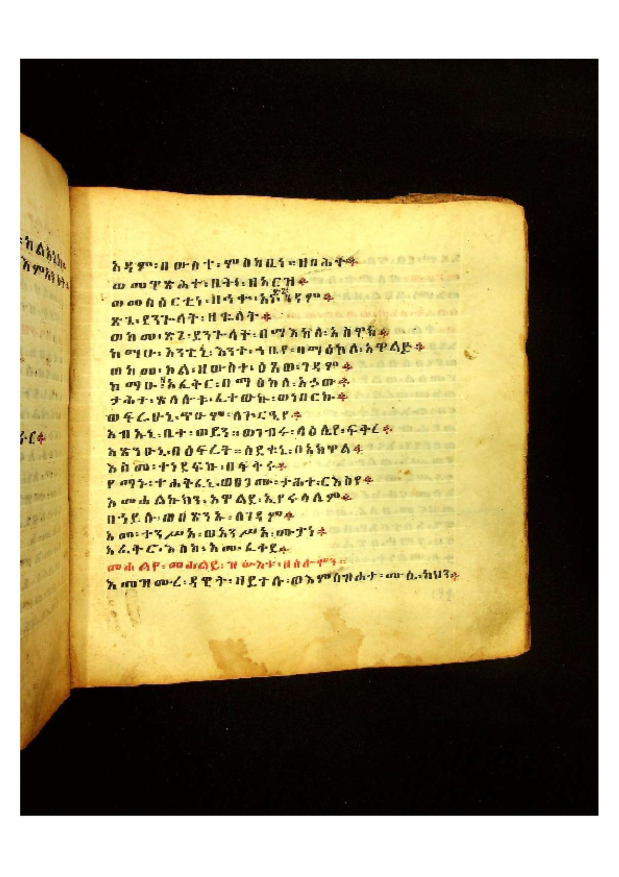 1. F. 2r: donation note written vertically in the outer margin, in black ink: “alla famiglia Bruschettini, Pussy […] Battaglia dell’Amba Aradam il 16 febbraio 1936 XIV”. The note, written in Italian and partly illegible, indicates the Bruschettini family as the receiver of the book and mentions the Battle of Amba Aradam, which took place on 16 February 1936. 2. F. 5r: note written in Italian in the outer upper margin, in red pencil: “Amba Aradam 16/2/XIV ore 17.30 P. Paloboni (?)”. This note also mentions the Battle of Amba Aradam, together with an individual whose name is partially unclear (P. Paloboni?). 3. F. 173v: supplication note written in small script in a mediocre hand, at the end of the “Psalms of David”: ዕቀበኒ፡ እምዓይነ፡ ደዌ፡ ወሞት፡ ለገብርከ፡ ደቅስዮስ፡, “protect me, your servant Däqsəyos, from the eye of infirmity and death”. The note mentions a certain Däqsəyos, indicated as “your servant” (possibly a later owner of the codex). 4. F. 173v: incipit of the Gəʿəz and Amharic prayer, perhaps a writing exercise. The note is written in an inaccurate calligraphy on the outer margin of the folio, next to the prayer. The entire text is የህፂ፡ ኖኅን፡ ከማየ[፡] አይኅ። እስራኤልን፡ ከፈርዖን፡ ዳዊትን፡ ከሳኦል፡ ከኢሎፍሊ። ኤ. 5. F. 190v: donation note, written in black ink in a mediocre hand. Text: ዝመጽሐፍ፡ ዘደብተራ፡ ኪሮስ፡ ዘወሀቦ፡ ለታቦተ፡ ሚካኤል፡ ኢትርስዑኒ፡ በአቡነ፡ ዘበሰማያት፡ ዘአቡየ፡ ገብረ፡ ማርያም፡ ወለእምየ፡ ወለተ፡ ሩፋኤል፡, “This book belongs to däbtära Kiros, who donated it to the tabot of [the church of St] Michael. Do not forget me for our Father who is in heaven. [It also belongs] to my father Gäbrä Maryam and my mother Wälättä Rufaʾel”. 6. F. 199v: writings executed in an inaccurate hand, perhaps the same of note 4. The note includes pen trials (ፈቲነ፡ ብርዕ፡ ዘፈረና፡ etc.), reproduces the explicit of the “Song of the songs” (ስብሐታተኪ፡ ማርያም፡ ከመ፡ እንተ፡ ሕልቀት፡ etc.) and the incipit of the “Praise of Mary” (ውዳሴ፡ ዘሰኑይ፡ ፈቀደ፡ እግዚእ፡ etc., partly rubricated). The writings also mention Däqsəyos, indicated as “your servant” (possibly a later owner of the codex) 7. F. 220ra–va: Genealogic note written on two columns. The note illustrates the family tree of King Yoḥannǝs I, who reigned from 1667 to 1682. The text is acephalous. Incipit: [ወለ]ደ፡ እምሐና፡ ብእሲቱ፡ አሦተ፡ ቅዱሳንሃ፡ ወአሦተ፡ ቅዱሳንኒ፡ እምነ፡ ጳውሊ፡ ብእሲሃ፡ ወለደቶሙ፡ ለአቤተኁን፡ ማእምሮ፡ ወለዘሥላሴ፡ ወአቤተኁን፡ ማእምሮኒ፡ ወለደ፡ አቃርዮስ፡ ወአቃርዮስኒ፡ ወለደ፡ እመቤት፡ እኅተ፡ ክርስቶስሃ፡. The text is published and translated in Proverbio D.V., 2000, ‘Inventario sommario dei manoscritti arabi, ebraici, etiopici – con notizia dei turchi – conservati presso la Biblioteca della Badia di Grottaferrata’. Atti della Accademia nazionale dei Lincei, Memorie, Classe di scienze morali, storiche e filologiche, serie IX, 12 (2000), 468–570 (here pp. 496–97, Appendice III). 8. F. 220va–b: Protective prayer against snakes, written on two columns. Incipit: በስመ፡ አብ፡ … ጸሎት፡ በእንተ፡ ዓርዌ፡ ምድር። ሶበ፡ በጽሐ፡ መልእክት፡ ሐሰውከ፡ በል፡ ፫ጊዜ፡ አኂዘከ፡ ዘፈረ፡ ልብሰ፡ ለእመ፡ ሀሎ፡ ርሑቀ፡ አስትዮ፡. The prayer is probably written in the same hand of note 7. 9. F. 220vb: Unidentified magic prayer containing asmat-names. Incipit: በስመ፡ አብ፡ … ኦላዘላህም፡ አህጉረ፡ ቀዳ[.]፡ ፍሖም፡ ሊስ፡ አፍሊስ፡ ምልክዮስ፡ ዘ[..]ማኤል፡ በዝንቱ፡ አስማቲከ፡ [.]ጽ[..] ኃይለ፡ በረድ፡ ወነፋስ፡ ከማሁ፡. |
