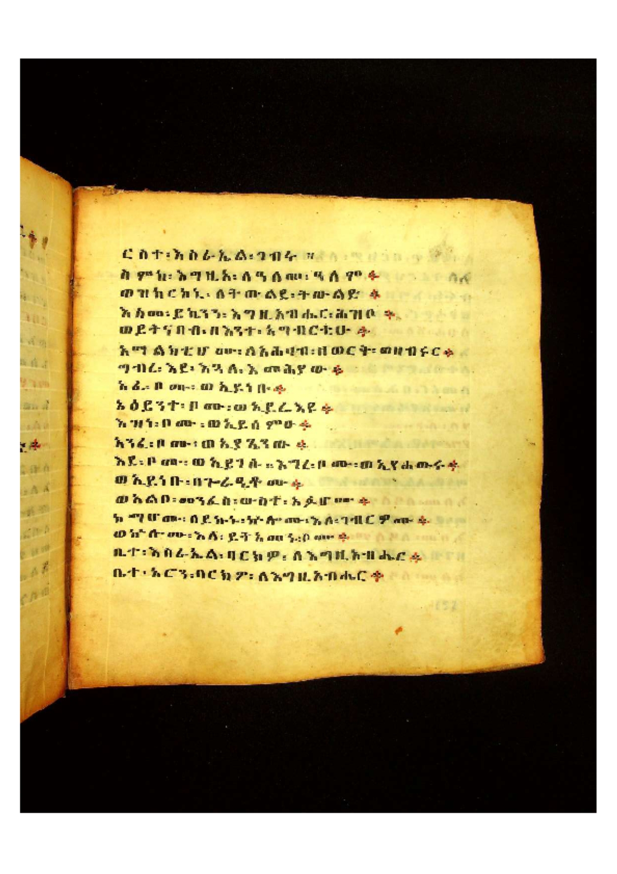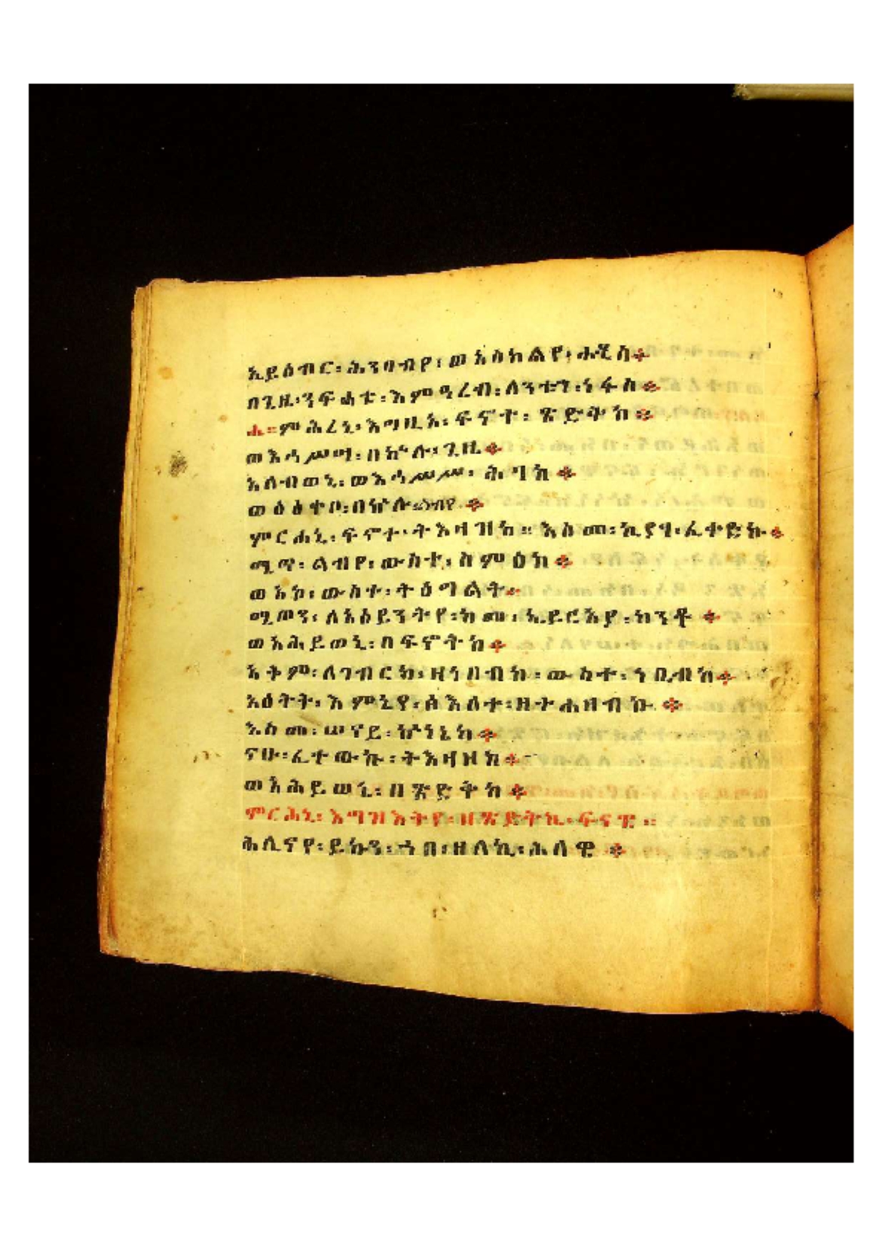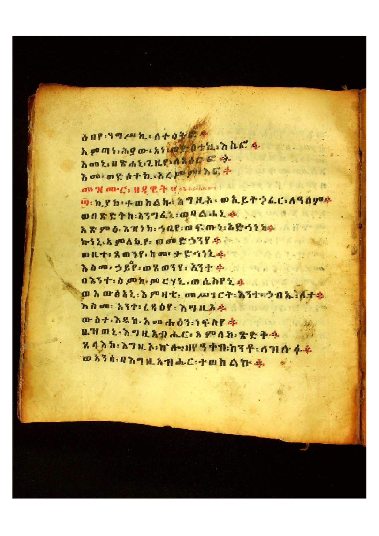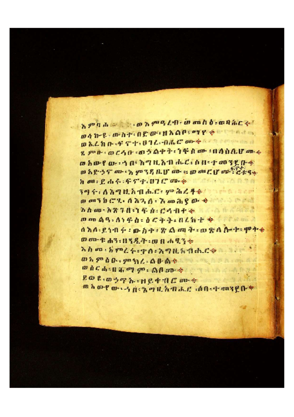 1. F. 2r: donation note written vertically in the outer margin, in black ink: “alla famiglia Bruschettini, Pussy […] Battaglia dell’Amba Aradam il 16 febbraio 1936 XIV”. The note, written in Italian and partly illegible, indicates the Bruschettini family as the receiver of the book and mentions the Battle of Amba Aradam, which took place on 16 February 1936. 2. F. 5r: note written in Italian in the outer upper margin, in red pencil: “Amba Aradam 16/2/XIV ore 17.30 P. Paloboni (?)”. This note also mentions the Battle of Amba Aradam, together with an individual whose name is partially unclear (P. Paloboni?). 3. F. 173v: supplication note written in small script in a mediocre hand, at the end of the “Psalms of David”: ዕቀበኒ፡ እምዓይነ፡ ደዌ፡ ወሞት፡ ለገብርከ፡ ደቅስዮስ፡, “protect me, your servant Däqsəyos, from the eye of infirmity and death”. The note mentions a certain Däqsəyos, indicated as “your servant” (possibly a later owner of the codex). 4. F. 173v: incipit of the Gəʿəz and Amharic prayer, perhaps a writing exercise. The note is written in an inaccurate calligraphy on the outer margin of the folio, next to the prayer. The entire text is የህፂ፡ ኖኅን፡ ከማየ[፡] አይኅ። እስራኤልን፡ ከፈርዖን፡ ዳዊትን፡ ከሳኦል፡ ከኢሎፍሊ። ኤ. 5. F. 190v: donation note, written in black ink in a mediocre hand. Text: ዝመጽሐፍ፡ ዘደብተራ፡ ኪሮስ፡ ዘወሀቦ፡ ለታቦተ፡ ሚካኤል፡ ኢትርስዑኒ፡ በአቡነ፡ ዘበሰማያት፡ ዘአቡየ፡ ገብረ፡ ማርያም፡ ወለእምየ፡ ወለተ፡ ሩፋኤል፡, “This book belongs to däbtära Kiros, who donated it to the tabot of [the church of St] Michael. Do not forget me for our Father who is in heaven. [It also belongs] to my father Gäbrä Maryam and my mother Wälättä Rufaʾel”. 6. F. 199v: writings executed in an inaccurate hand, perhaps the same of note 4. The note includes pen trials (ፈቲነ፡ ብርዕ፡ ዘፈረና፡ etc.), reproduces the explicit of the “Song of the songs” (ስብሐታተኪ፡ ማርያም፡ ከመ፡ እንተ፡ ሕልቀት፡ etc.) and the incipit of the “Praise of Mary” (ውዳሴ፡ ዘሰኑይ፡ ፈቀደ፡ እግዚእ፡ etc., partly rubricated). The writings also mention Däqsəyos, indicated as “your servant” (possibly a later owner of the codex) 7. F. 220ra–va: Genealogic note written on two columns. The note illustrates the family tree of King Yoḥannǝs I, who reigned from 1667 to 1682. The text is acephalous. Incipit: [ወለ]ደ፡ እምሐና፡ ብእሲቱ፡ አሦተ፡ ቅዱሳንሃ፡ ወአሦተ፡ ቅዱሳንኒ፡ እምነ፡ ጳውሊ፡ ብእሲሃ፡ ወለደቶሙ፡ ለአቤተኁን፡ ማእምሮ፡ ወለዘሥላሴ፡ ወአቤተኁን፡ ማእምሮኒ፡ ወለደ፡ አቃርዮስ፡ ወአቃርዮስኒ፡ ወለደ፡ እመቤት፡ እኅተ፡ ክርስቶስሃ፡. The text is published and translated in Proverbio D.V., 2000, ‘Inventario sommario dei manoscritti arabi, ebraici, etiopici – con notizia dei turchi – conservati presso la Biblioteca della Badia di Grottaferrata’. Atti della Accademia nazionale dei Lincei, Memorie, Classe di scienze morali, storiche e filologiche, serie IX, 12 (2000), 468–570 (here pp. 496–97, Appendice III). 8. F. 220va–b: Protective prayer against snakes, written on two columns. Incipit: በስመ፡ አብ፡ … ጸሎት፡ በእንተ፡ ዓርዌ፡ ምድር። ሶበ፡ በጽሐ፡ መልእክት፡ ሐሰውከ፡ በል፡ ፫ጊዜ፡ አኂዘከ፡ ዘፈረ፡ ልብሰ፡ ለእመ፡ ሀሎ፡ ርሑቀ፡ አስትዮ፡. The prayer is probably written in the same hand of note 7. 9. F. 220vb: Unidentified magic prayer containing asmat-names. Incipit: በስመ፡ አብ፡ … ኦላዘላህም፡ አህጉረ፡ ቀዳ[.]፡ ፍሖም፡ ሊስ፡ አፍሊስ፡ ምልክዮስ፡ ዘ[..]ማኤል፡ በዝንቱ፡ አስማቲከ፡ [.]ጽ[..] ኃይለ፡ በረድ፡ ወነፋስ፡ ከማሁ፡. |