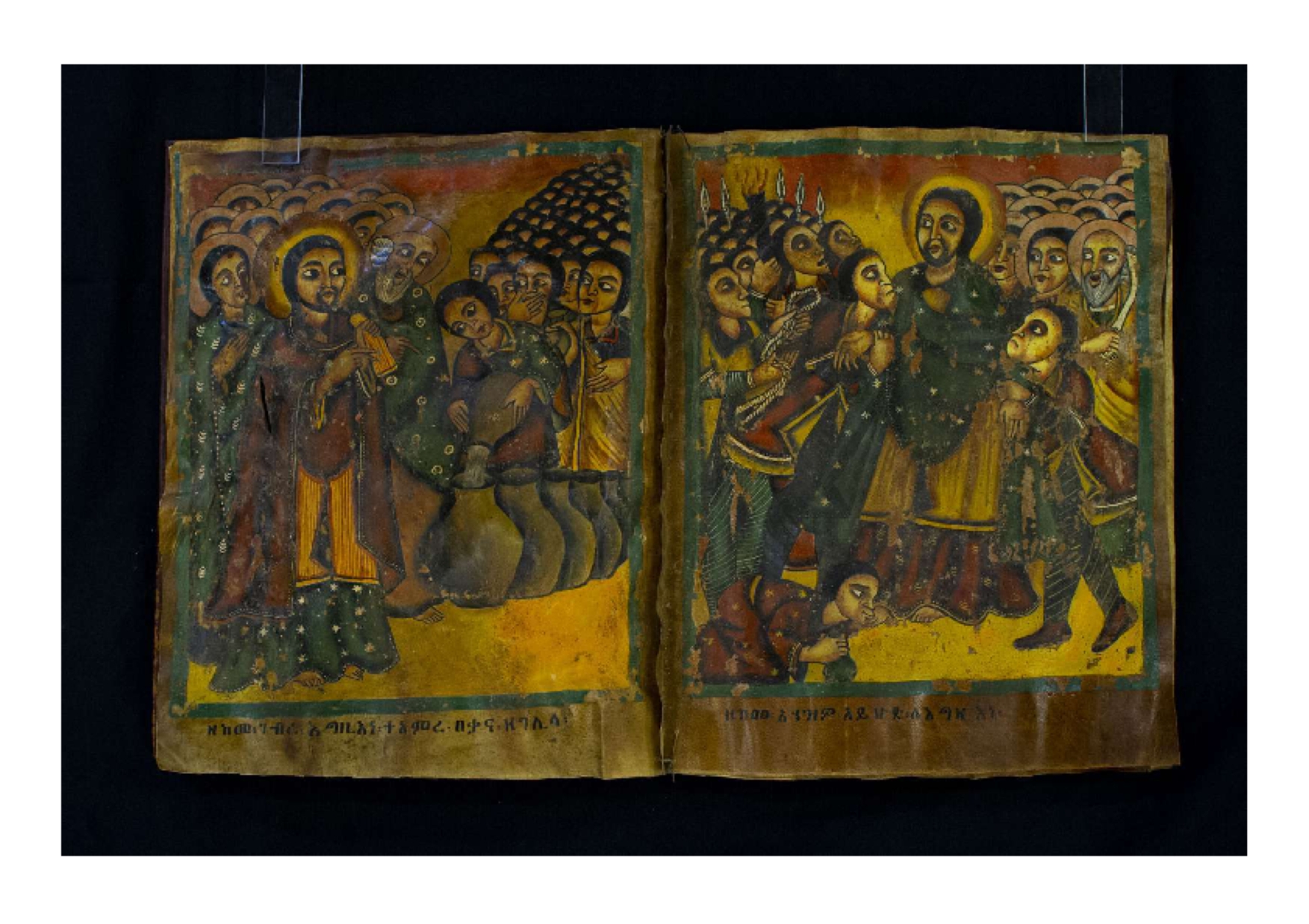 1. F. 2r: Colorful full-page illustration of the Annunciation. Caption: ዘከመ፡ አብሠራ፡ ለገብርኤል፡ ማርያም፡. 2. F. 2v: Colorful full-page illustration of the Nativity. Caption: ዘከመ፡ ተወልደ፡ እግዚእነ፡ በቤተ፡ ልሔም፡ ዘይሁድ፡. 3. F. 3r: Colorful full-page illustration of the Baptism of Christ. Caption: ዘከመ፡ ተጠምቀ፡ እግዚእነ፡ በእደ፡ ዮሐንስ፡. 4. F. 3v: Colorful full-page illustration of the Wedding at Cana. Caption ዘከመ፡ ገብረ፡ እግዚእነ፡ ተአምረ፡ በቃና፡ ዘገሊላ፡: 5. F. 4r: Colorful full-page illustration of the Arrest of Jesus. Caption: ዘከመ፡ አኀዝዎ፡ አይሁድ፡ ለእግዚእነ፡. 6. F. 4v: Colorful full-page illustration of the Flagellation of Jesus. Caption: ዘከመ፡ ቀሠፈኦ፡ ጲላጦስ፡ ለኢየሱስ፡. 7. F. 5r: Colorful full-page illustration of Pilate and Jesus. Caption: ዘከመ፡ ሐተቶ፡ ጲላጦስ፡ ለኢየሱስ፡. 8. F. 5v: Colorful full-page illustration of Pilate washing his hands. Caption: ይቤ፡ ጲላጦስ፡ አነ፡ ንጹሕ፡ እምደሙ፡ ለዝ፡ ብእሲ፡. 9. F. 6r: Colorful full-page illustration of Jesus bearing the Cross. Caption: ዘከመ፡ አጾርዎ፡ አይሁድ፡ ለእግዚእነ፡ አርዑተ፡ መስቀሉ፡. 10. F. 6v: Colorful full-page illustration of Simon of Cyrene bearing the Cross. Caption: ዘከመ፡ ዐበጥዎ፡ ለስምዖን፡ ከመ፡ ይጹር፡ መስቀሎ፡. |