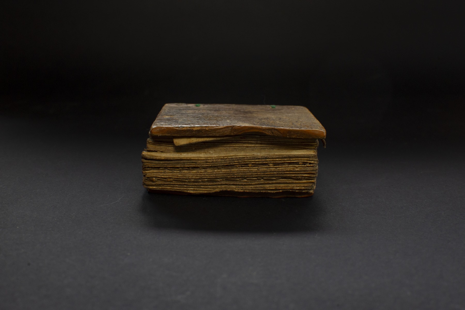 Two wooden boards. The spine is uncovered. Two sewing stations. |
