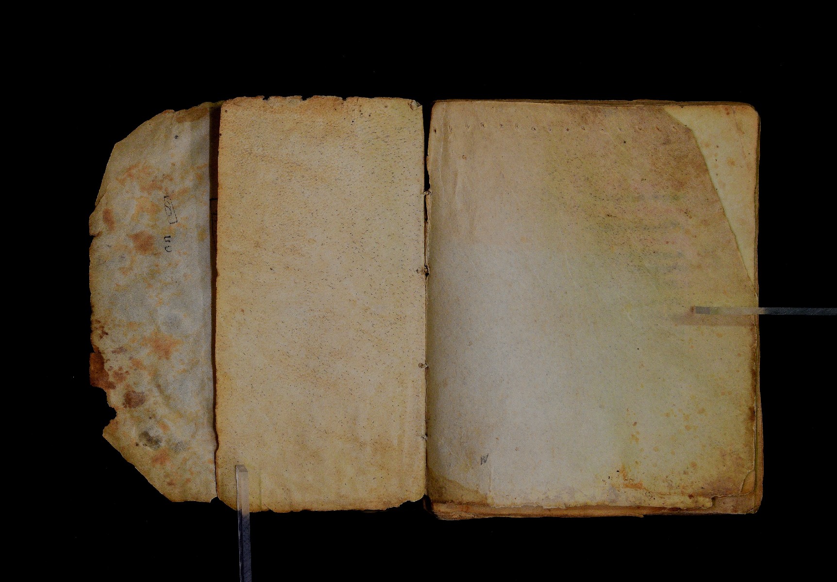 The boards and the spine cover are missing. Four sewing stations. |