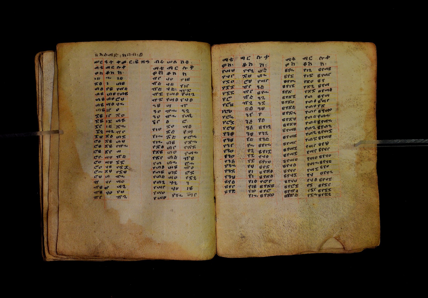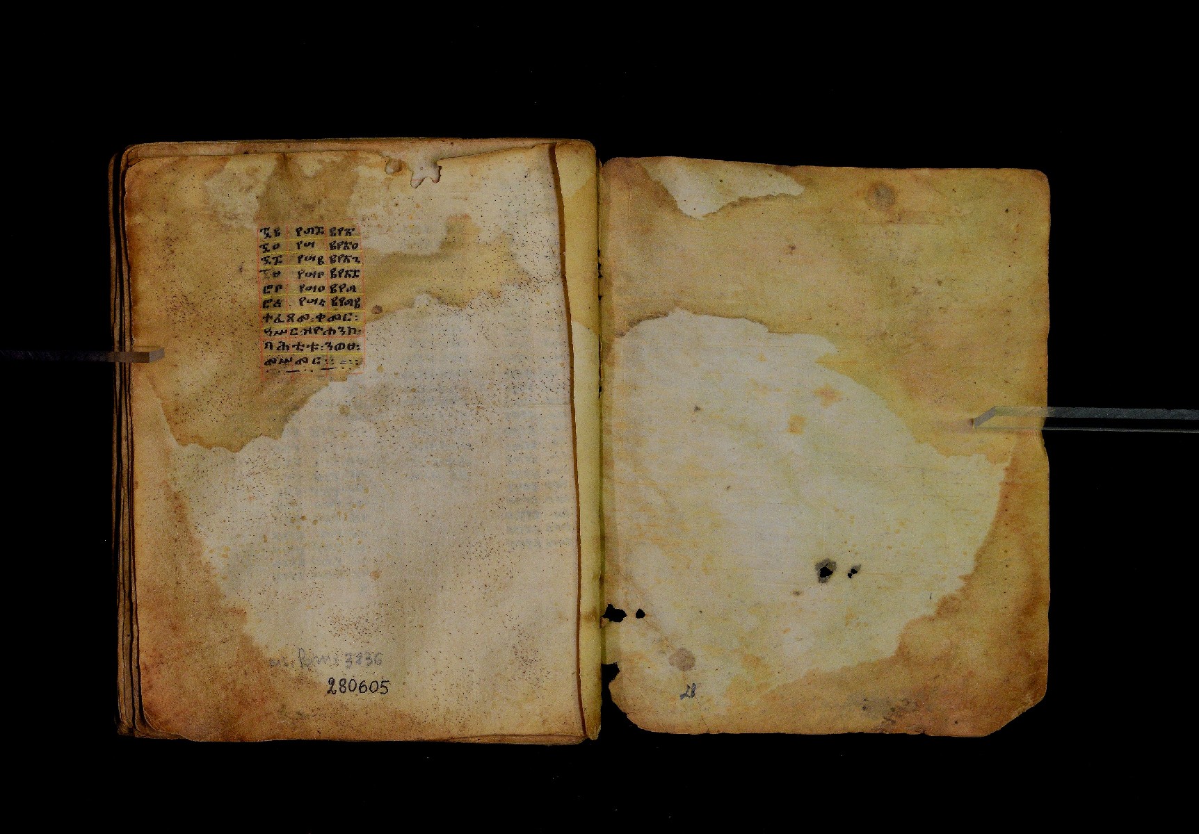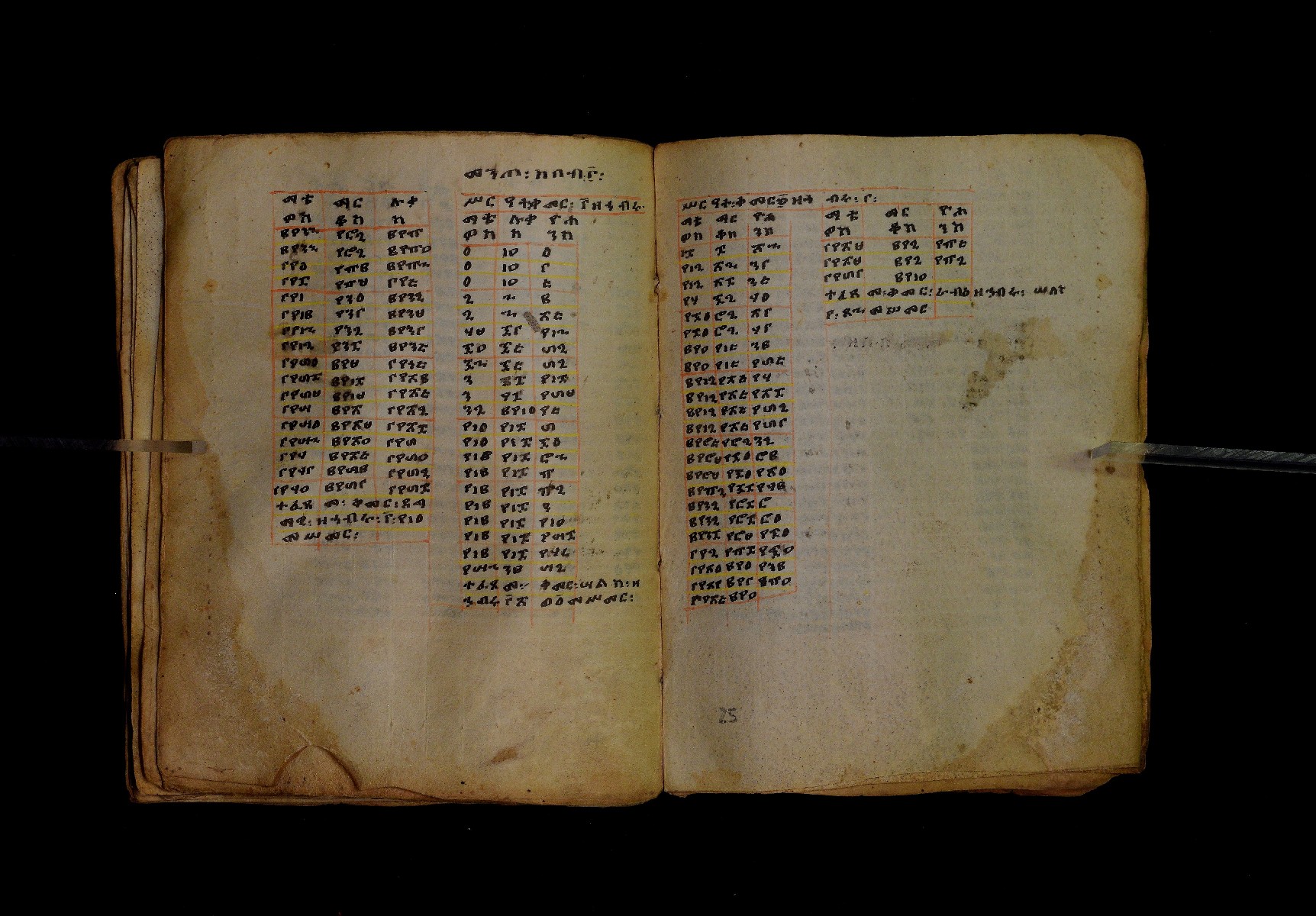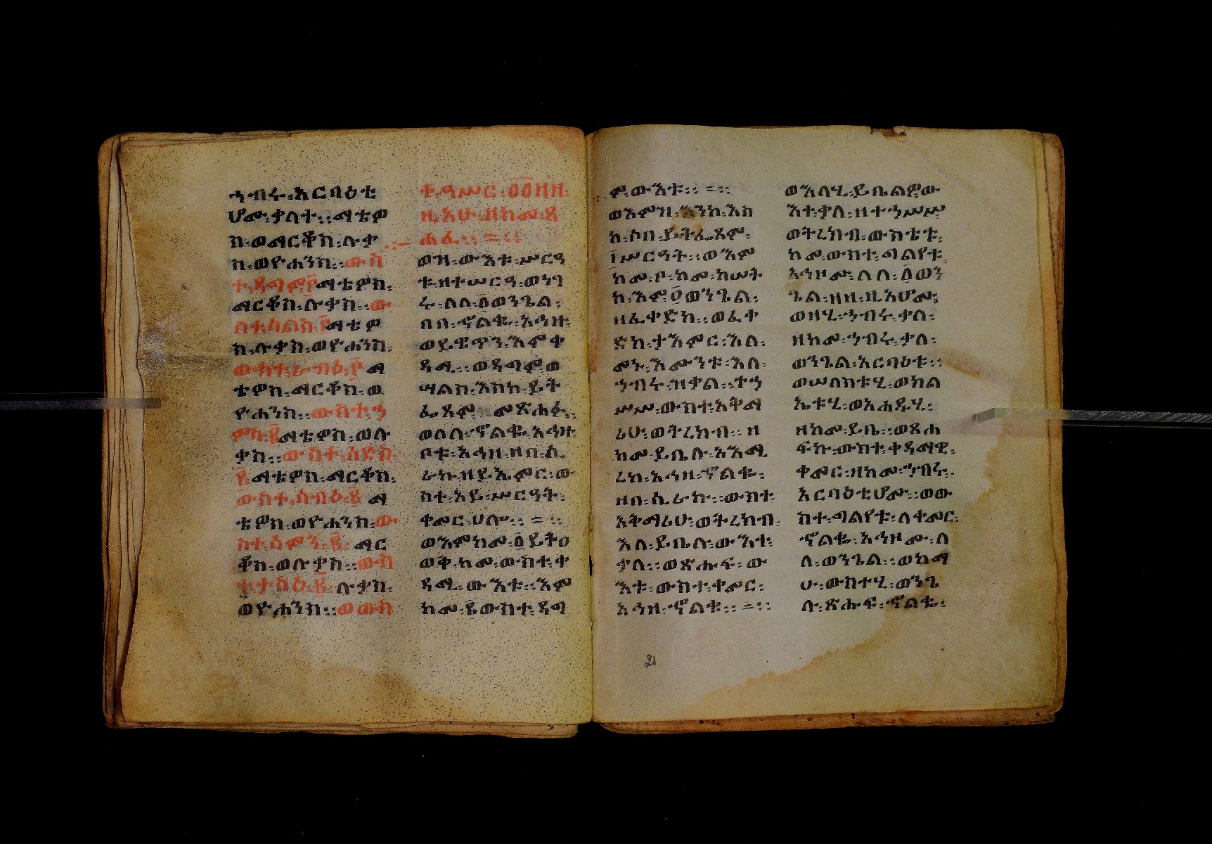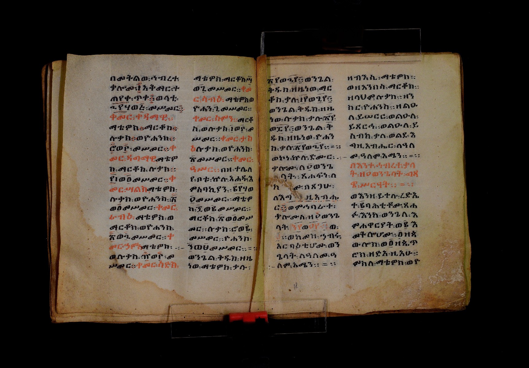 Ff. 1ra–18rb: Mäqdǝmä wängel (“Introduction to the Gospels”), in seven chapters. Incipit: በስመ፡ አብ፡ … ንቅድም፡ በረድኤተ፡ እግዚአብሔር፡ ይትባረክ፡ እግዚአብሔር፡ ወይትሌዓል፡ ዝክሩ። ዘእምኔሁ፡ ኵሉ፡ ሢመተ፡ ኀይል። ወቦቱ፡ ተፍጻሜተ፡ ኵሉ፡ ስእለት። ወኀቤሁ፡ ምብጻሐ፡ ኵሉ፡ አስተብቍዖት። በጽሕፈተ፡ መቅድመ፡ ፬ወንጌላት፡ ስቡሐን። (!) አቅማራት፡ በሰላመ፡ እግዚአብሔር፡ አሜን። =። Ff. 18rb–19vb: Gǝṣṣawe śǝrʿat (“Synopsis of classes”) Incipit: በእንተ፡ ኅብረተ፡ ቃላት፡ ዘ፬ወንጌላት፡ ግጻዌ፡ ሥርዓት። =። ወእንዘ፡ ይተሉ፡ ረድኤተ፡ ፪ባሕቲቶሙ፡ ጸሐፉ፡ እንከ፡ ወንጌለ፡ እምሐዋርያት፡ ወ፪እመትሎሆሙ፡ ፩ዘጳውሎስ፡ ወ፩ዘጴጥሮስ፡ ዘድአ፡ ዚአሁ። ምስለ፡ ማቴዎስ፡ ወዮ(18va)ሐንስ፡ ጸሐፉ፡ እንከ፡ ወንጌላተ። እንዘ፡ ኢየኀሡ፡ ክብረ፡ ለርእሶሙ። አላ፡ በከመ፡ ይትፈቀድ። Ff. 20ra–21vb: Letter of Eusebius to Carpianus Incipit: አውሴብስ፡ ለቀርጲያኖስ፡ ለዘ፡ አፈቅር፡ እኁየ፡ ፍሥሐ፡ ወዳኅና፡ ለከ፡ እምኀብ፡ አግዚአብሔር። አሞንስ፡ እንከ፡ አለክስንድራዊ፡ በብዙኅ፡ አስተሐምሞ፡ ወጽሂቅ፡ ገብሩ። ወኀደገ፡ ለነ፡ ቃለ፡ ዘከመ፡ ኃብሩ፡ ፬ወንጌል። ወእምዝሰ፡ አርእስተ፡ ምንባባት። =። ወበእንተዝ፡ እንከ፡ መፍትው፡ ጥንቶ፡ ይትልውዎ፡ ከመ፡ ሙሱነ፡ ኢይኩን። ሠለስቱኒ፡ በተሊወ፡ ንበቱ፡ ኢይትኀደግ። Ff. 22v–27v: Śərʿatä qämär zäkämä ḫabru arbaʿǝttu (Canon tables). |