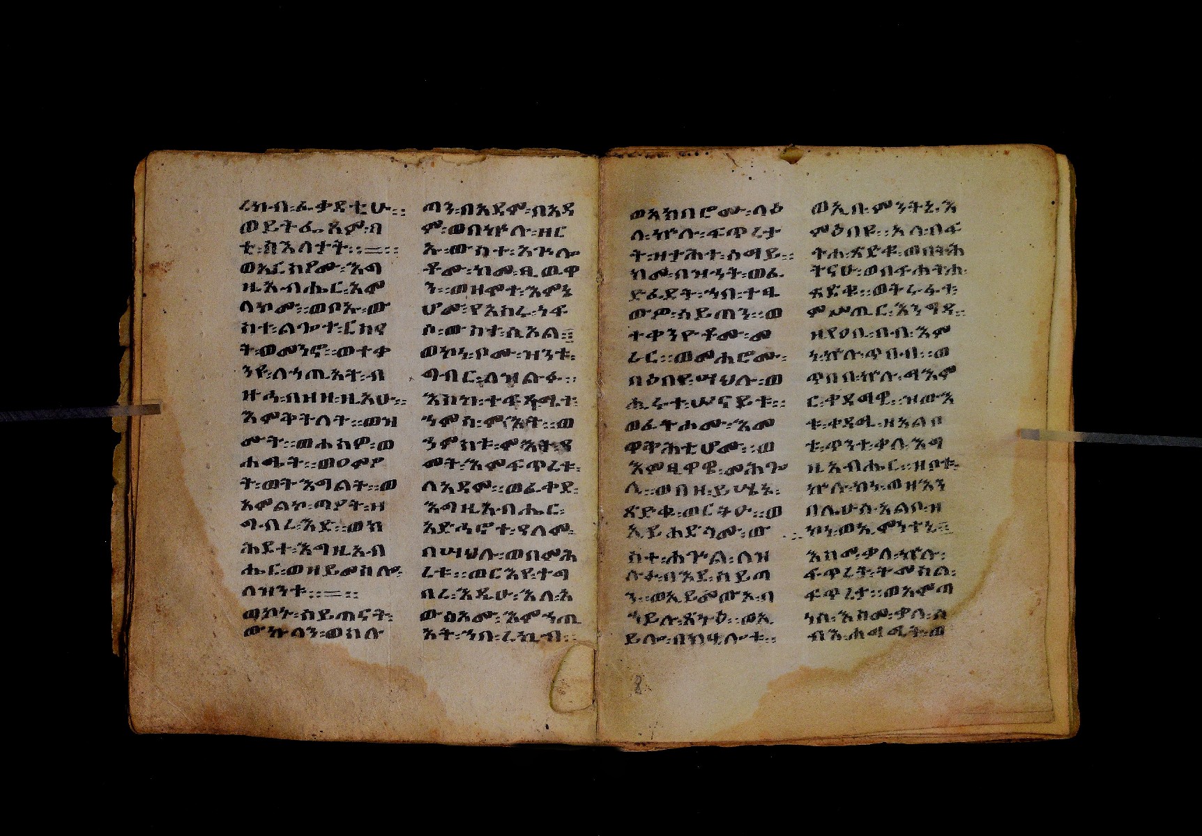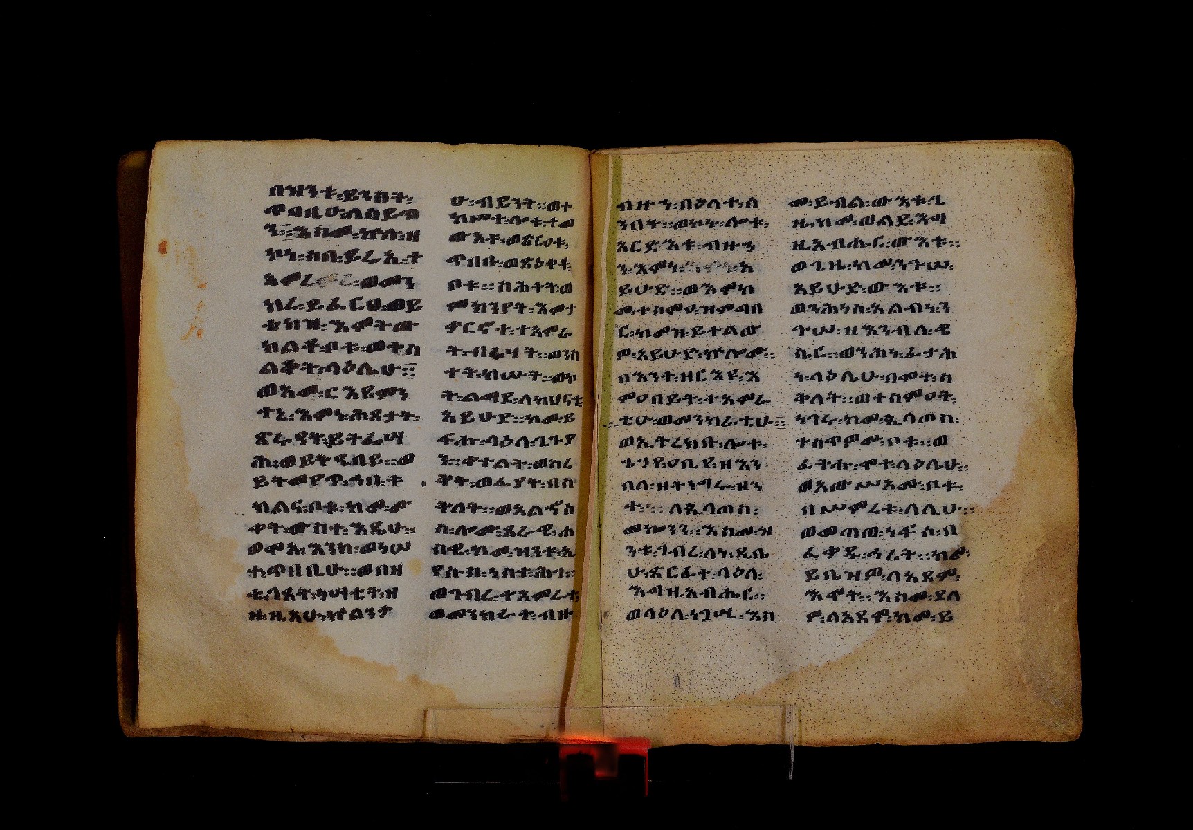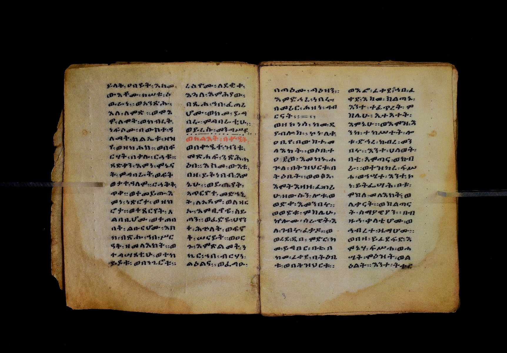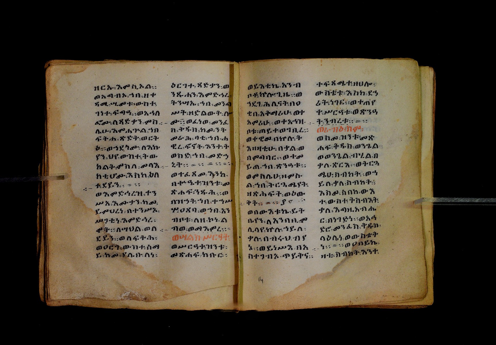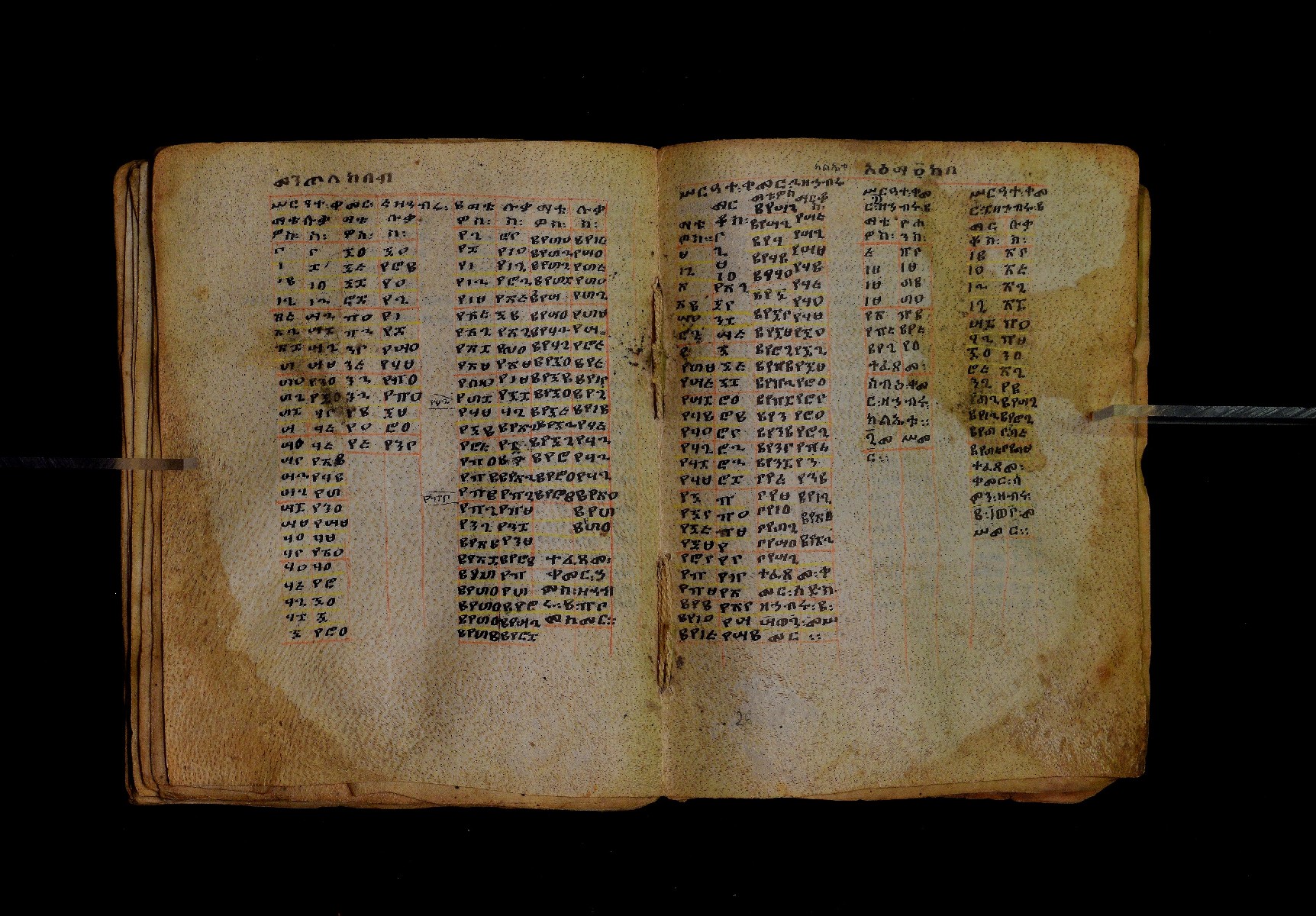 Ff. 1ra–18rb: Mäqdǝmä wängel (“Introduction to the Gospels”), in seven chapters. Incipit: በስመ፡ አብ፡ … ንቅድም፡ በረድኤተ፡ እግዚአብሔር፡ ይትባረክ፡ እግዚአብሔር፡ ወይትሌዓል፡ ዝክሩ። ዘእምኔሁ፡ ኵሉ፡ ሢመተ፡ ኀይል። ወቦቱ፡ ተፍጻሜተ፡ ኵሉ፡ ስእለት። ወኀቤሁ፡ ምብጻሐ፡ ኵሉ፡ አስተብቍዖት። በጽሕፈተ፡ መቅድመ፡ ፬ወንጌላት፡ ስቡሐን። (!) አቅማራት፡ በሰላመ፡ እግዚአብሔር፡ አሜን። =። Ff. 18rb–19vb: Gǝṣṣawe śǝrʿat (“Synopsis of classes”) Incipit: በእንተ፡ ኅብረተ፡ ቃላት፡ ዘ፬ወንጌላት፡ ግጻዌ፡ ሥርዓት። =። ወእንዘ፡ ይተሉ፡ ረድኤተ፡ ፪ባሕቲቶሙ፡ ጸሐፉ፡ እንከ፡ ወንጌለ፡ እምሐዋርያት፡ ወ፪እመትሎሆሙ፡ ፩ዘጳውሎስ፡ ወ፩ዘጴጥሮስ፡ ዘድአ፡ ዚአሁ። ምስለ፡ ማቴዎስ፡ ወዮ(18va)ሐንስ፡ ጸሐፉ፡ እንከ፡ ወንጌላተ። እንዘ፡ ኢየኀሡ፡ ክብረ፡ ለርእሶሙ። አላ፡ በከመ፡ ይትፈቀድ። Ff. 20ra–21vb: Letter of Eusebius to Carpianus Incipit: አውሴብስ፡ ለቀርጲያኖስ፡ ለዘ፡ አፈቅር፡ እኁየ፡ ፍሥሐ፡ ወዳኅና፡ ለከ፡ እምኀብ፡ አግዚአብሔር። አሞንስ፡ እንከ፡ አለክስንድራዊ፡ በብዙኅ፡ አስተሐምሞ፡ ወጽሂቅ፡ ገብሩ። ወኀደገ፡ ለነ፡ ቃለ፡ ዘከመ፡ ኃብሩ፡ ፬ወንጌል። ወእምዝሰ፡ አርእስተ፡ ምንባባት። =። ወበእንተዝ፡ እንከ፡ መፍትው፡ ጥንቶ፡ ይትልውዎ፡ ከመ፡ ሙሱነ፡ ኢይኩን። ሠለስቱኒ፡ በተሊወ፡ ንበቱ፡ ኢይትኀደግ። Ff. 22v–27v: Śərʿatä qämär zäkämä ḫabru arbaʿǝttu (Canon tables). |