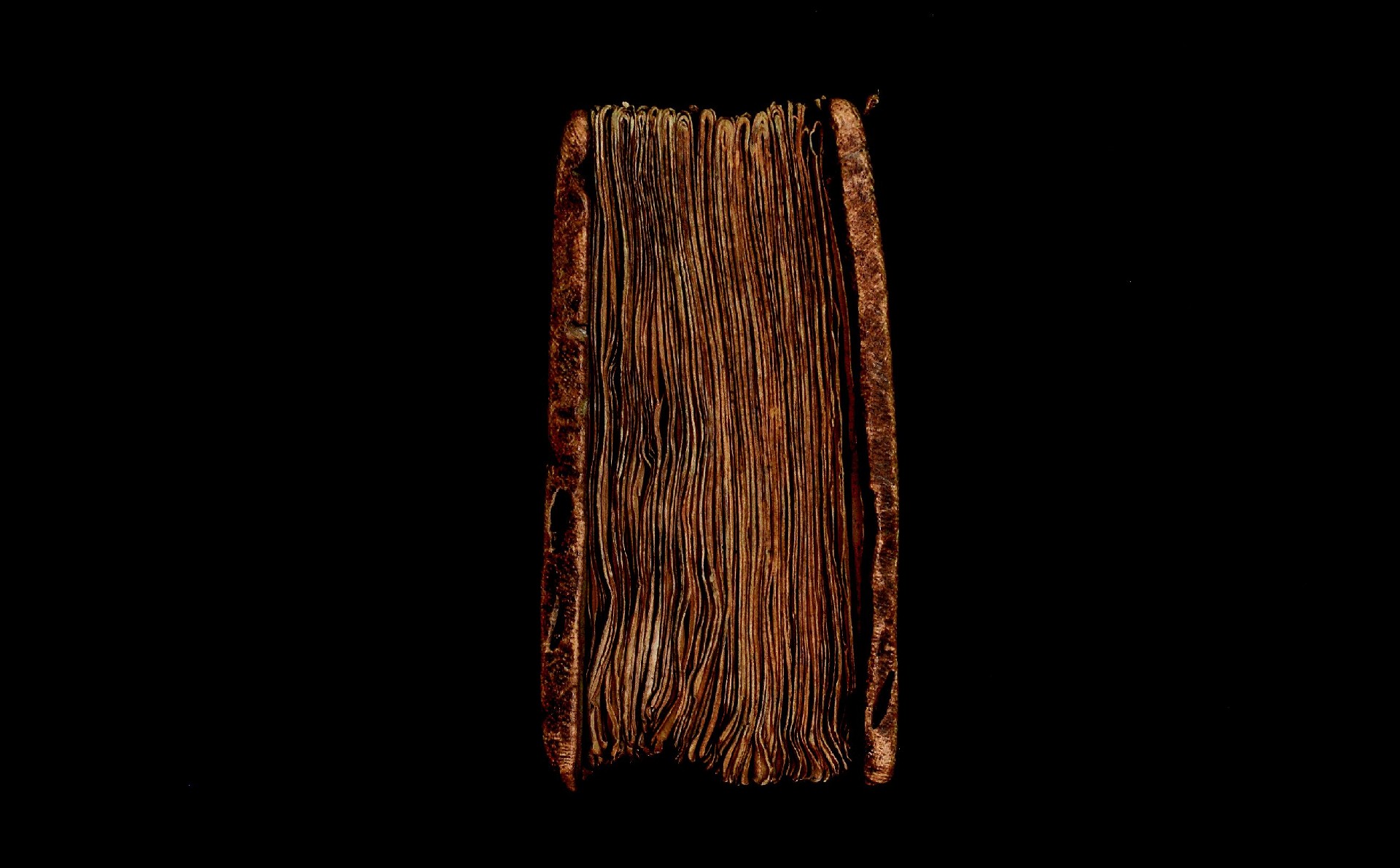 Two wooden boards. The spine is uncovered. Four sewing stations.