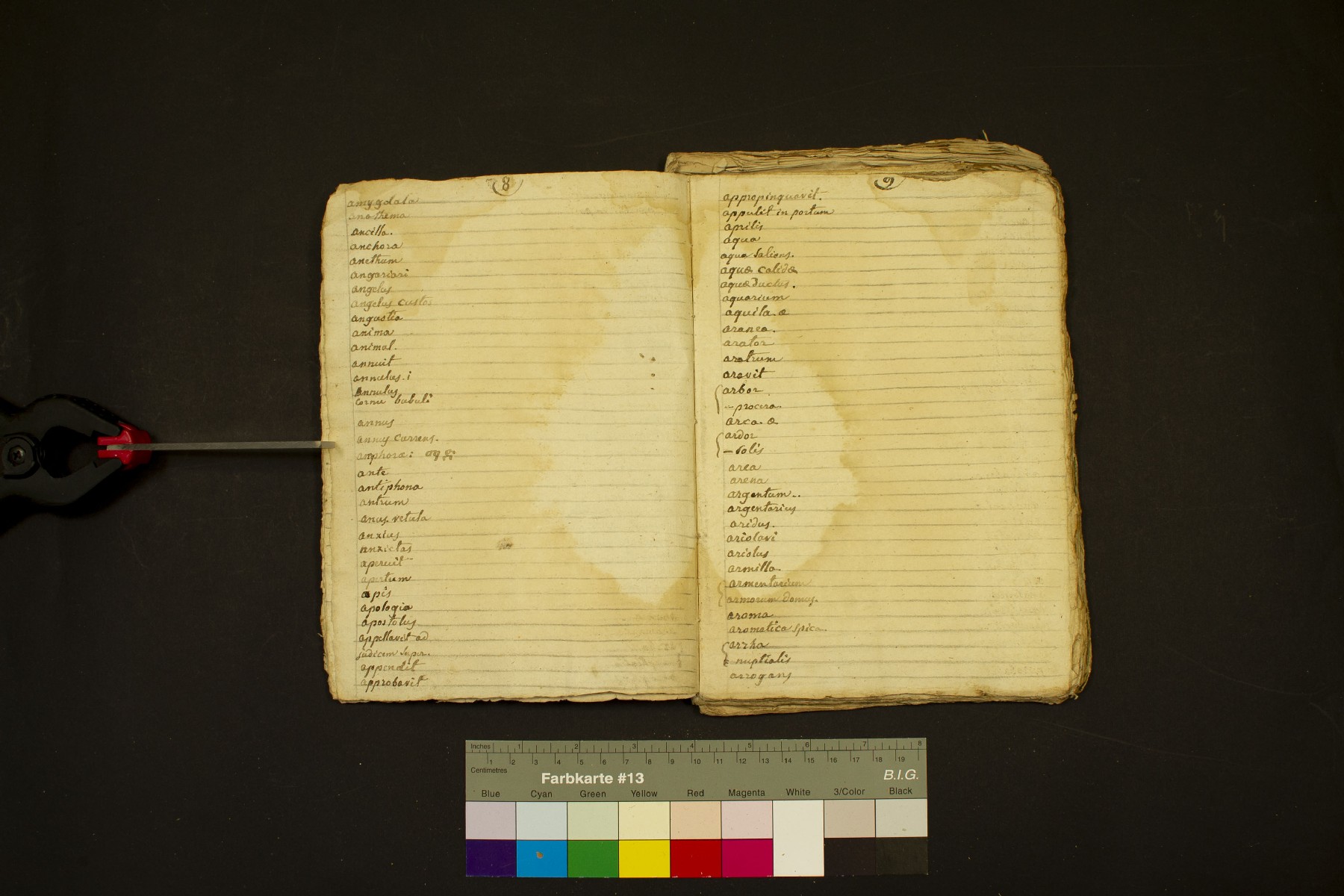 Quire 2 consists of three medium-size paper bifolia folded one inside the other without binding, for a total amount of 6 folia. The quire contains various Amharic wordlists written in fidäl on one or two columns (f. 3r–v is written on two columns). Each entry is accompanied by the respective meaning in Italian. The entire text is written in pale black ink, in all likelihood by Léon des Avanchers. All leaves are unruled. F. 1r: “Dei nomi degli animali domestici considerati nel loro mondo” (“About the names of the domestic animals considered in their world”). F. 1v: “Sterchi” (“Animal droppings”). F. 2r: “Semenze varie” (“Various seeds”). F. 3ra: “Insetti” (“Insects”); “Rettili” (“Reptiles”); F. 3rb: “Volatili” (“Birds”); Acquatici (“Aquatic animals”). F. 3va: untitled but contains words for kinship. F. 3vb: “Scimmie” (“Monkeys”). F. 4r: “Quadrupedi” (“Four-legged animals”). F. 5r: “Piante” (“Plants”). F. 6r: “Animali bovini” (“Bovine animals”). Ff. 2v, 4v, 5v, 6v are blank.