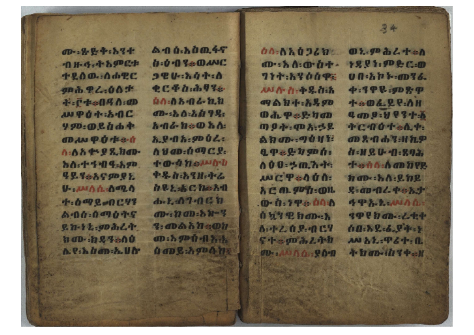 Ethiopic numerals on the upper inner corner of the recto of the first folio of the third, fourth and fifth quires: ff. 13r (፪), 23r (፫), and 33r (፬). |