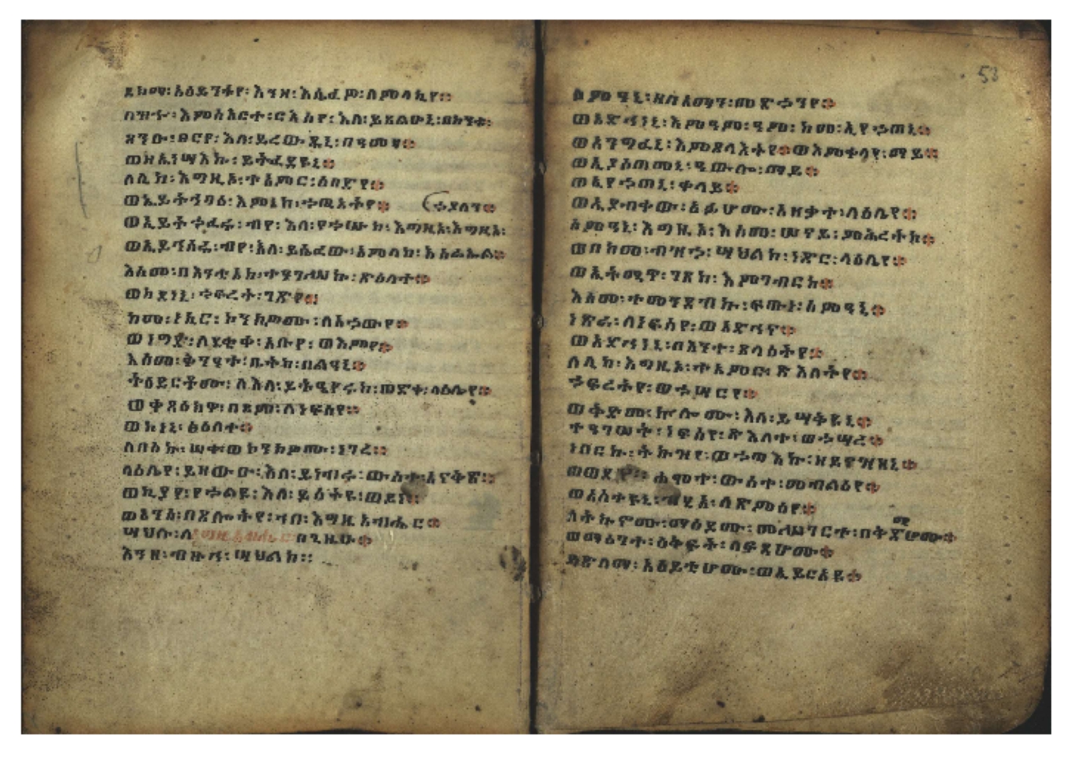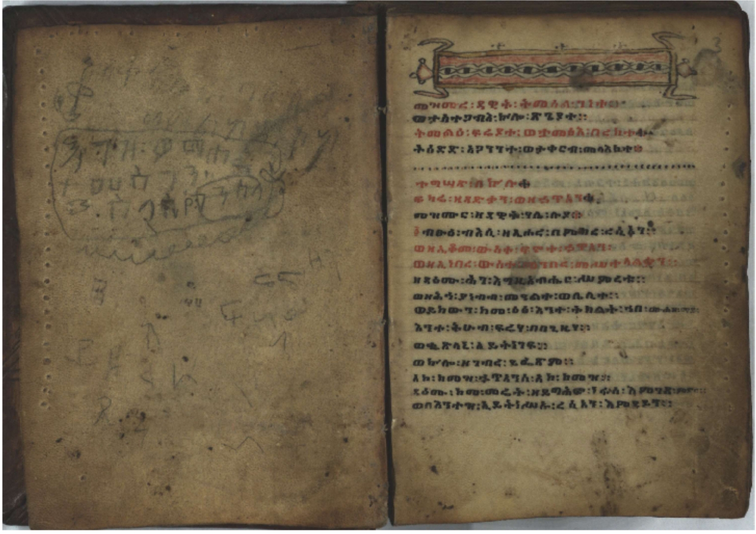 1. F. 1r–v: Mälkǝʾ-hymn to St Michael (Chaine nr. 119), written in an inaccurate hand. The words ሰላም፡ and ሚካኤል፡ are rubricated. Incipit: ሰላም፡ ለዝክረ፡ ስምከ፡ ምስለ፡ ስመ፡ ልዑል፡ ዘተሳተፈ። ወልደ፡ ያሬድ፡ ሄኖክ፡ በከመ፡ ጸሐፈ፡ ሶበ፡ እጼ<ውዕ፡> ስመከ፡ ከሲትየ፡ አፈ፡ ረዳኤ።. The text is incomplete. 2. Ff. 1v–2v: pen trials and other minor scribbles in pencil. 3. F. 156rb–v: Note on the commission of the manuscript, written in Amharic. It mentions the commissioner Aläqa Wäldä Śǝllase and the recipient Lǝǧǧ Abärra Nǝguse. Incipit: መጋቢት፡ ፲፩ቀን፡ አለቃ፡ ወልደ፡ ሥላሴ፡ ለልጅ፡ አበራ፡ ንጉሴ፡ የብራና፡ ዳዊት፡ ሲሸጥ፡ እማኝ፡ ቄስ፡ ኪዳኑ፡ የልጅ፡ አበራ፡ የሸቃ፡. ተእምራ(156v)ት፡ መድህን፡ አለቃ፡ ሐደረ፡ በሶስት፡ ብር፡ ታላድ፡ ሶሽጥ፡ በሶስት፡ ብር፡ ታላድ፡ ሺገዛ፡ ፈጣሚ፡ ብላ፡ ገብሩ፡. |