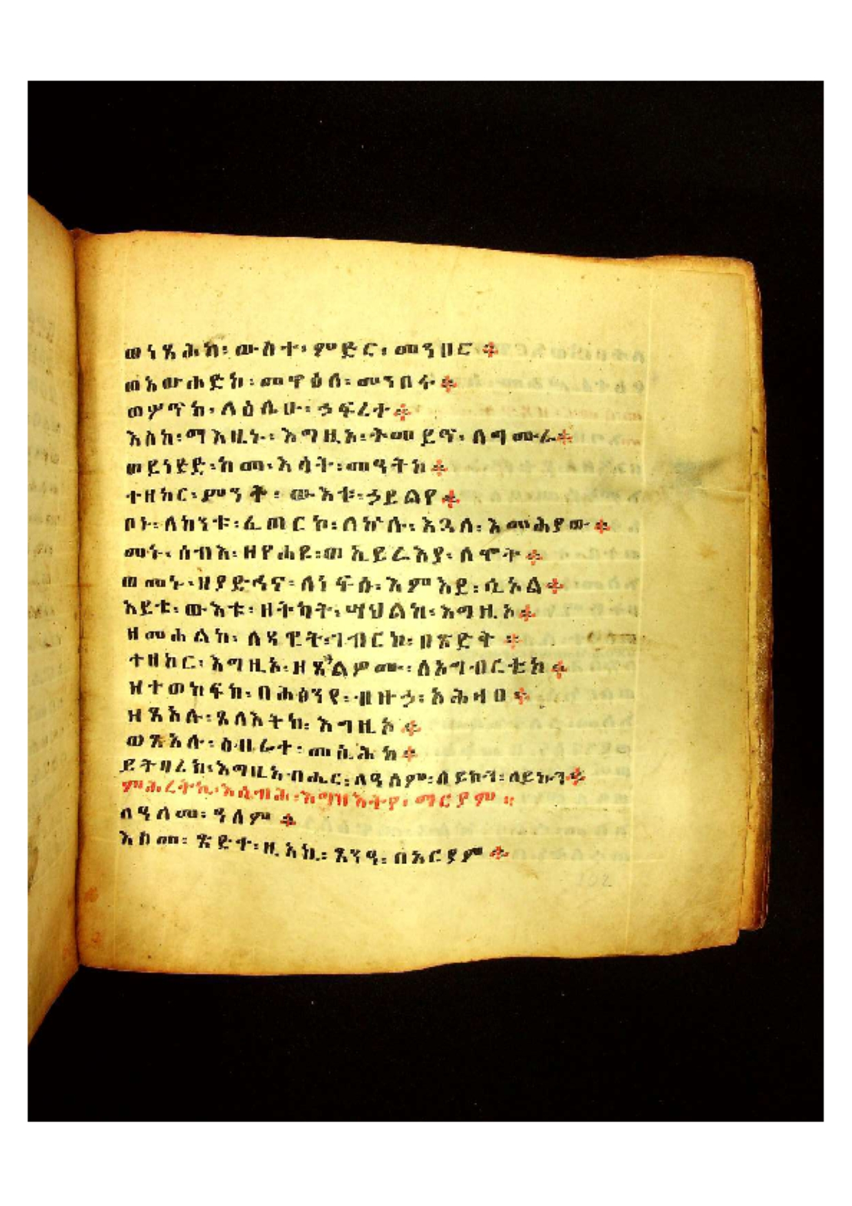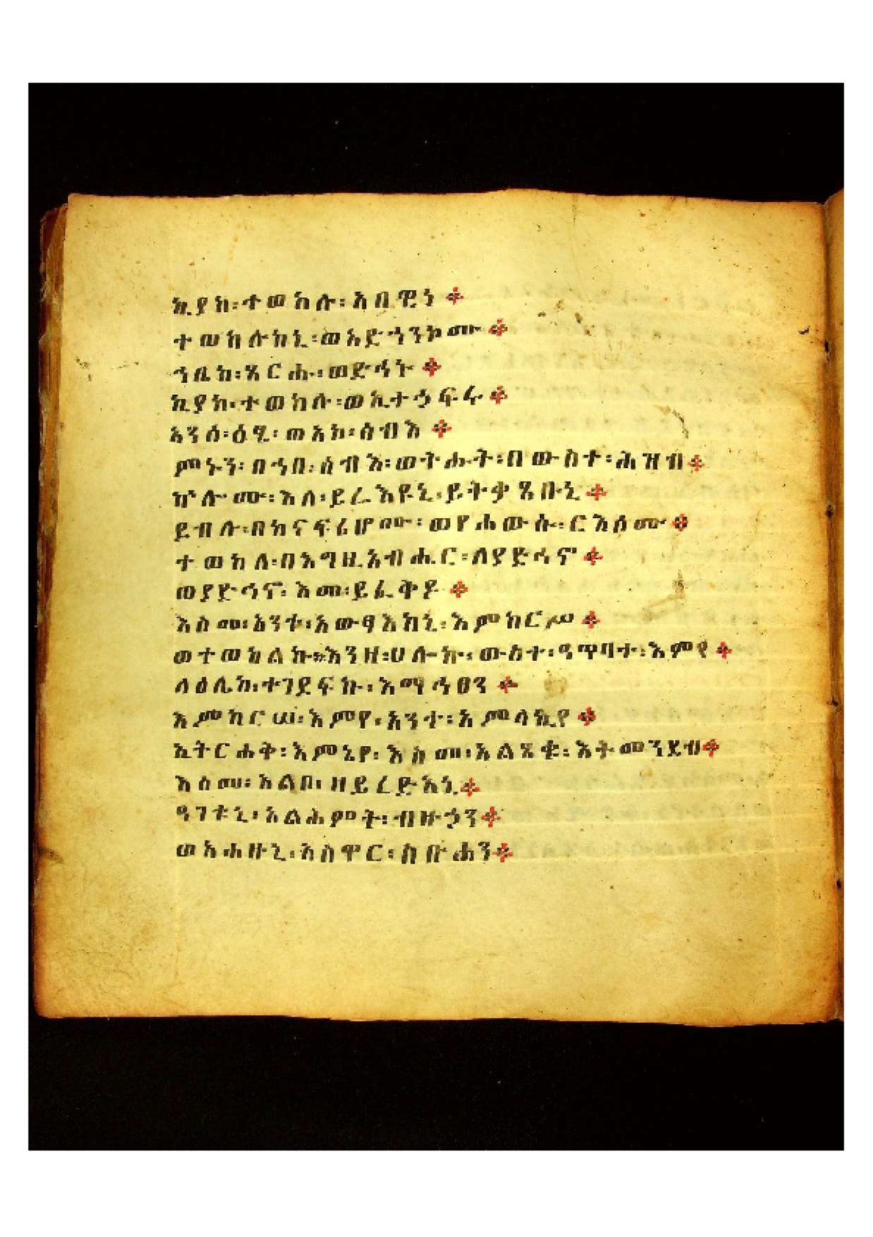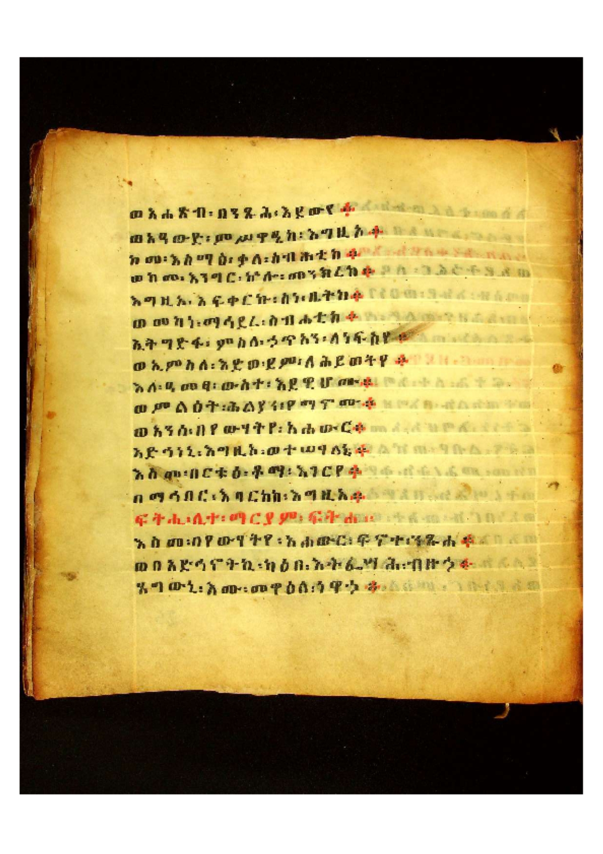 1. F. 2r: donation note written vertically in the outer margin, in black ink: “alla famiglia Bruschettini, Pussy […] Battaglia dell’Amba Aradam il 16 febbraio 1936 XIV”. The note, written in Italian and partly illegible, indicates the Bruschettini family as the receiver of the book and mentions the Battle of Amba Aradam, which took place on 16 February 1936. 2. F. 5r: note written in Italian in the outer upper margin, in red pencil: “Amba Aradam 16/2/XIV ore 17.30 P. Paloboni (?)”. This note also mentions the Battle of Amba Aradam, together with an individual whose name is partially unclear (P. Paloboni?). 3. F. 173v: supplication note written in small script in a mediocre hand, at the end of the “Psalms of David”: ዕቀበኒ፡ እምዓይነ፡ ደዌ፡ ወሞት፡ ለገብርከ፡ ደቅስዮስ፡, “protect me, your servant Däqsəyos, from the eye of infirmity and death”. The note mentions a certain Däqsəyos, indicated as “your servant” (possibly a later owner of the codex). 4. F. 173v: incipit of the Gəʿəz and Amharic prayer, perhaps a writing exercise. The note is written in an inaccurate calligraphy on the outer margin of the folio, next to the prayer. The entire text is የህፂ፡ ኖኅን፡ ከማየ[፡] አይኅ። እስራኤልን፡ ከፈርዖን፡ ዳዊትን፡ ከሳኦል፡ ከኢሎፍሊ። ኤ. 5. F. 190v: donation note, written in black ink in a mediocre hand. Text: ዝመጽሐፍ፡ ዘደብተራ፡ ኪሮስ፡ ዘወሀቦ፡ ለታቦተ፡ ሚካኤል፡ ኢትርስዑኒ፡ በአቡነ፡ ዘበሰማያት፡ ዘአቡየ፡ ገብረ፡ ማርያም፡ ወለእምየ፡ ወለተ፡ ሩፋኤል፡, “This book belongs to däbtära Kiros, who donated it to the tabot of [the church of St] Michael. Do not forget me for our Father who is in heaven. [It also belongs] to my father Gäbrä Maryam and my mother Wälättä Rufaʾel”. 6. F. 199v: writings executed in an inaccurate hand, perhaps the same of note 4. The note includes pen trials (ፈቲነ፡ ብርዕ፡ ዘፈረና፡ etc.), reproduces the explicit of the “Song of the songs” (ስብሐታተኪ፡ ማርያም፡ ከመ፡ እንተ፡ ሕልቀት፡ etc.) and the incipit of the “Praise of Mary” (ውዳሴ፡ ዘሰኑይ፡ ፈቀደ፡ እግዚእ፡ etc., partly rubricated). The writings also mention Däqsəyos, indicated as “your servant” (possibly a later owner of the codex) 7. F. 220ra–va: Genealogic note written on two columns. The note illustrates the family tree of King Yoḥannǝs I, who reigned from 1667 to 1682. The text is acephalous. Incipit: [ወለ]ደ፡ እምሐና፡ ብእሲቱ፡ አሦተ፡ ቅዱሳንሃ፡ ወአሦተ፡ ቅዱሳንኒ፡ እምነ፡ ጳውሊ፡ ብእሲሃ፡ ወለደቶሙ፡ ለአቤተኁን፡ ማእምሮ፡ ወለዘሥላሴ፡ ወአቤተኁን፡ ማእምሮኒ፡ ወለደ፡ አቃርዮስ፡ ወአቃርዮስኒ፡ ወለደ፡ እመቤት፡ እኅተ፡ ክርስቶስሃ፡. The text is published and translated in Proverbio D.V., 2000, ‘Inventario sommario dei manoscritti arabi, ebraici, etiopici – con notizia dei turchi – conservati presso la Biblioteca della Badia di Grottaferrata’. Atti della Accademia nazionale dei Lincei, Memorie, Classe di scienze morali, storiche e filologiche, serie IX, 12 (2000), 468–570 (here pp. 496–97, Appendice III). 8. F. 220va–b: Protective prayer against snakes, written on two columns. Incipit: በስመ፡ አብ፡ … ጸሎት፡ በእንተ፡ ዓርዌ፡ ምድር። ሶበ፡ በጽሐ፡ መልእክት፡ ሐሰውከ፡ በል፡ ፫ጊዜ፡ አኂዘከ፡ ዘፈረ፡ ልብሰ፡ ለእመ፡ ሀሎ፡ ርሑቀ፡ አስትዮ፡. The prayer is probably written in the same hand of note 7. 9. F. 220vb: Unidentified magic prayer containing asmat-names. Incipit: በስመ፡ አብ፡ … ኦላዘላህም፡ አህጉረ፡ ቀዳ[.]፡ ፍሖም፡ ሊስ፡ አፍሊስ፡ ምልክዮስ፡ ዘ[..]ማኤል፡ በዝንቱ፡ አስማቲከ፡ [.]ጽ[..] ኃይለ፡ በረድ፡ ወነፋስ፡ ከማሁ፡. |