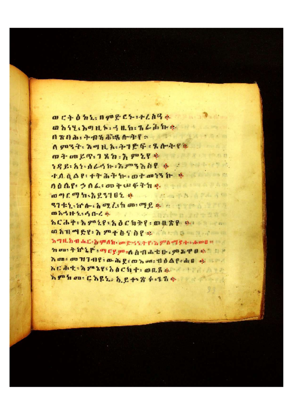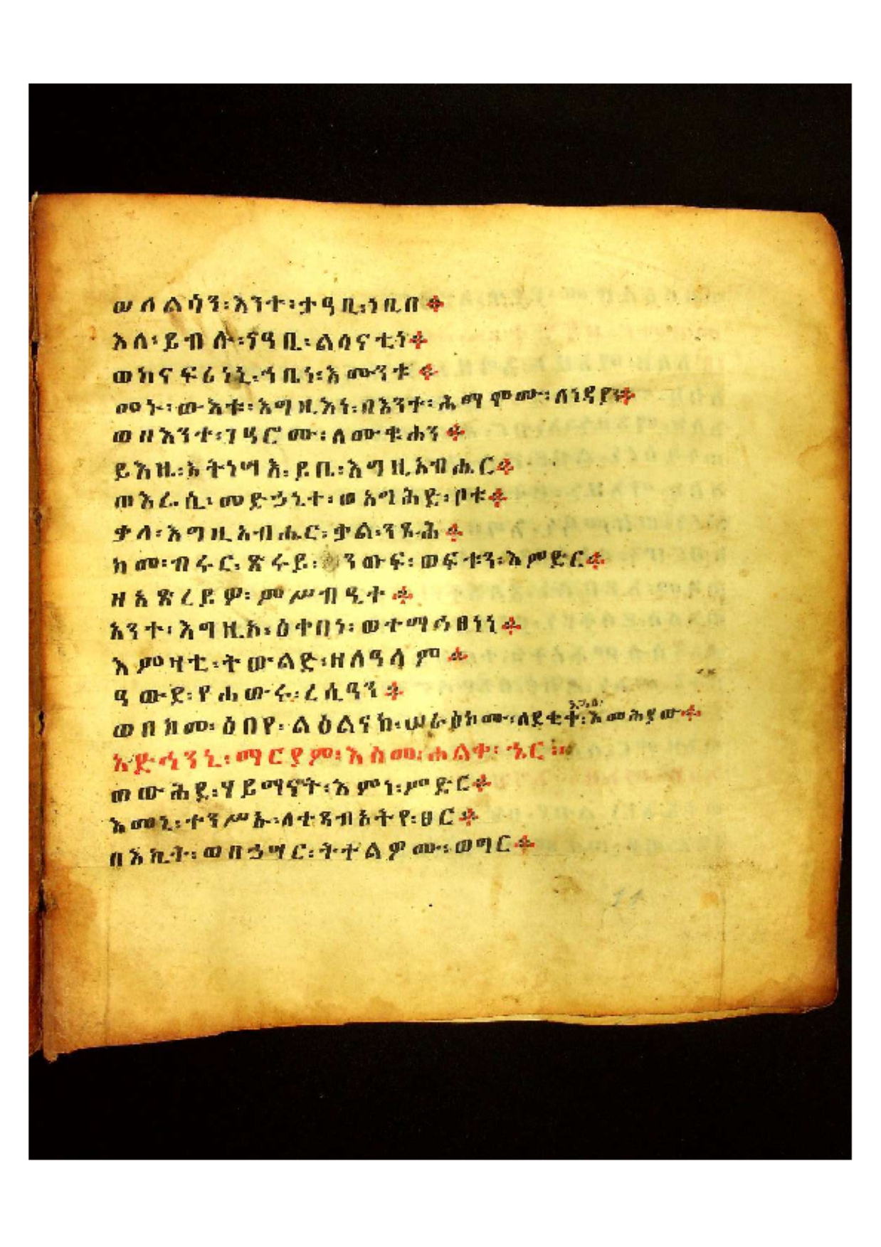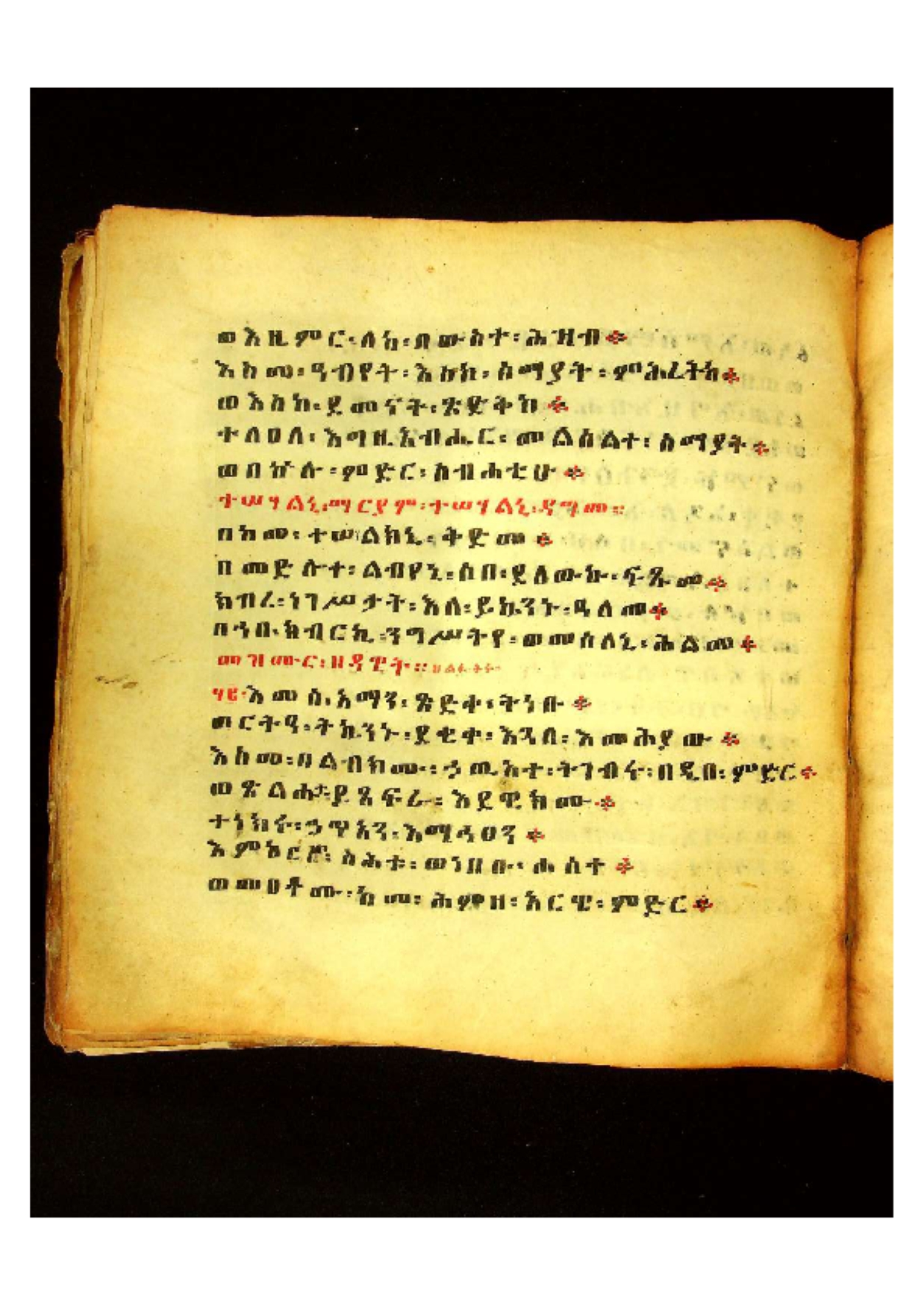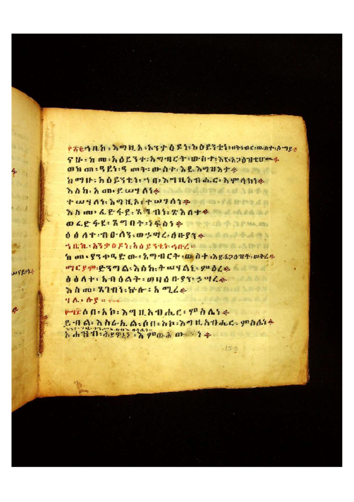 1. F. 2r: donation note written vertically in the outer margin, in black ink: “alla famiglia Bruschettini, Pussy […] Battaglia dell’Amba Aradam il 16 febbraio 1936 XIV”. The note, written in Italian and partly illegible, indicates the Bruschettini family as the receiver of the book and mentions the Battle of Amba Aradam, which took place on 16 February 1936. 2. F. 5r: note written in Italian in the outer upper margin, in red pencil: “Amba Aradam 16/2/XIV ore 17.30 P. Paloboni (?)”. This note also mentions the Battle of Amba Aradam, together with an individual whose name is partially unclear (P. Paloboni?). 3. F. 173v: supplication note written in small script in a mediocre hand, at the end of the “Psalms of David”: ዕቀበኒ፡ እምዓይነ፡ ደዌ፡ ወሞት፡ ለገብርከ፡ ደቅስዮስ፡, “protect me, your servant Däqsəyos, from the eye of infirmity and death”. The note mentions a certain Däqsəyos, indicated as “your servant” (possibly a later owner of the codex). 4. F. 173v: incipit of the Gəʿəz and Amharic prayer, perhaps a writing exercise. The note is written in an inaccurate calligraphy on the outer margin of the folio, next to the prayer. The entire text is የህፂ፡ ኖኅን፡ ከማየ[፡] አይኅ። እስራኤልን፡ ከፈርዖን፡ ዳዊትን፡ ከሳኦል፡ ከኢሎፍሊ። ኤ. 5. F. 190v: donation note, written in black ink in a mediocre hand. Text: ዝመጽሐፍ፡ ዘደብተራ፡ ኪሮስ፡ ዘወሀቦ፡ ለታቦተ፡ ሚካኤል፡ ኢትርስዑኒ፡ በአቡነ፡ ዘበሰማያት፡ ዘአቡየ፡ ገብረ፡ ማርያም፡ ወለእምየ፡ ወለተ፡ ሩፋኤል፡, “This book belongs to däbtära Kiros, who donated it to the tabot of [the church of St] Michael. Do not forget me for our Father who is in heaven. [It also belongs] to my father Gäbrä Maryam and my mother Wälättä Rufaʾel”. 6. F. 199v: writings executed in an inaccurate hand, perhaps the same of note 4. The note includes pen trials (ፈቲነ፡ ብርዕ፡ ዘፈረና፡ etc.), reproduces the explicit of the “Song of the songs” (ስብሐታተኪ፡ ማርያም፡ ከመ፡ እንተ፡ ሕልቀት፡ etc.) and the incipit of the “Praise of Mary” (ውዳሴ፡ ዘሰኑይ፡ ፈቀደ፡ እግዚእ፡ etc., partly rubricated). The writings also mention Däqsəyos, indicated as “your servant” (possibly a later owner of the codex) 7. F. 220ra–va: Genealogic note written on two columns. The note illustrates the family tree of King Yoḥannǝs I, who reigned from 1667 to 1682. The text is acephalous. Incipit: [ወለ]ደ፡ እምሐና፡ ብእሲቱ፡ አሦተ፡ ቅዱሳንሃ፡ ወአሦተ፡ ቅዱሳንኒ፡ እምነ፡ ጳውሊ፡ ብእሲሃ፡ ወለደቶሙ፡ ለአቤተኁን፡ ማእምሮ፡ ወለዘሥላሴ፡ ወአቤተኁን፡ ማእምሮኒ፡ ወለደ፡ አቃርዮስ፡ ወአቃርዮስኒ፡ ወለደ፡ እመቤት፡ እኅተ፡ ክርስቶስሃ፡. The text is published and translated in Proverbio D.V., 2000, ‘Inventario sommario dei manoscritti arabi, ebraici, etiopici – con notizia dei turchi – conservati presso la Biblioteca della Badia di Grottaferrata’. Atti della Accademia nazionale dei Lincei, Memorie, Classe di scienze morali, storiche e filologiche, serie IX, 12 (2000), 468–570 (here pp. 496–97, Appendice III). 8. F. 220va–b: Protective prayer against snakes, written on two columns. Incipit: በስመ፡ አብ፡ … ጸሎት፡ በእንተ፡ ዓርዌ፡ ምድር። ሶበ፡ በጽሐ፡ መልእክት፡ ሐሰውከ፡ በል፡ ፫ጊዜ፡ አኂዘከ፡ ዘፈረ፡ ልብሰ፡ ለእመ፡ ሀሎ፡ ርሑቀ፡ አስትዮ፡. The prayer is probably written in the same hand of note 7. 9. F. 220vb: Unidentified magic prayer containing asmat-names. Incipit: በስመ፡ አብ፡ … ኦላዘላህም፡ አህጉረ፡ ቀዳ[.]፡ ፍሖም፡ ሊስ፡ አፍሊስ፡ ምልክዮስ፡ ዘ[..]ማኤል፡ በዝንቱ፡ አስማቲከ፡ [.]ጽ[..] ኃይለ፡ በረድ፡ ወነፋስ፡ ከማሁ፡. |